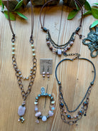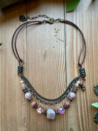 Rich in texture and soft blush tones, this handcrafted necklace from Lu’s Moon Blush jewelry collection blends romantic color with artisan detail. Featuring a striking mix of pink moonstone, pink sandstone, and pink agate beads, this layered design is accented with antique-style chains and warm metal finishes. A beautiful statement piece that adds depth and elegance to everyday looks or special occasions.