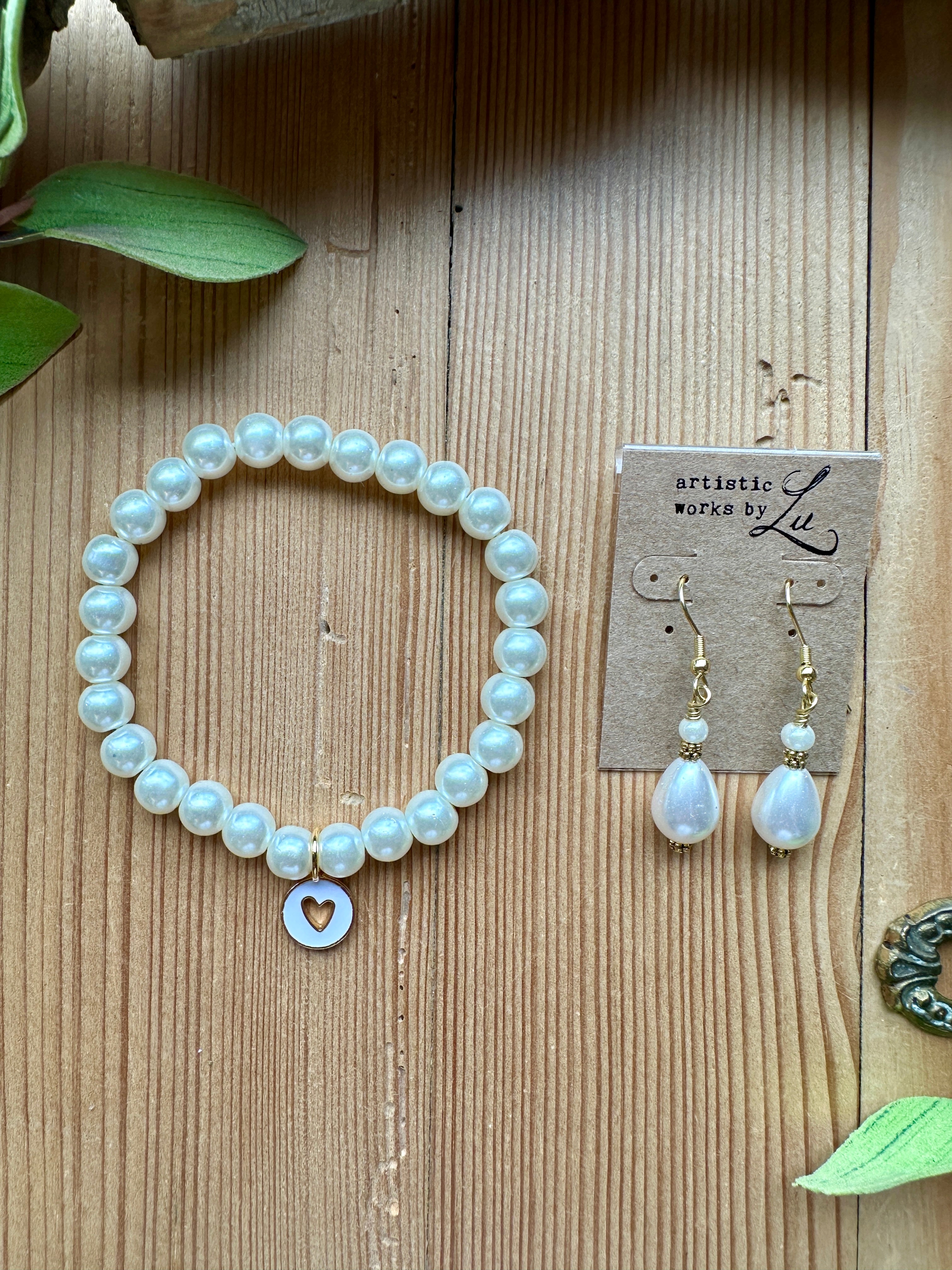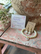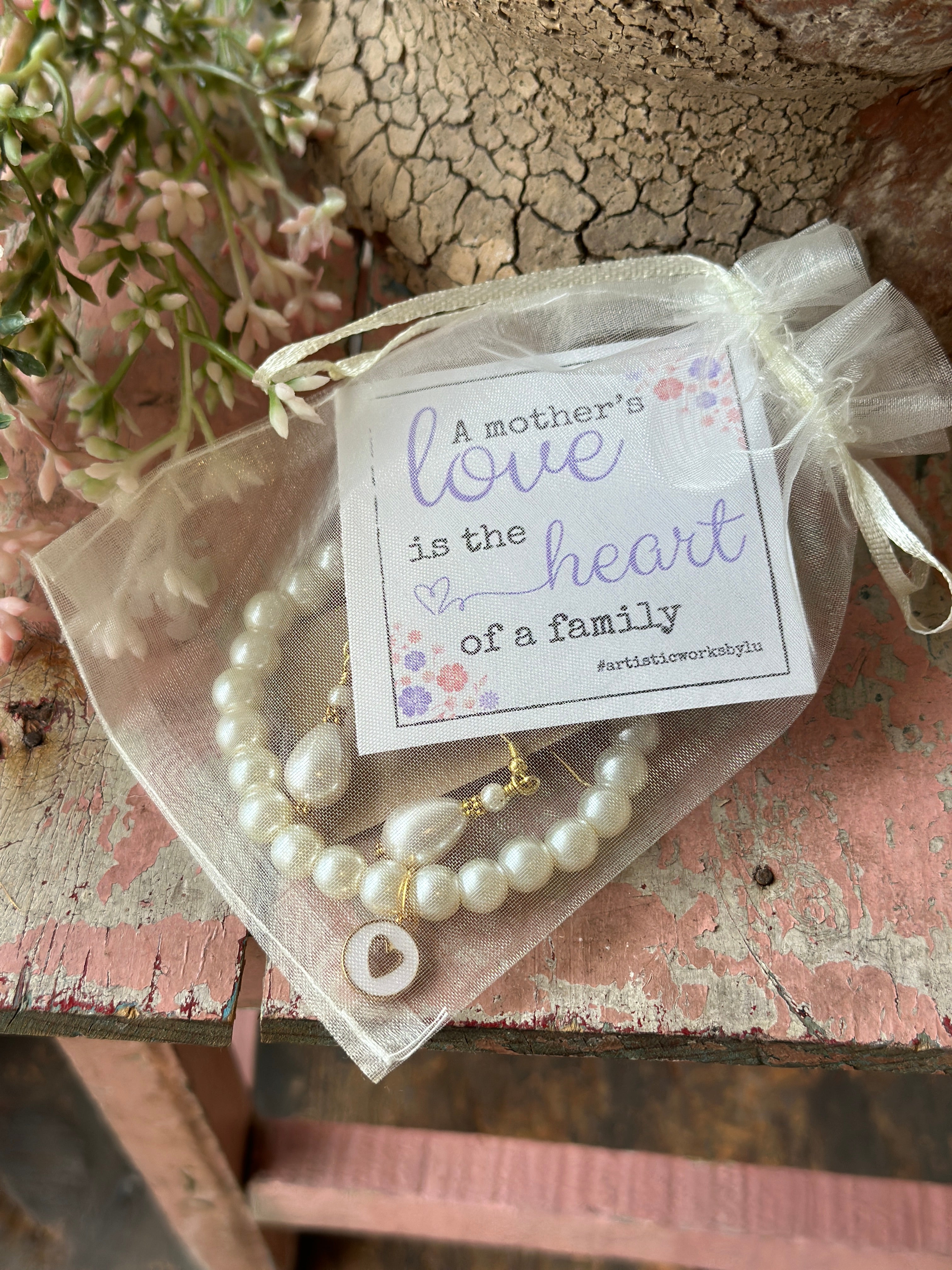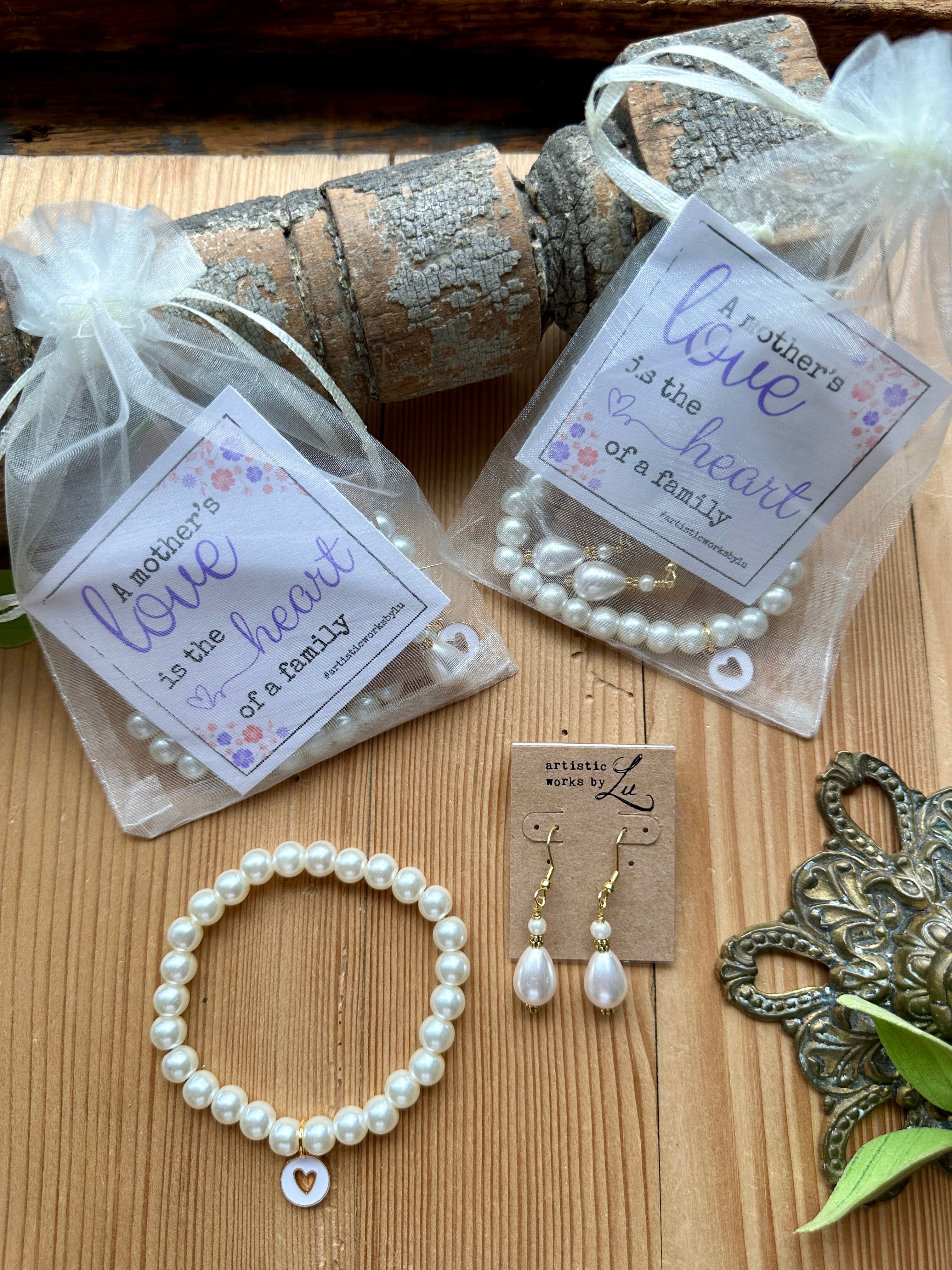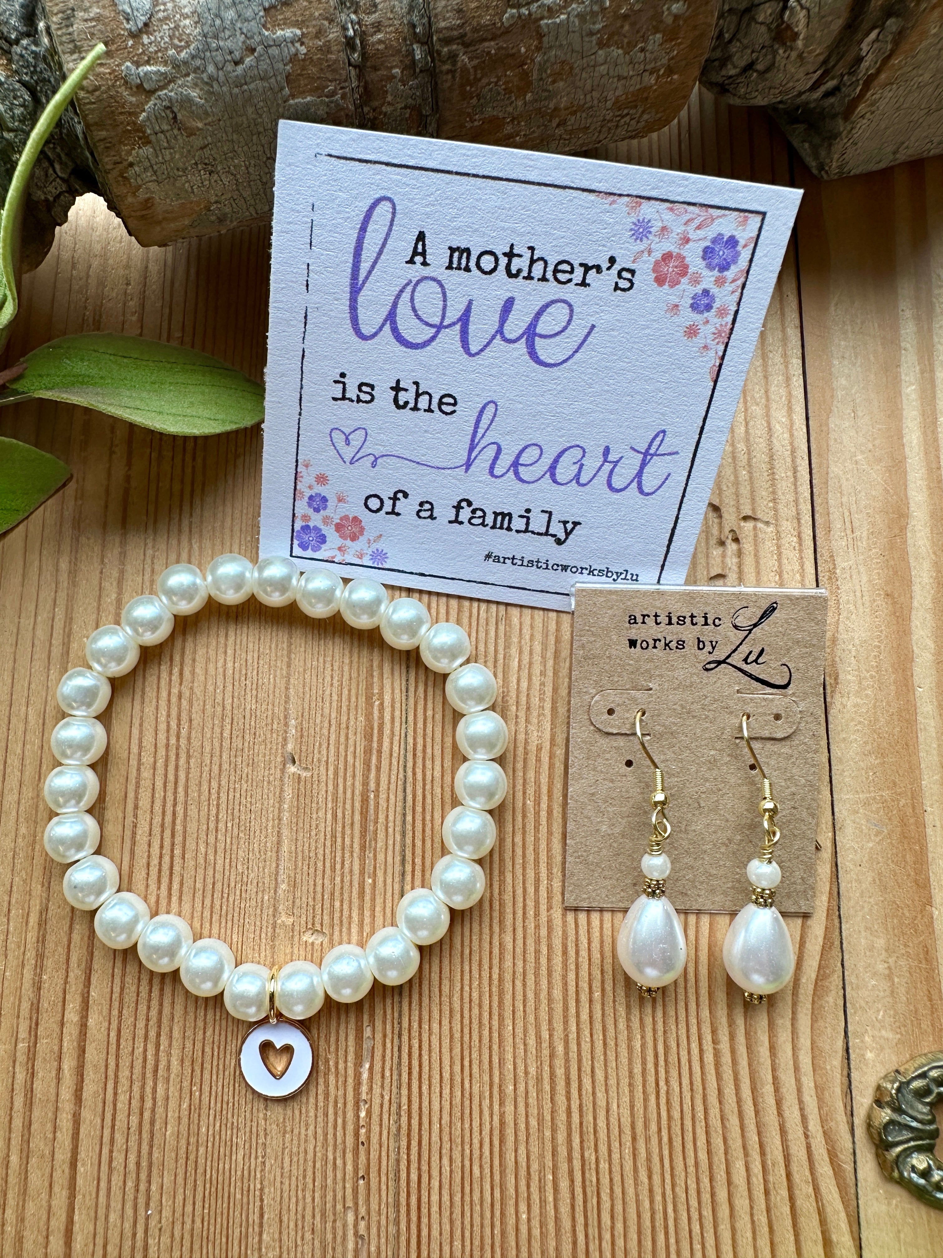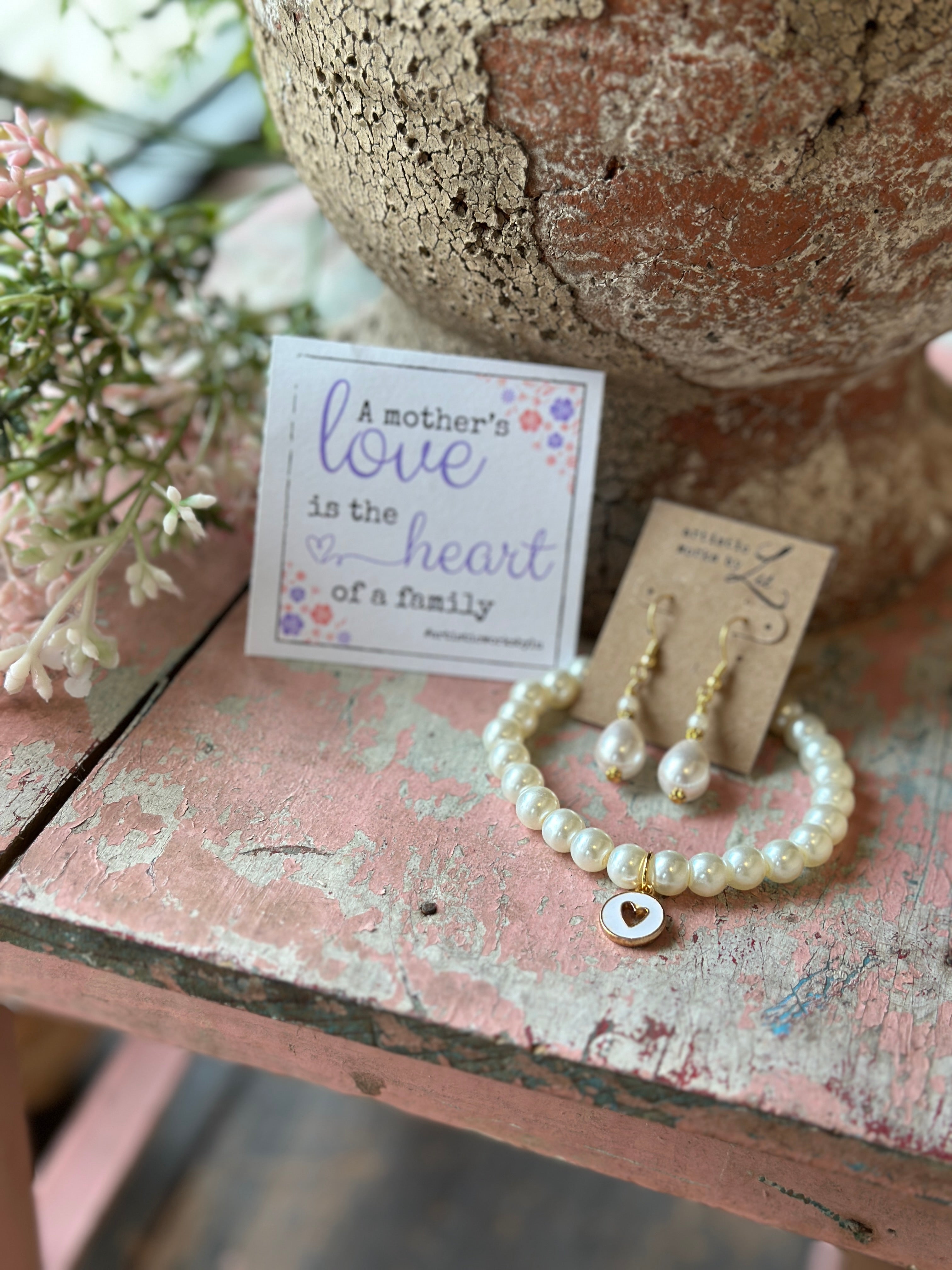 This Mother's Day Gift Set includes a pearl-inspired stretchy bracelet with an enamel-coated heart charm. The accompanying earrings feature a teardrop-shaped pearl-inspired bead with small round pearls and bright gold accents. Treat your mother to a beautiful accessory set that will add a touch of elegance to any outfit.