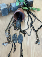Oval metal cross pendant. The cross metal pendant measures 2 inches in length and is accented with black leather with metal beads so the total length is approximately 4 inches. Lobster is attached so you can attach it to any Lu necklace or chain.