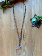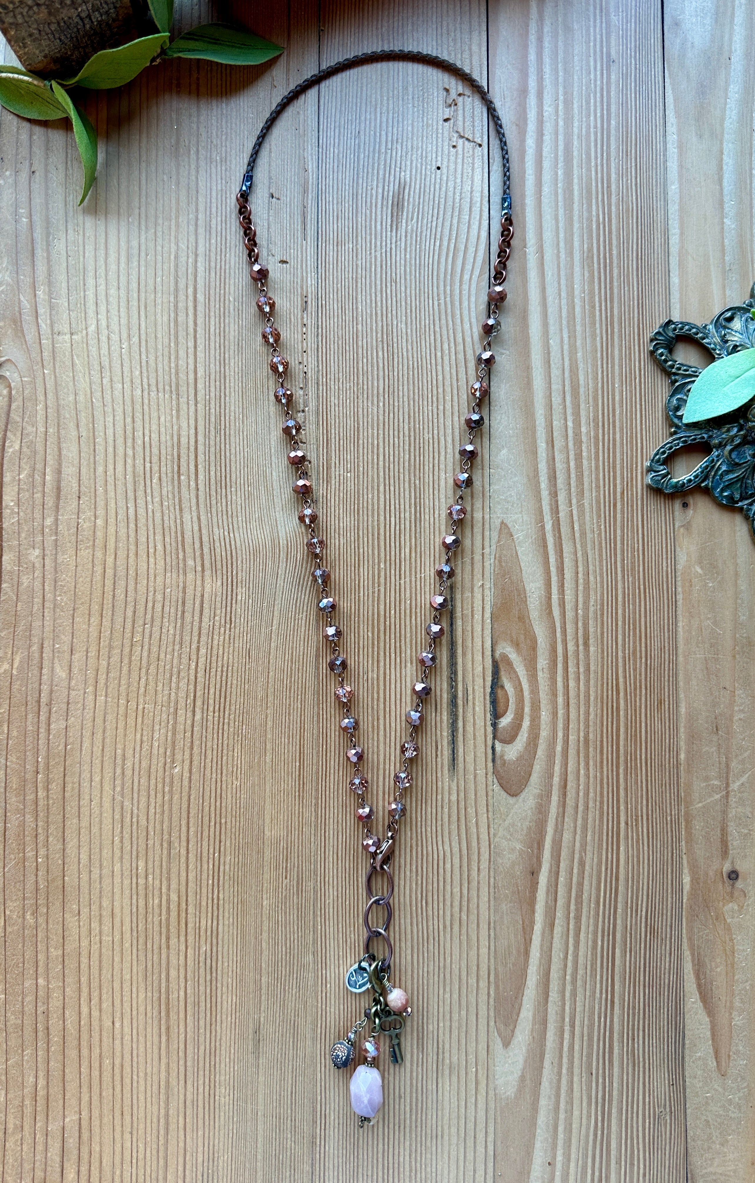 This Pale Dogwood Interchangeable Necklace features a beautiful combination of peachy pink faceted beads with an aurora borealis effect, finished with braided brown leather and copper chain. The versatile design allows for interchangeable styling, providing endless opportunities to elevate your outfit.