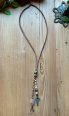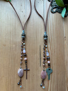 Add a touch of elegance to your outfit with our Pale Dogwood Long Necklace. The asymmetrical design of this handmade necklace features a pendant with a variety of pink and brown beads, including a pale pink agate and your choice of a vintage key or copper cross. The necklace is completed with tan leather and mixed metal cincher beads.