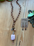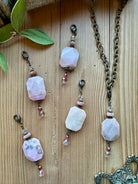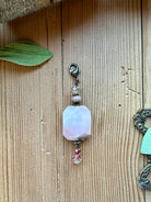 Introducing our Pink Opal Pendant! This unique pendant features a large marbled pink opal stone, accented with a smaller peachy pink faceted bead, a small pink agate bead and a shimmering champagne crystal bead. Add a touch of quirky elegance to any outfit with this one-of-a-kind piece.