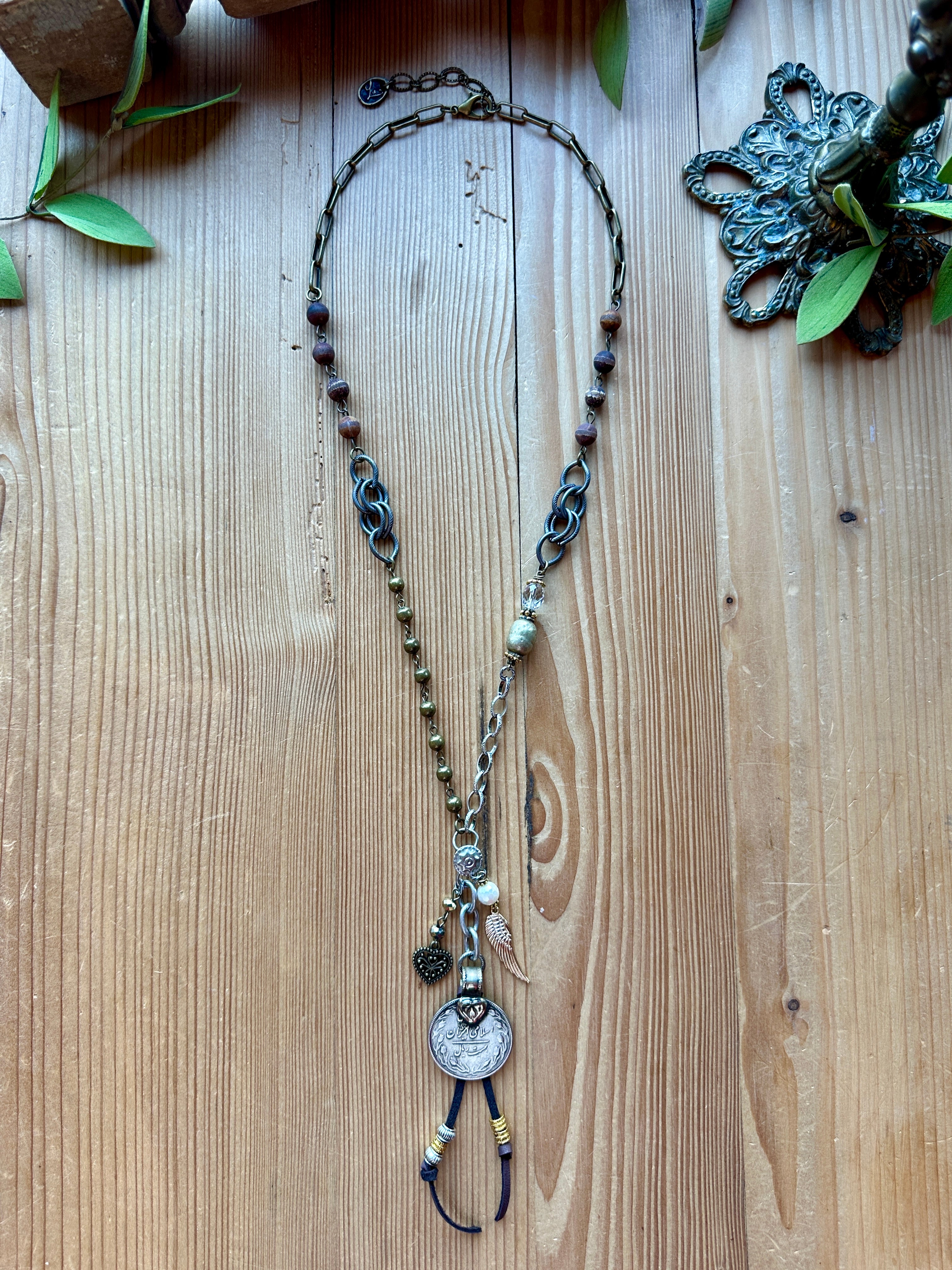 This one-of-a-kind necklace features an authentic coin from Afghanistan, making it a truly meaningful statement piece with global charm. Designed with mixed-metal details, earthy bead accents, and a layered pendant dangle, this necklace adds texture, movement, and story to any outfit—perfect for everyday wear or a special gift.