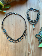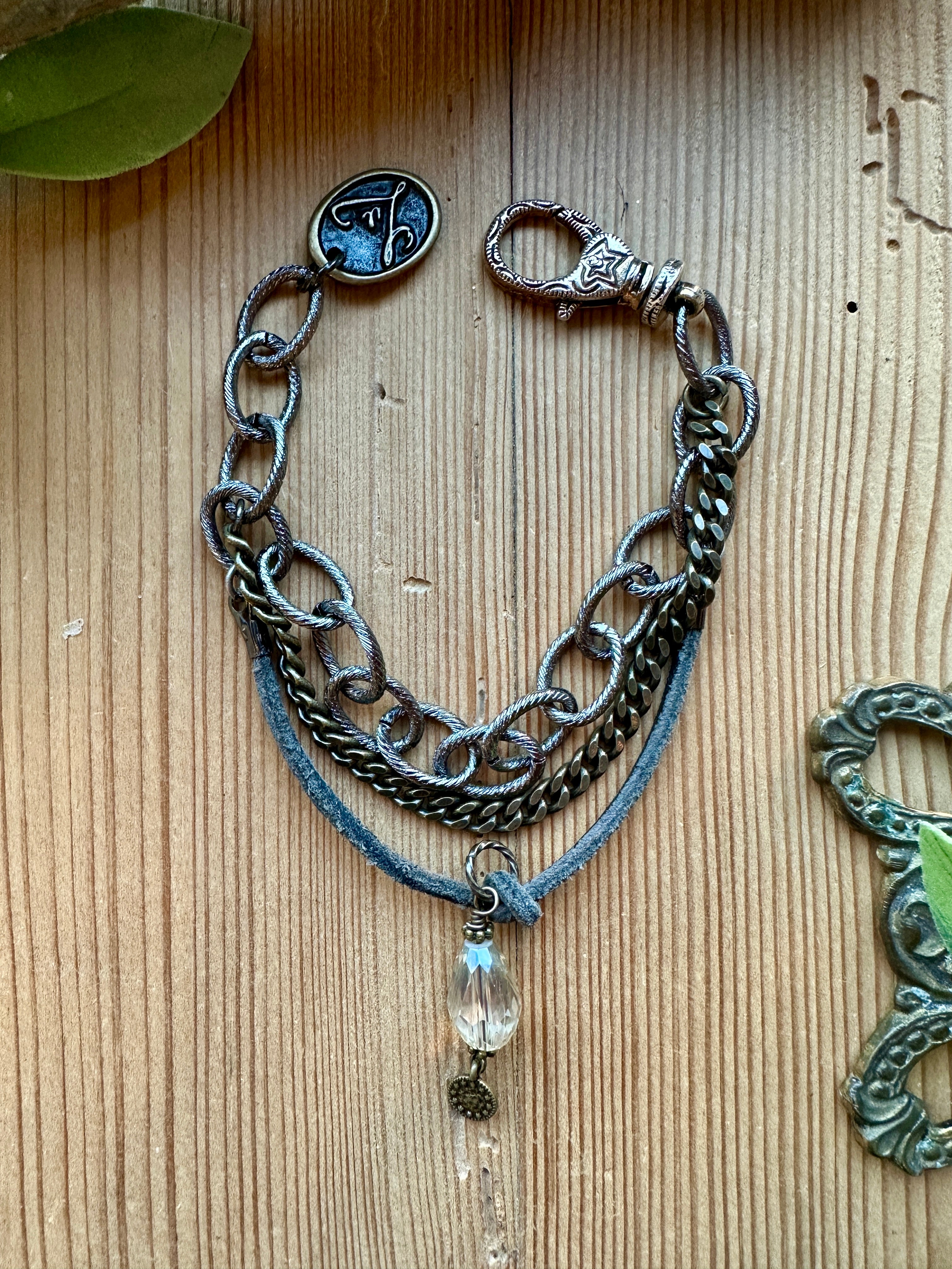 This Urban Metal Triple Bracelet features three layers of gunmetal silver and brass chain, paired with gray leather and a stunning champagne crystal drop. With a unique and modern design, this bracelet is the perfect accessory for any occasion. Add a touch of elegance and edge to your look with this must-have piece.