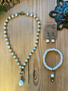 The Winter Wonderland Gift Set is perfect for adding a touch of elegant charm to any outfit. Featuring a short necklace with a champagne crystal and pearl drop, a stretchy bracelet, and freshwater pearl and champagne crystal earrings, this set is sure to make a statement. Elevate your style with this exquisite set today.