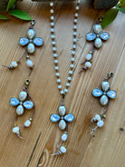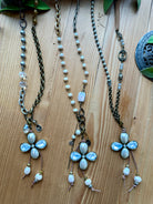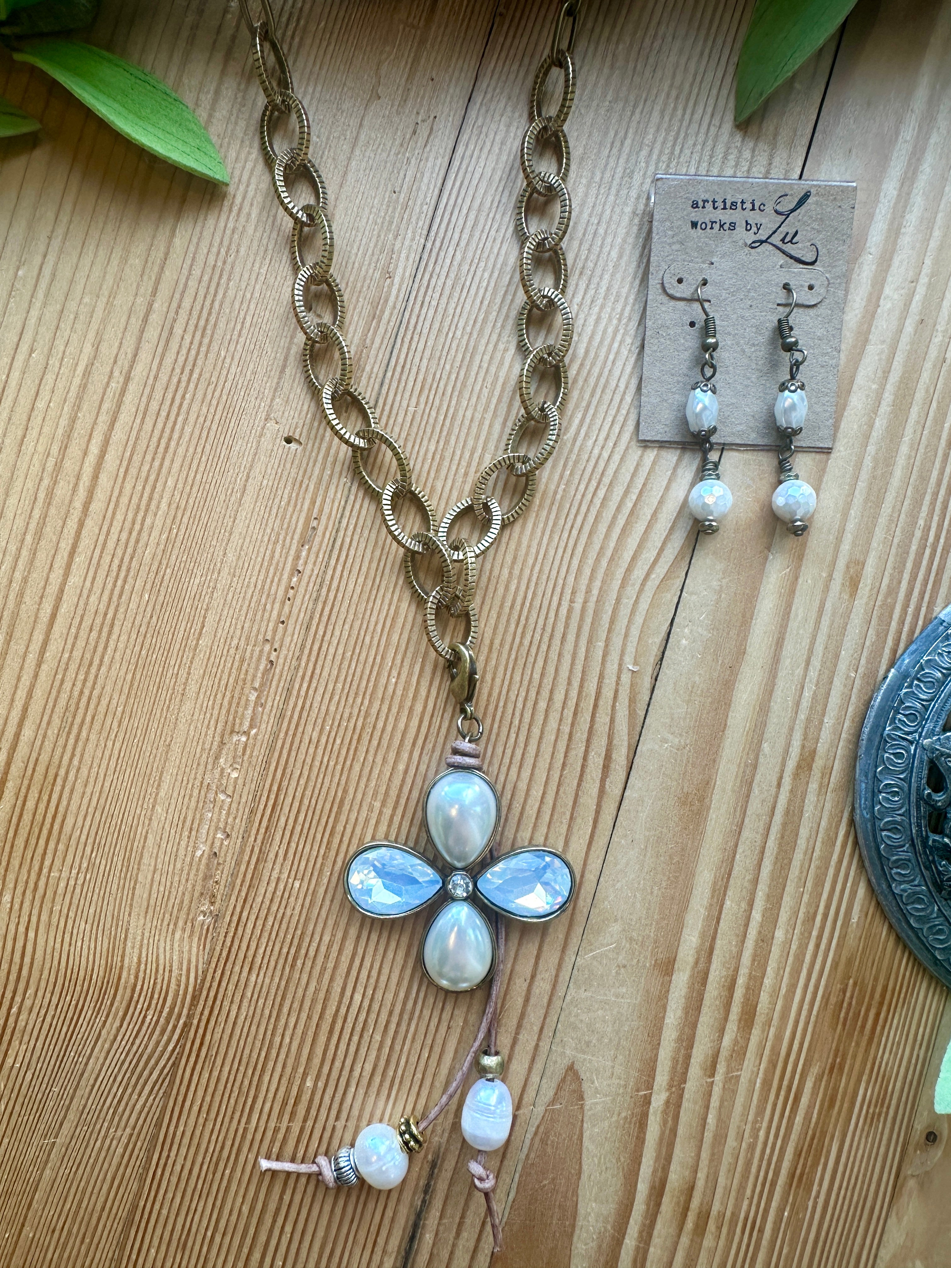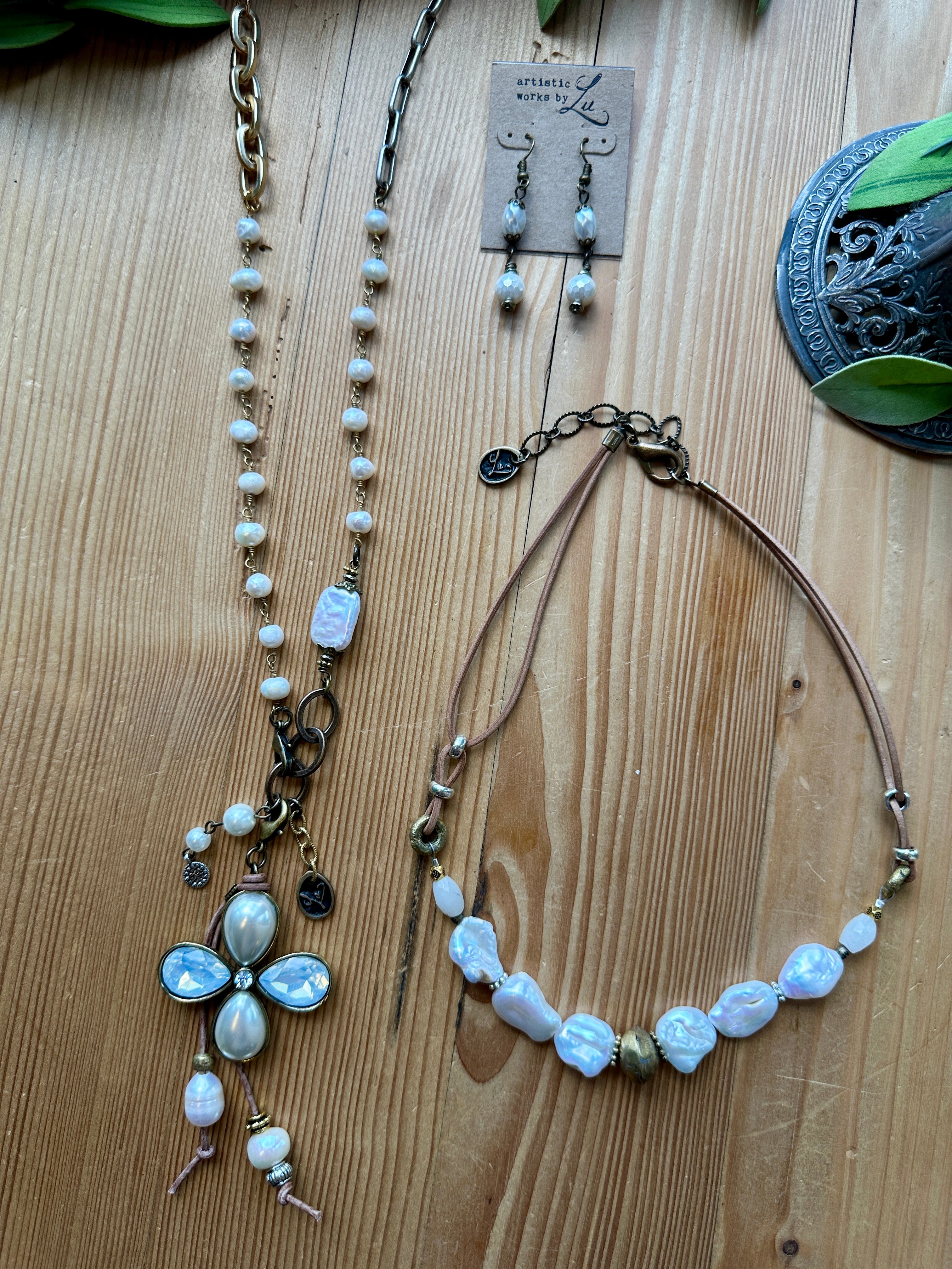 Elegant with a soft, luminous glow, this statement pendant from Lu’s Gypsy Pearl jewelry collection features a beautifully detailed flower design accented with pearlized stones and faceted crystal details. Finished with leather and bead accents, it brings a graceful, feminine touch to any necklace.