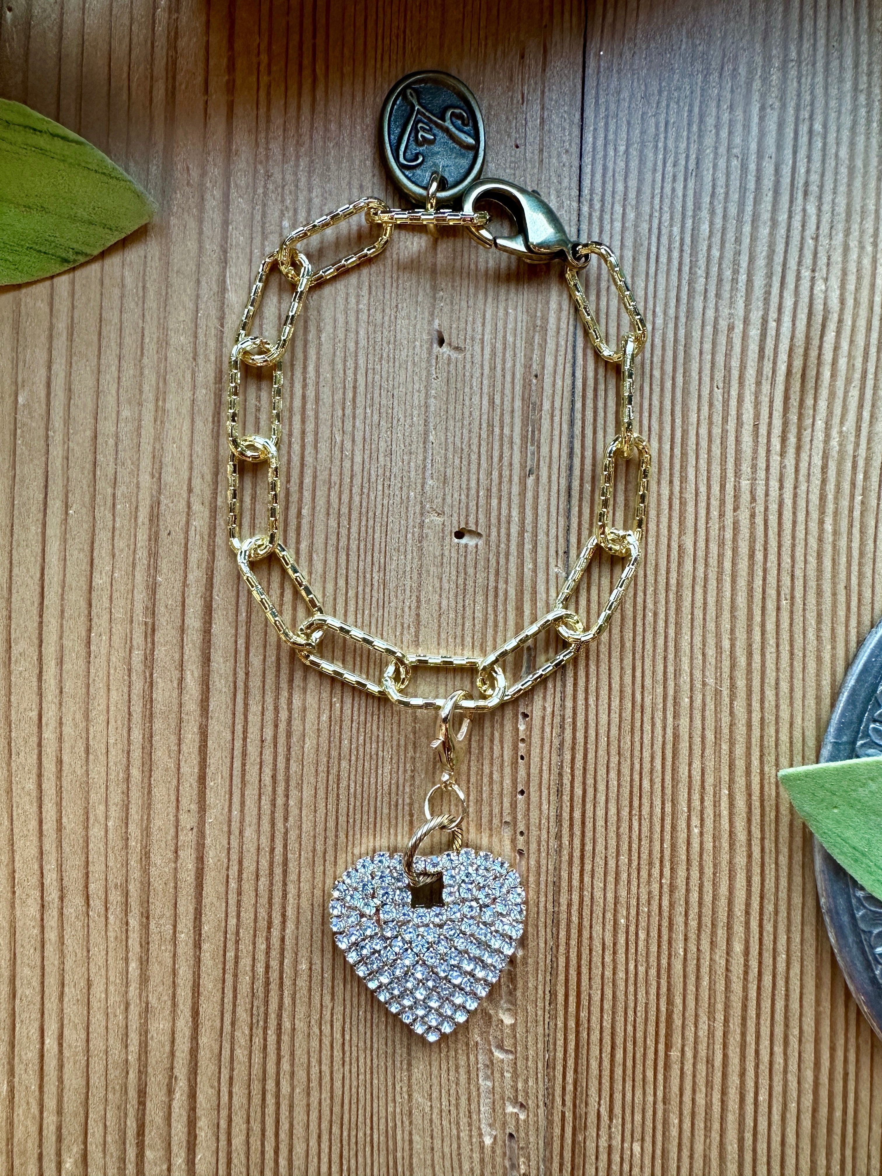 Add timeless sparkle with this rhinestone heart charm pendant, featuring shimmering crystal detailing in a classic heart shape. Finished with a lobster clasp, it easily attaches to a necklace or bracelet for a custom, layered look.