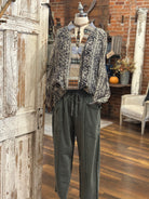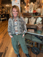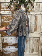 Make a statement in our Aztec Print Blouse — a stunning mix of earthy tones, bold patterns, and effortless boutique style. Featuring an intricate tribal-inspired print in shades of black, cream, tan, and blue, this top is perfect for adding an artistic edge to your everyday look. The relaxed silhouette, button-front design, and soft, flowy fabric create that easy, free-spirited vibe Artistic Works by Lu is known for.