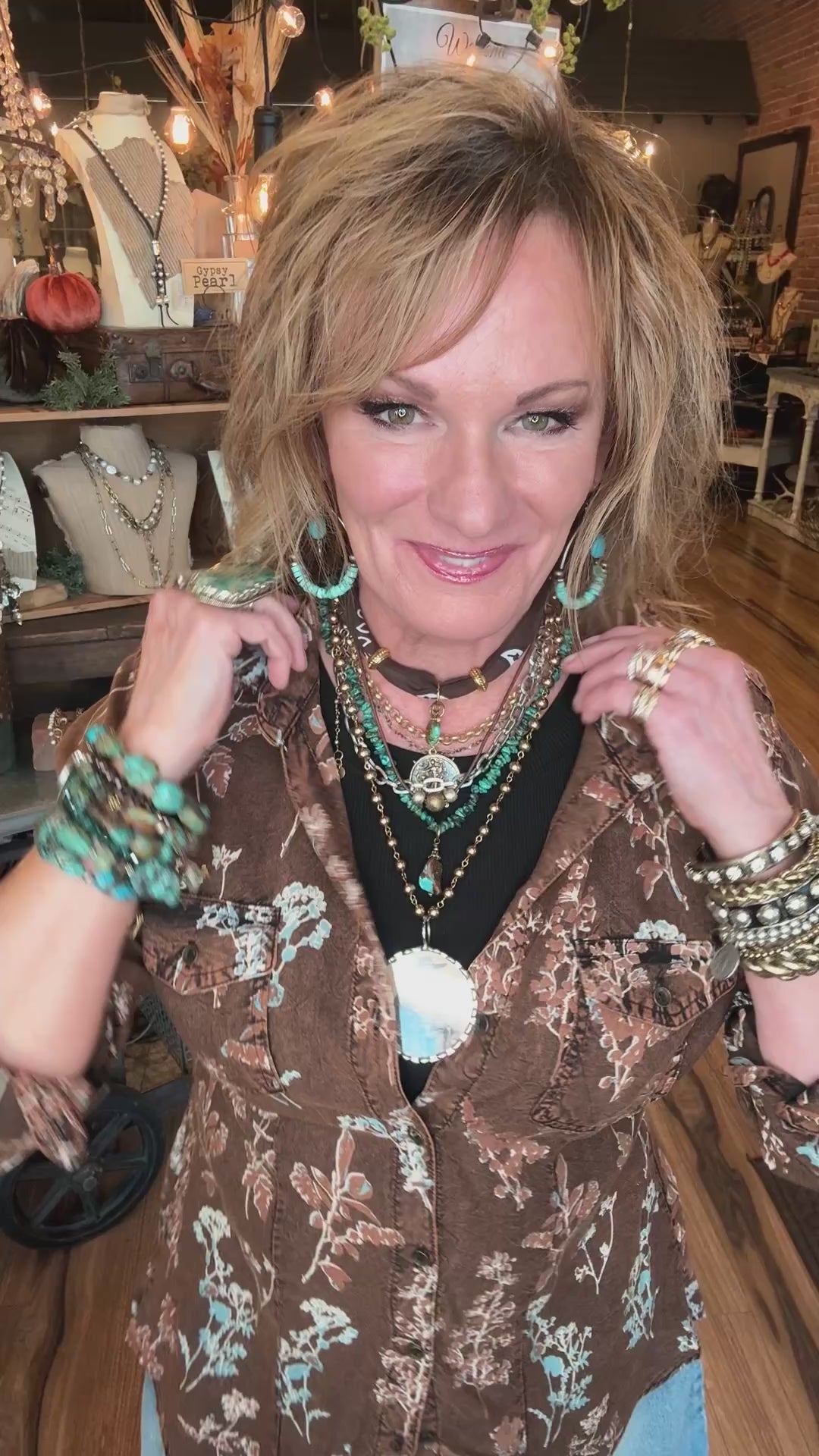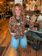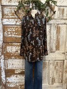 Romantic and versatile, this floral button-down is a must-have for fall. The earthy brown base with blue + rust florals makes it easy to style with denim or layered under a vest or jacket.