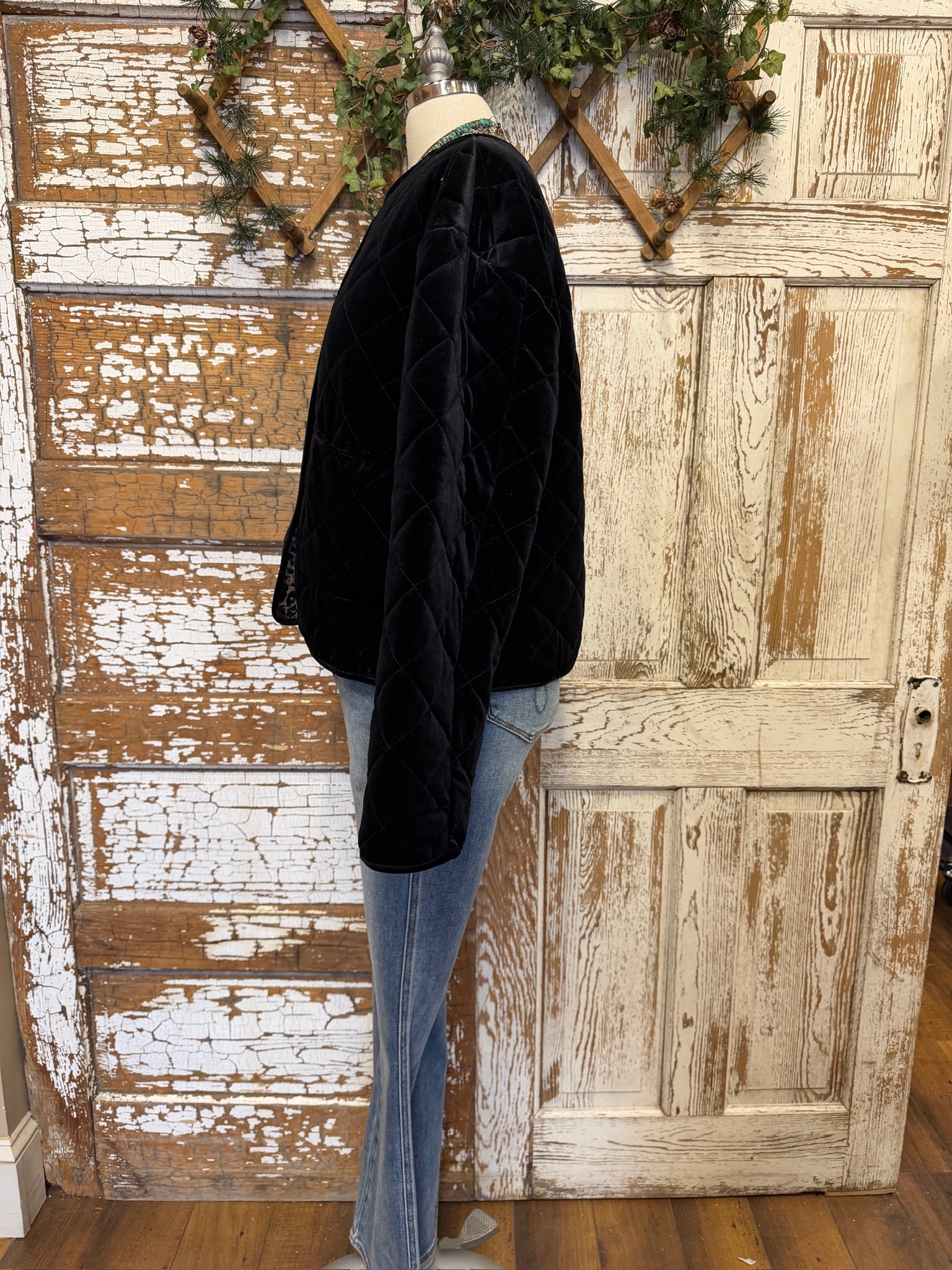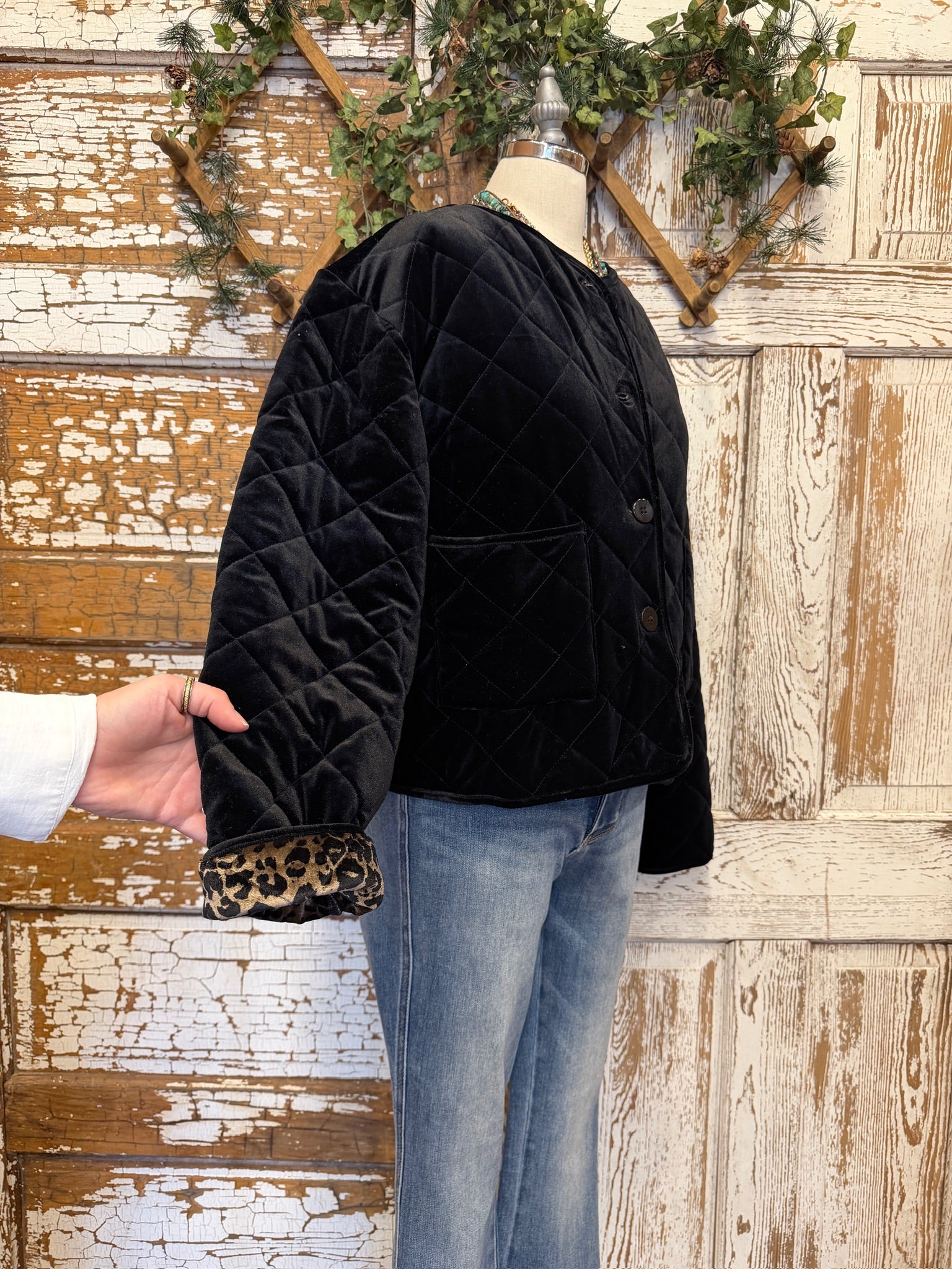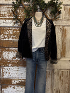 Elevate your layering with this soft velvet jacket featuring bold leopard lining and cuff detail. A luxe, cozy statement piece that pairs effortlessly with denim and basic tees.