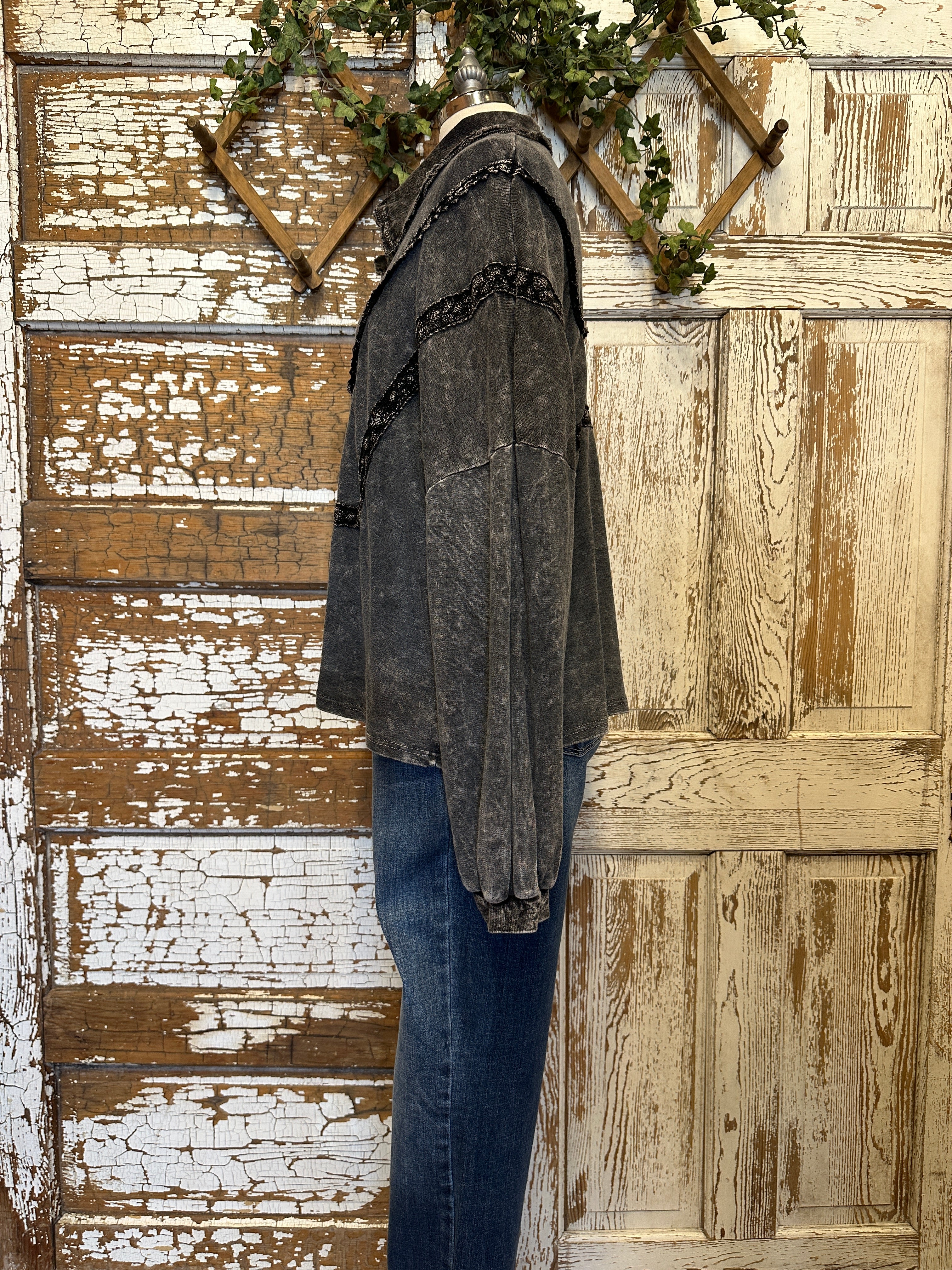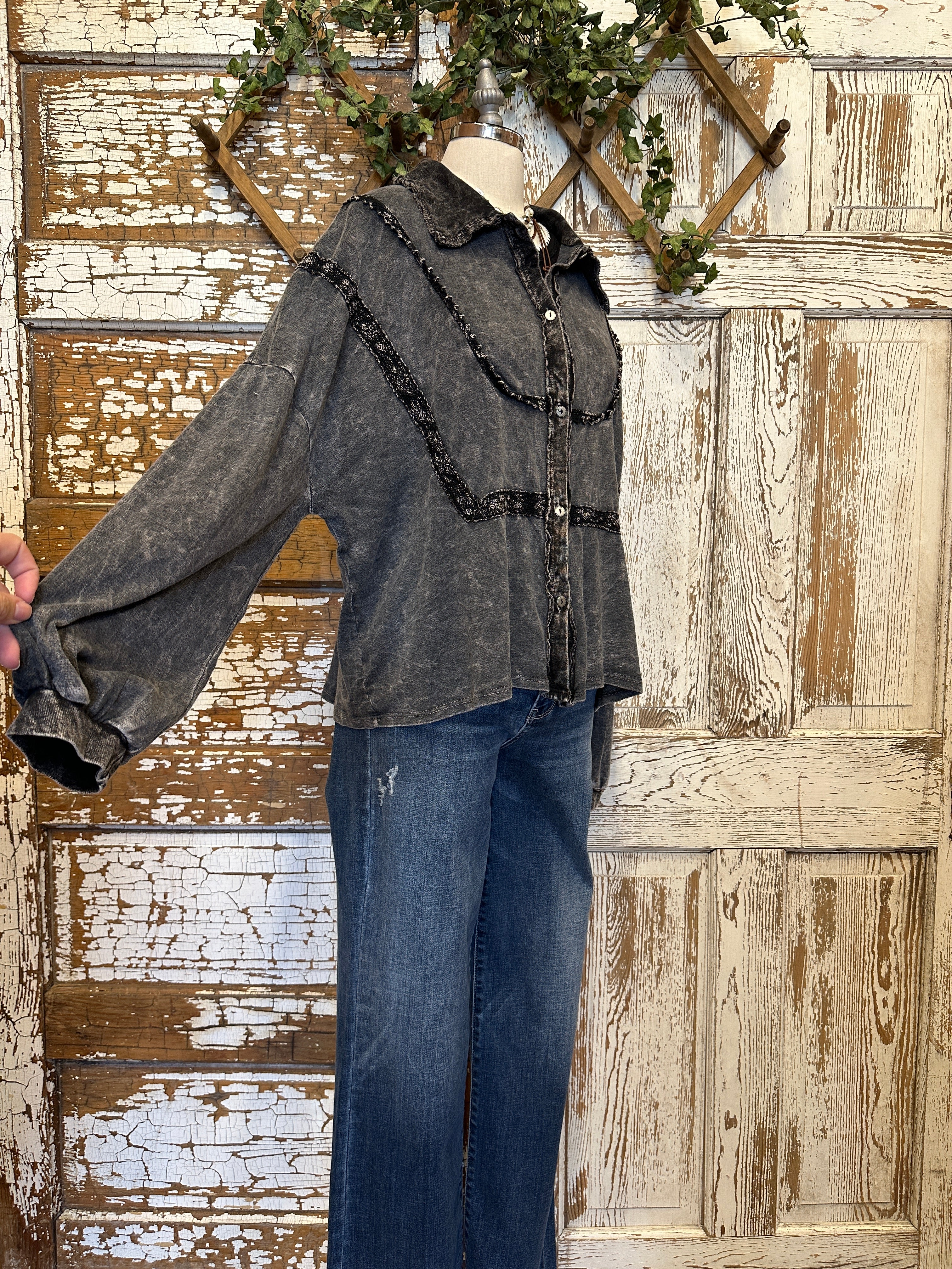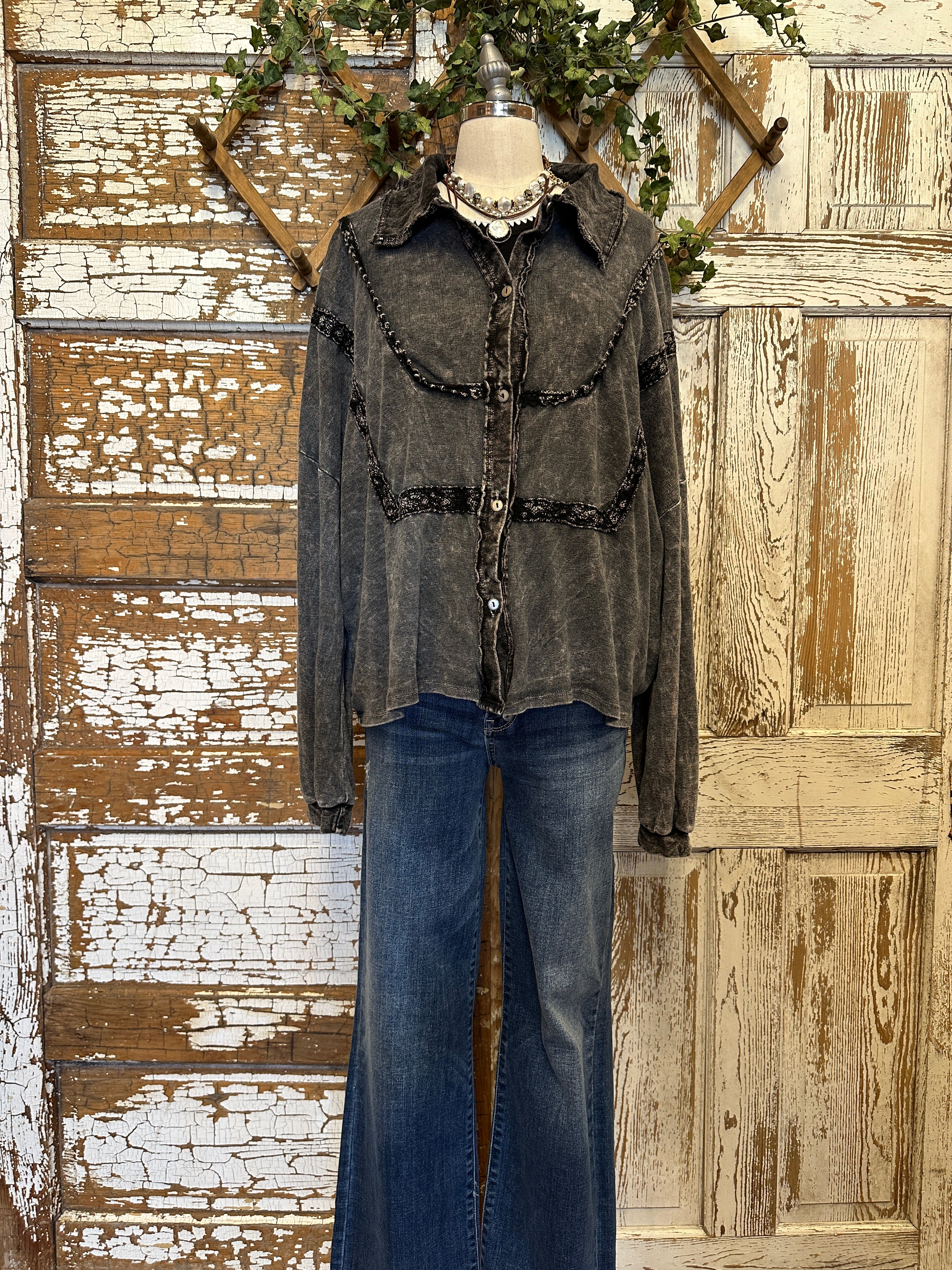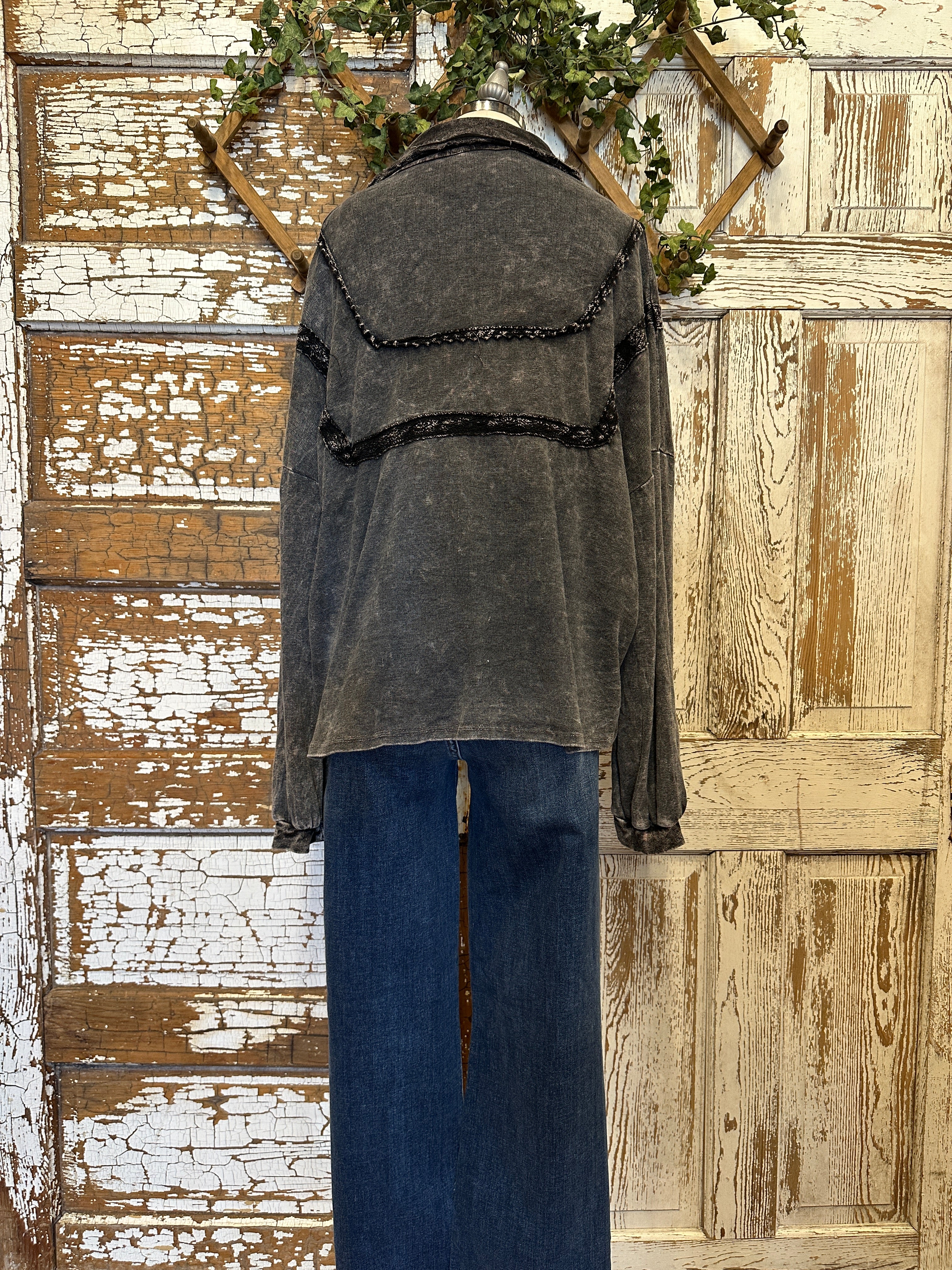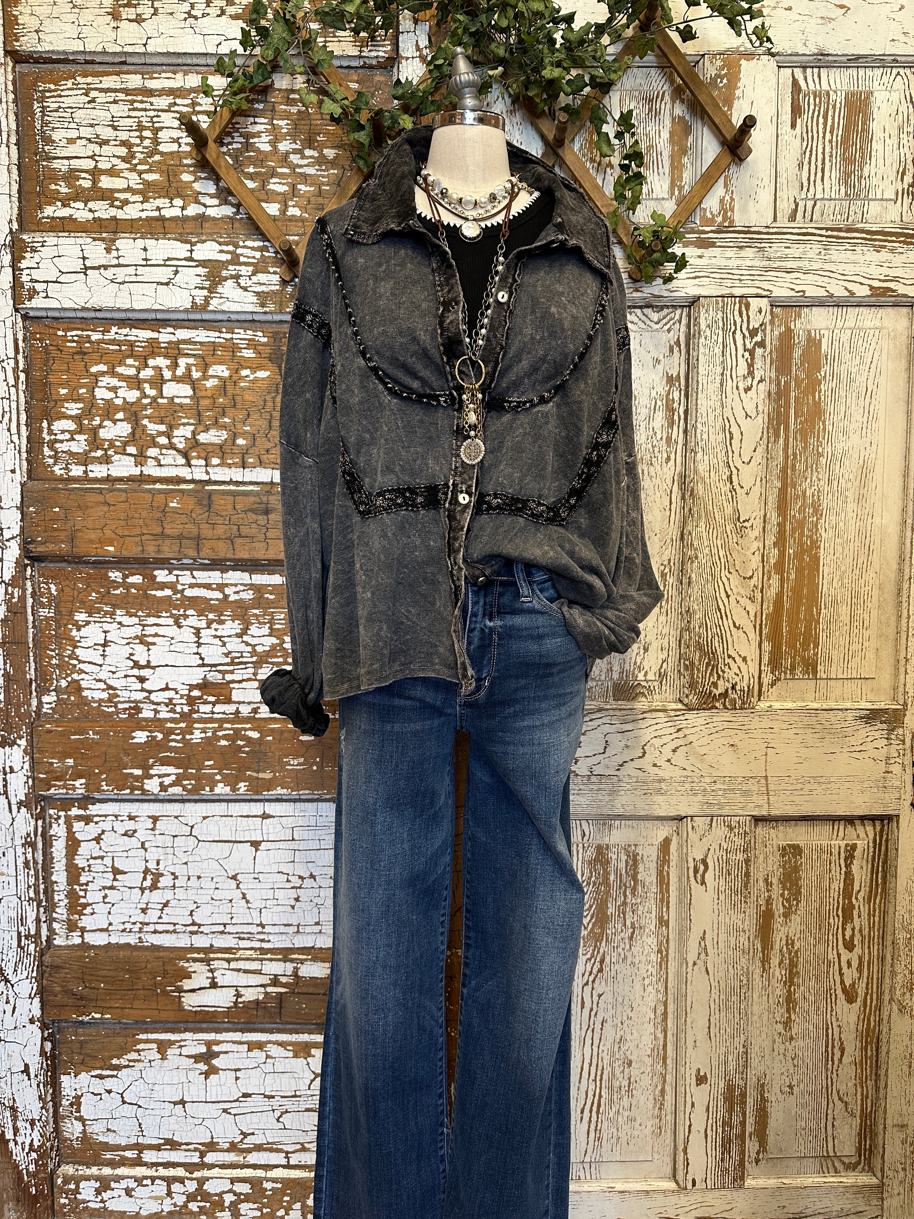 Edgy yet chic, this black washed eyelet trim button-up shacket features delicate lace eyelet accents for a boutique-ready finish. Styled with layered interchangeable necklaces, it’s perfect for adding depth and texture to your look while staying effortlessly cool.