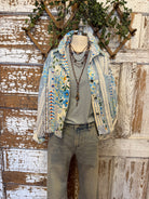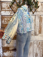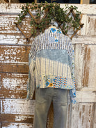 The cropped length pairs perfectly with barrel jeans, and the patchwork design makes every angle interesting.
