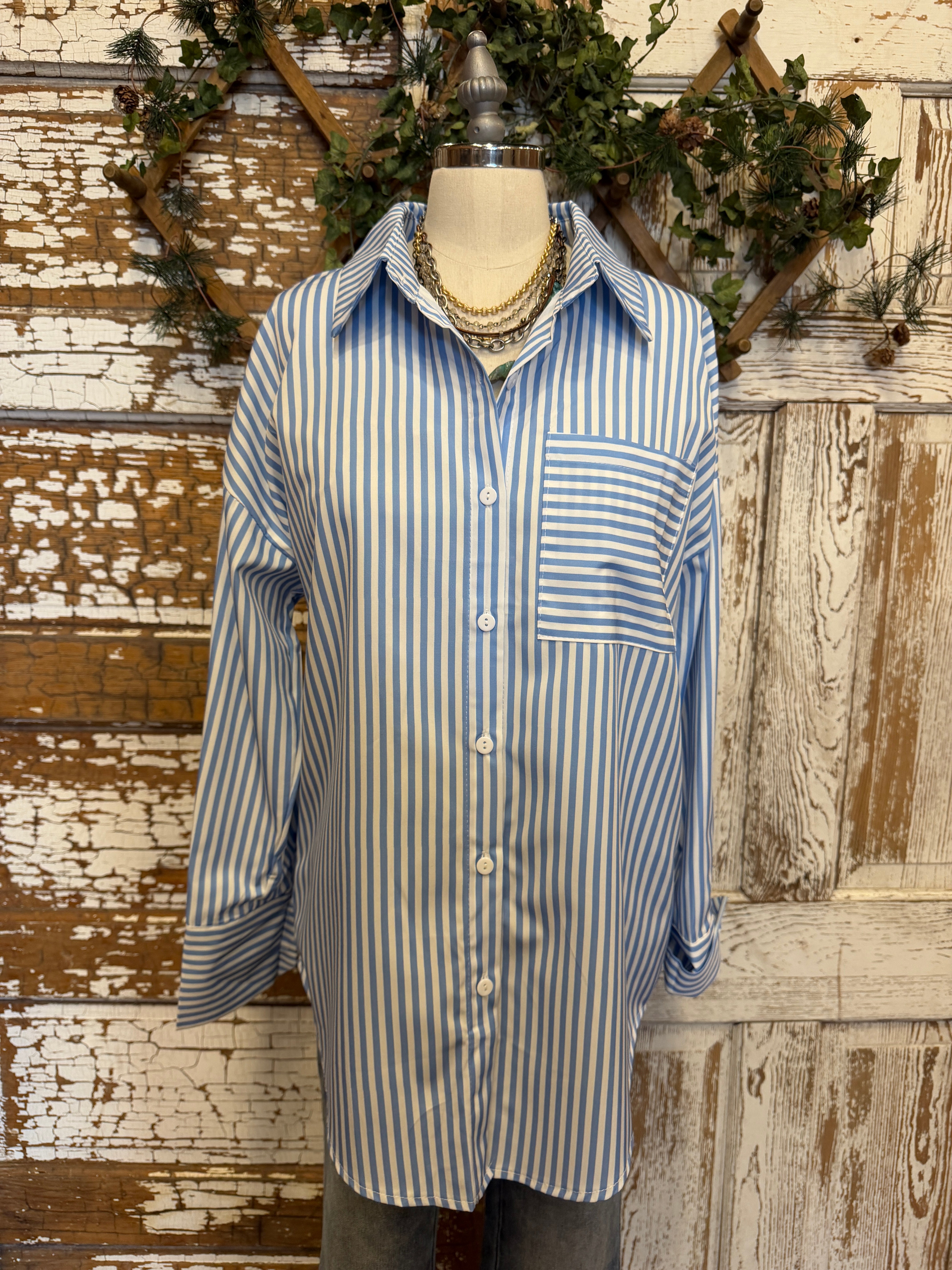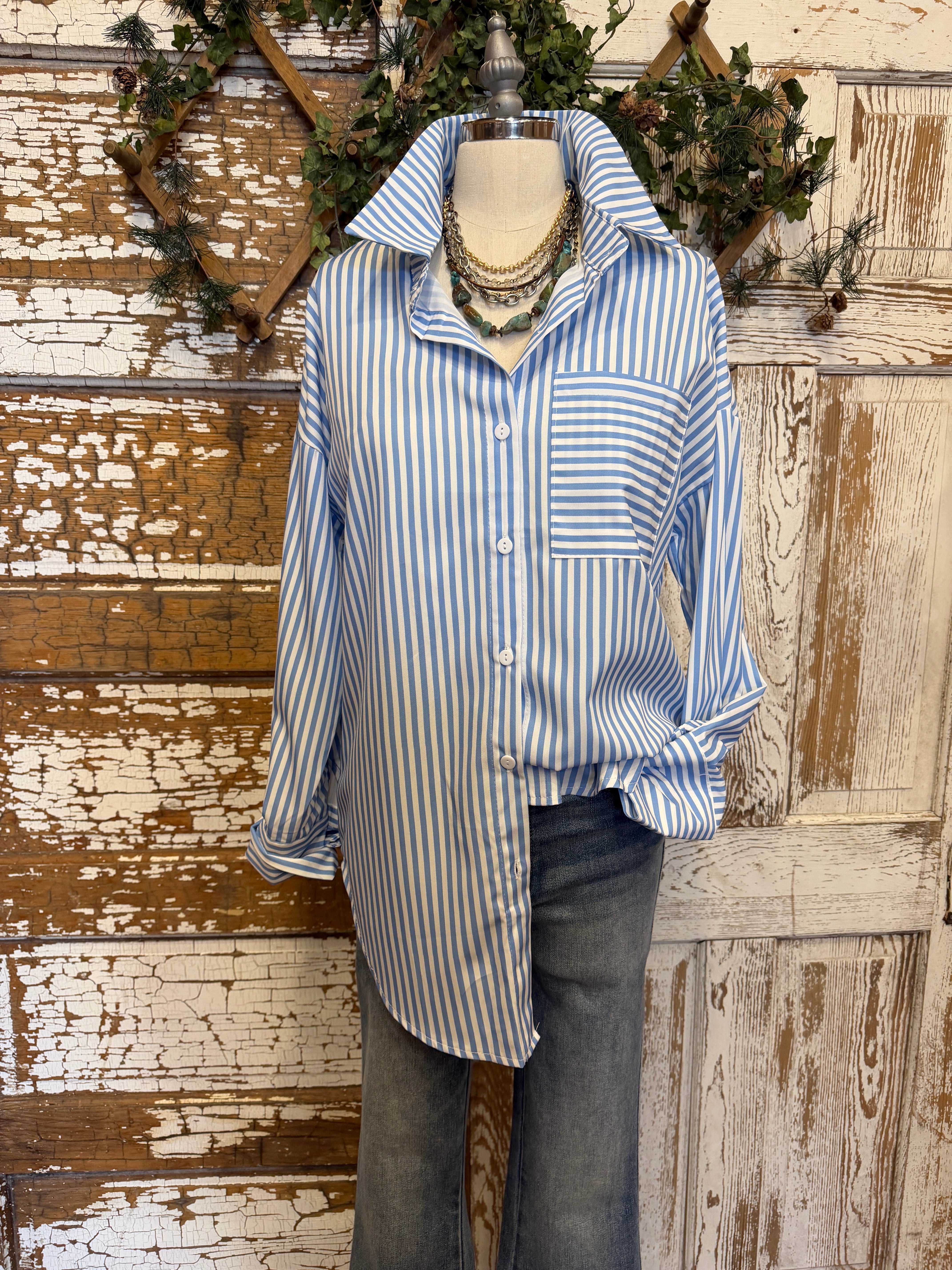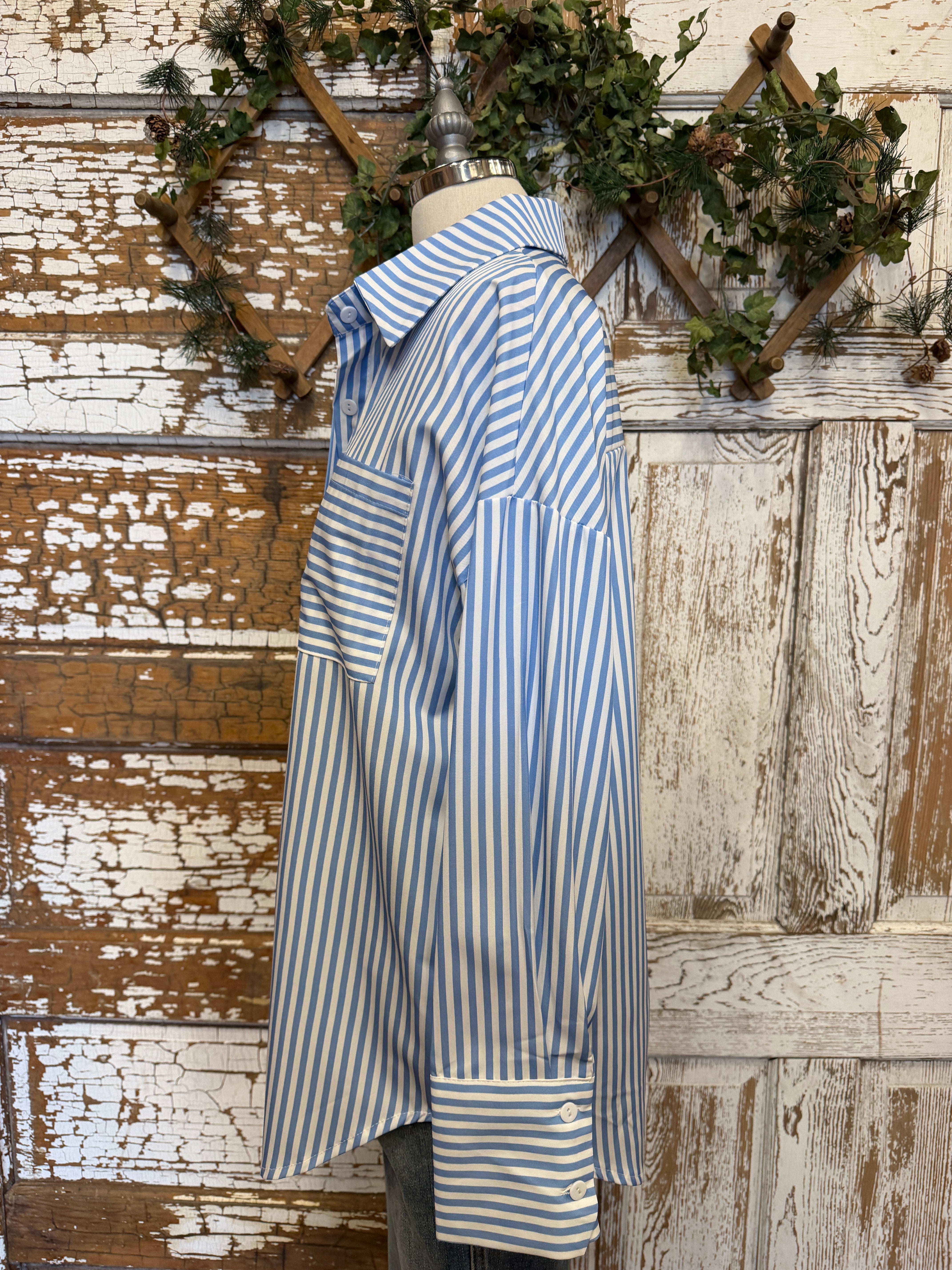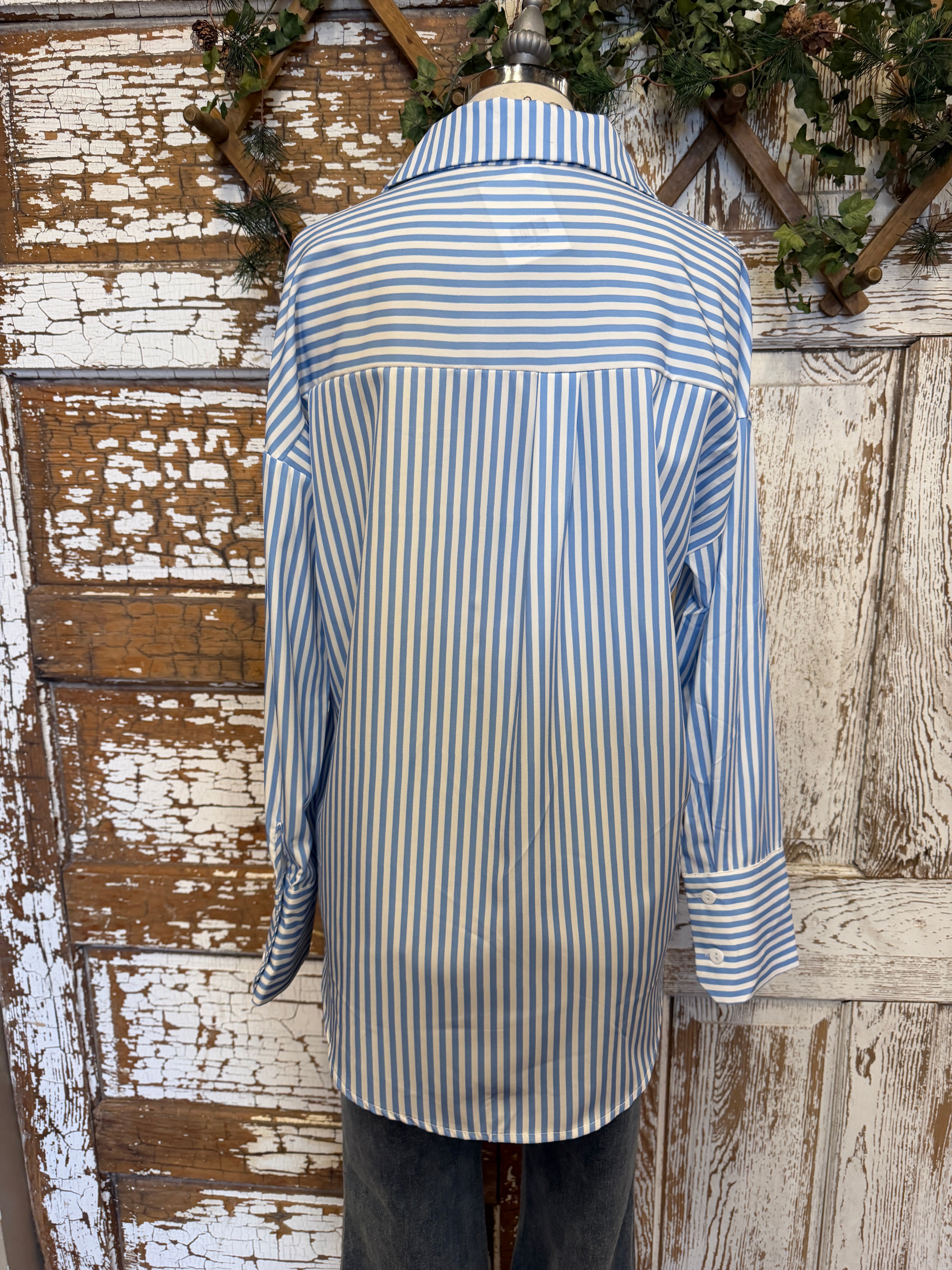 Blue & White Classic Stripe Button-Up Blouse: Small - 2XL