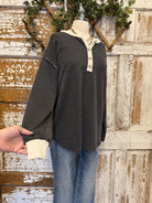 This cozy waffle-knit henley features contrast trim, a relaxed fit, and an faux button neckline. A soft, everyday essential for layering with jewelry or jackets.