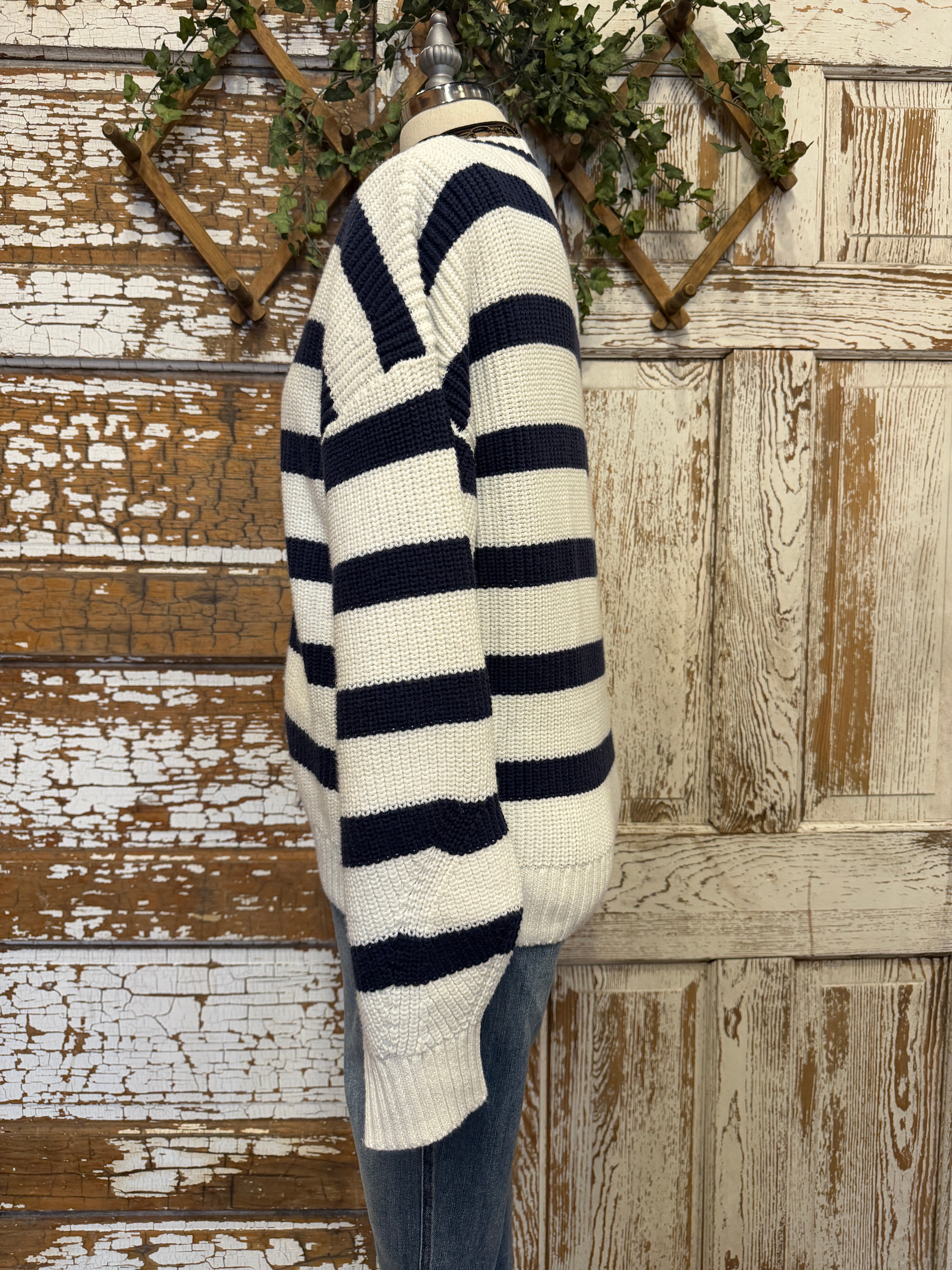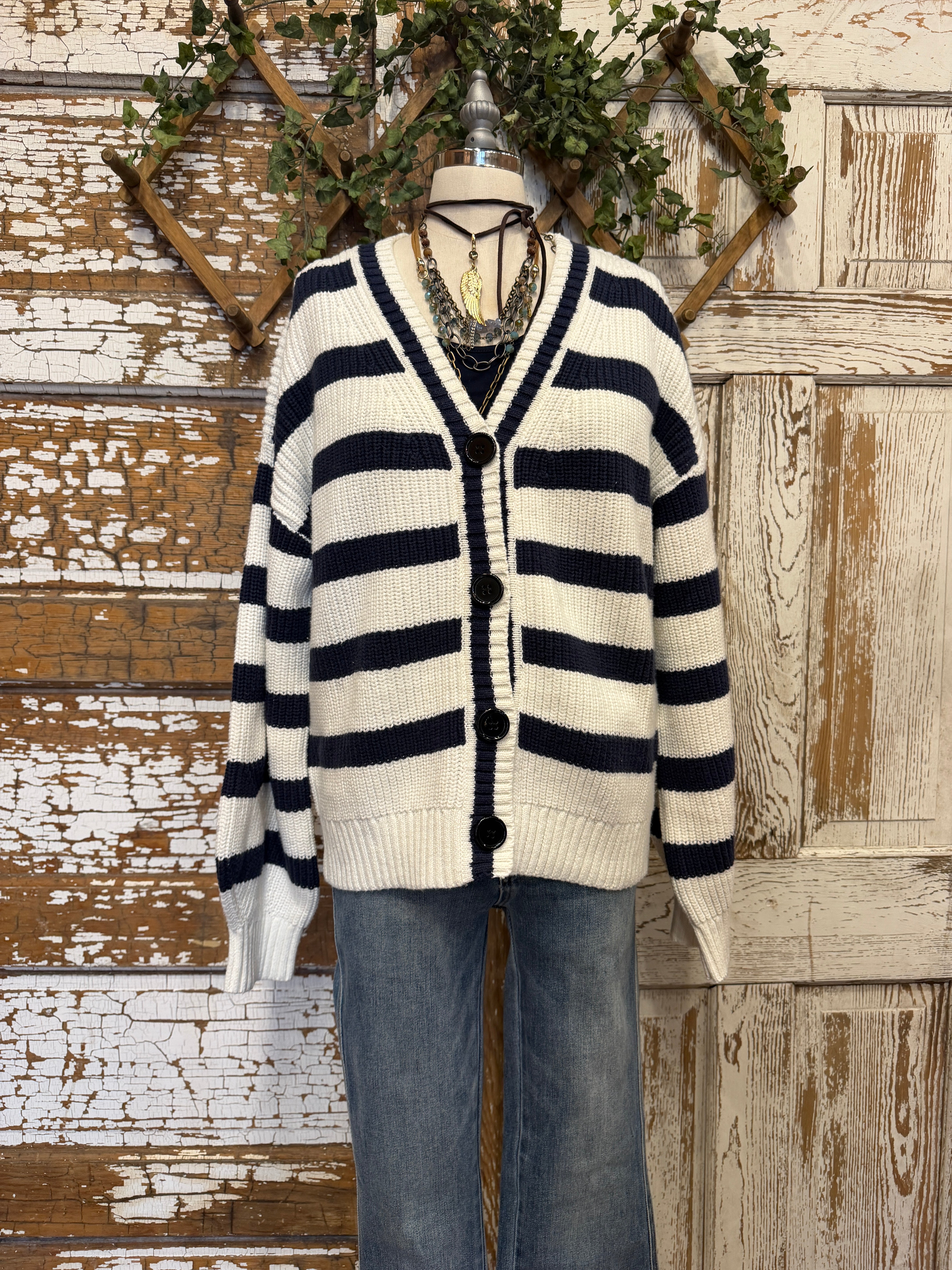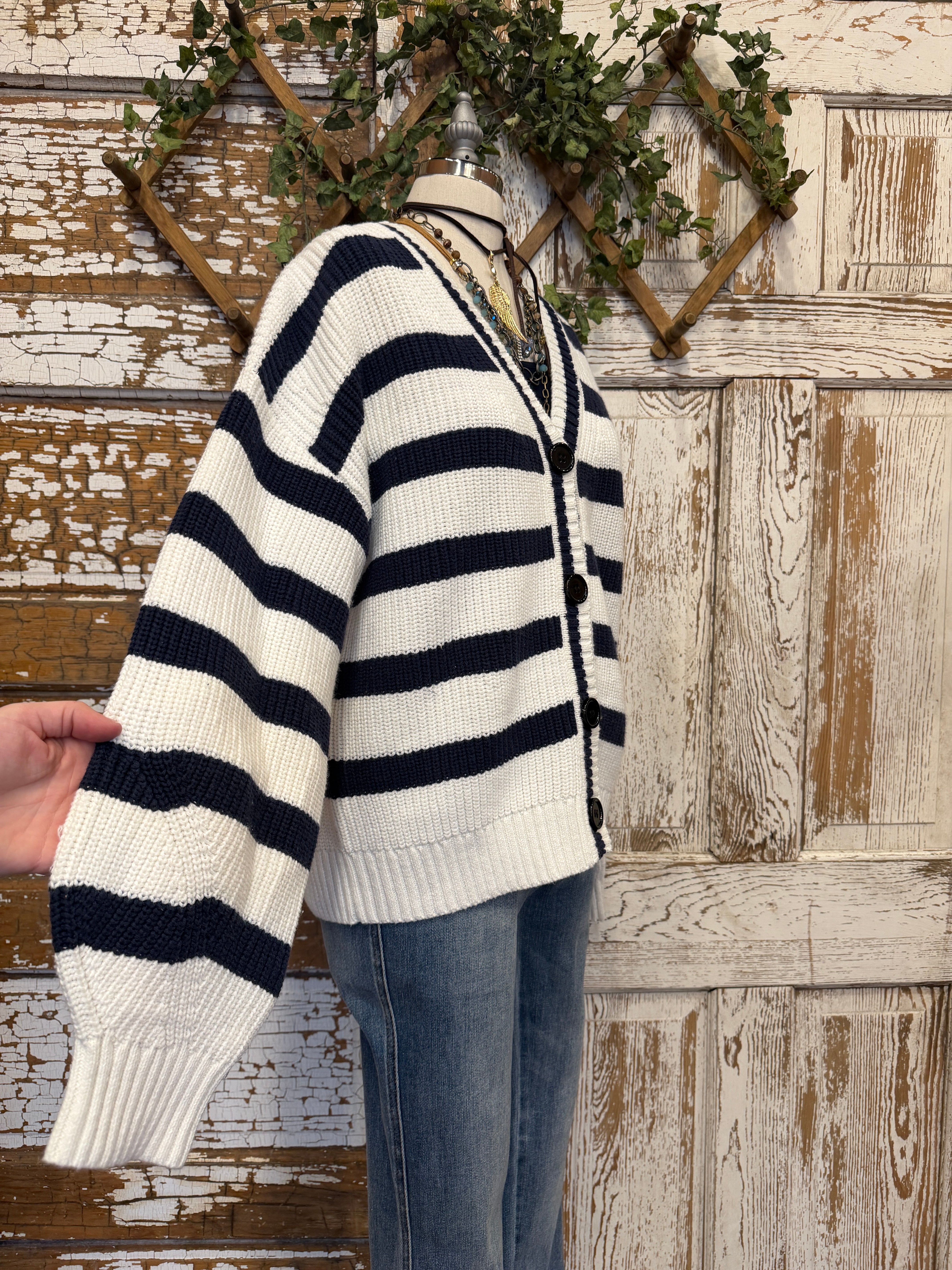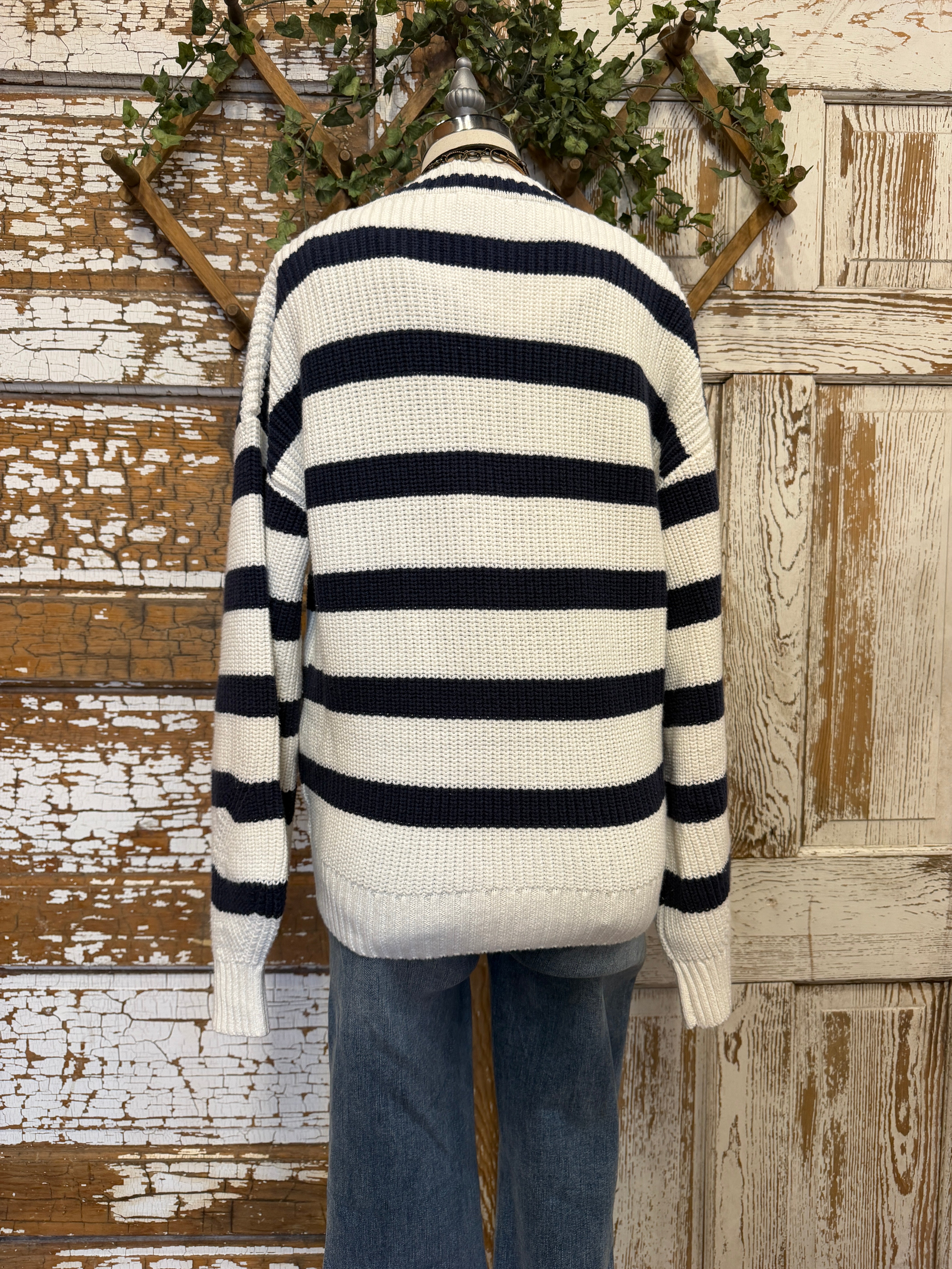 A classic stripe cardigan with a relaxed fit that layers beautifully for effortless everyday style.
