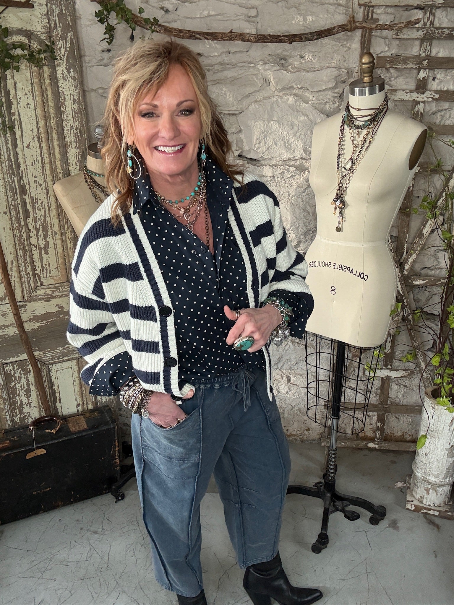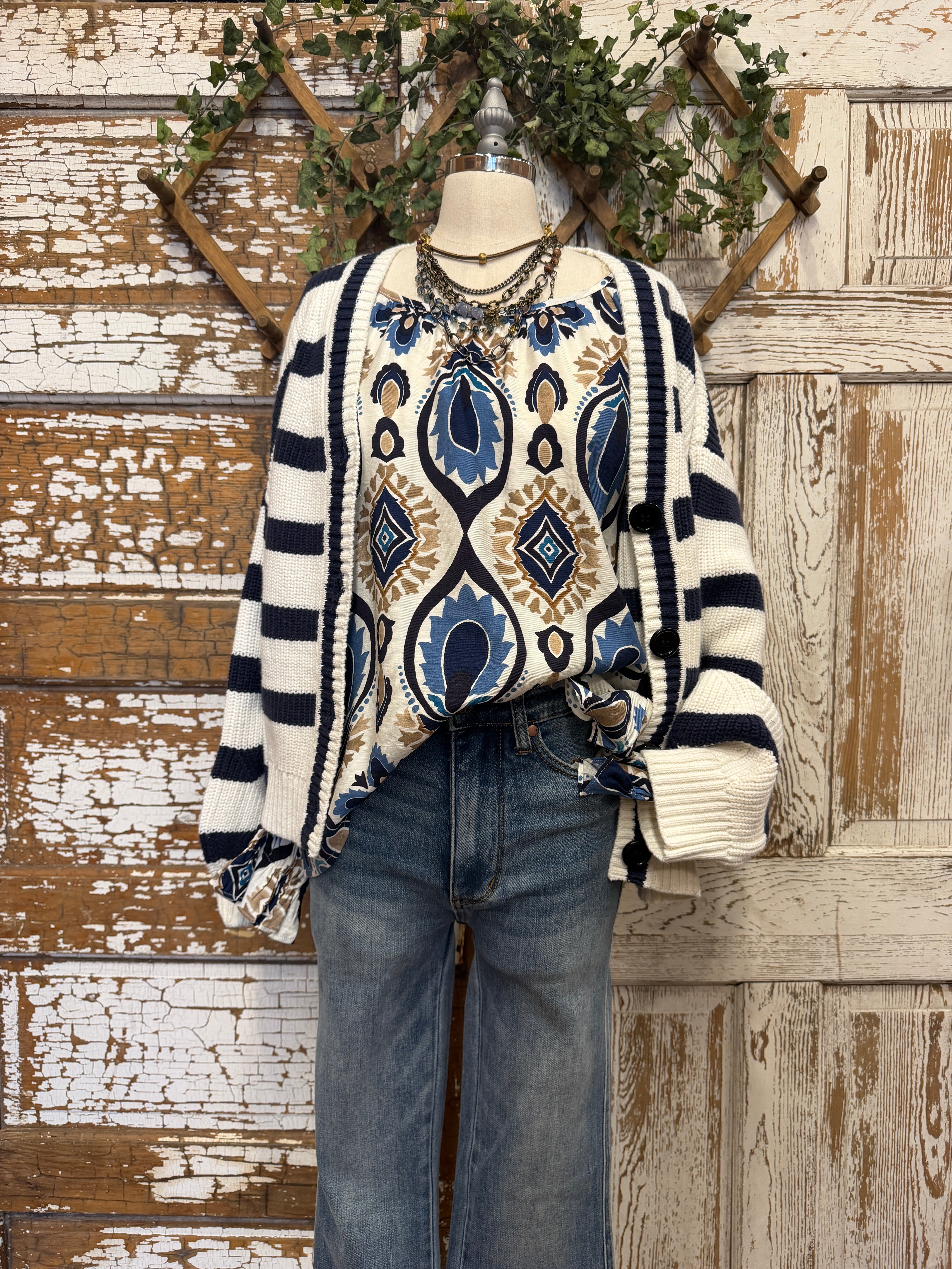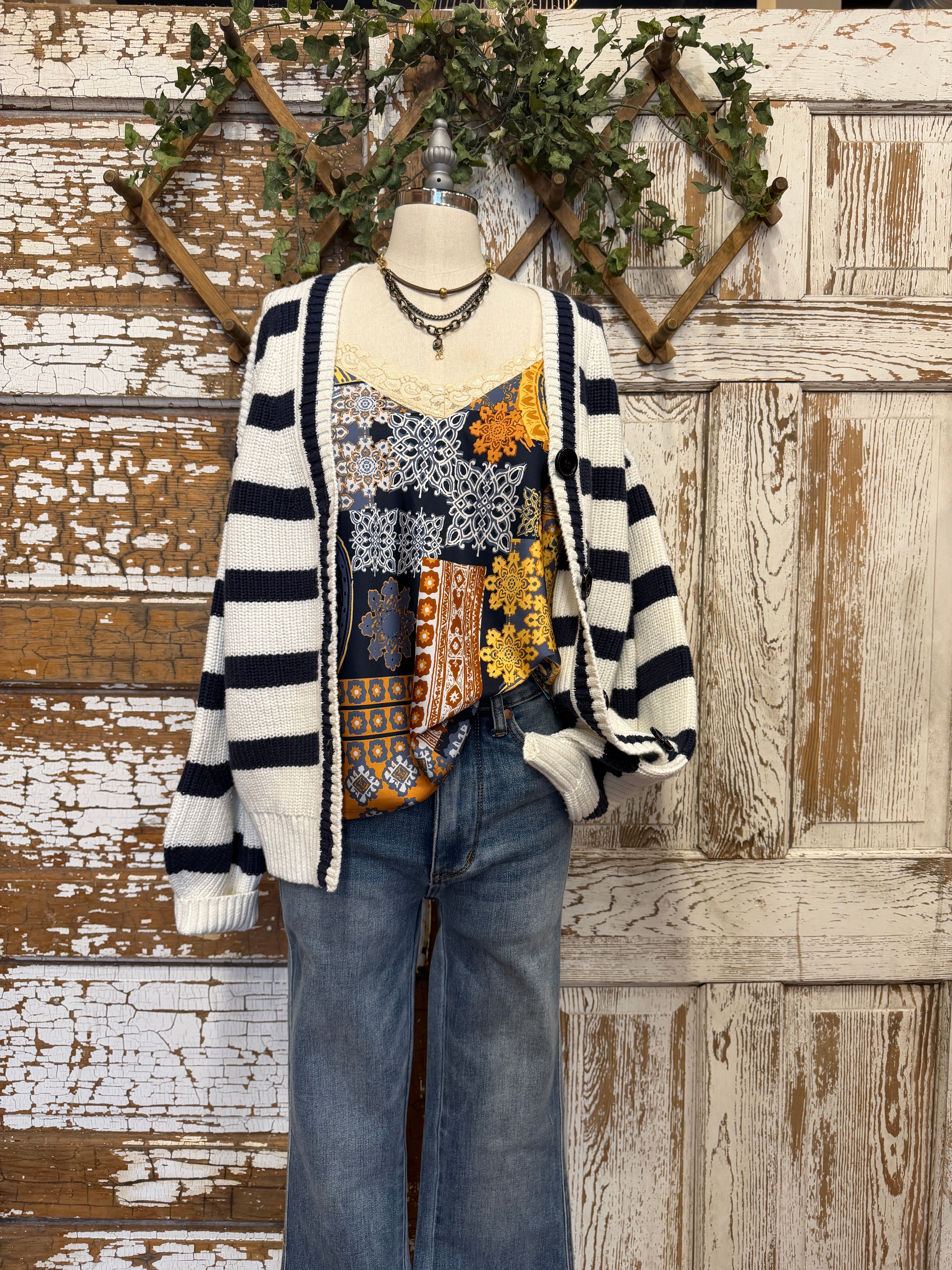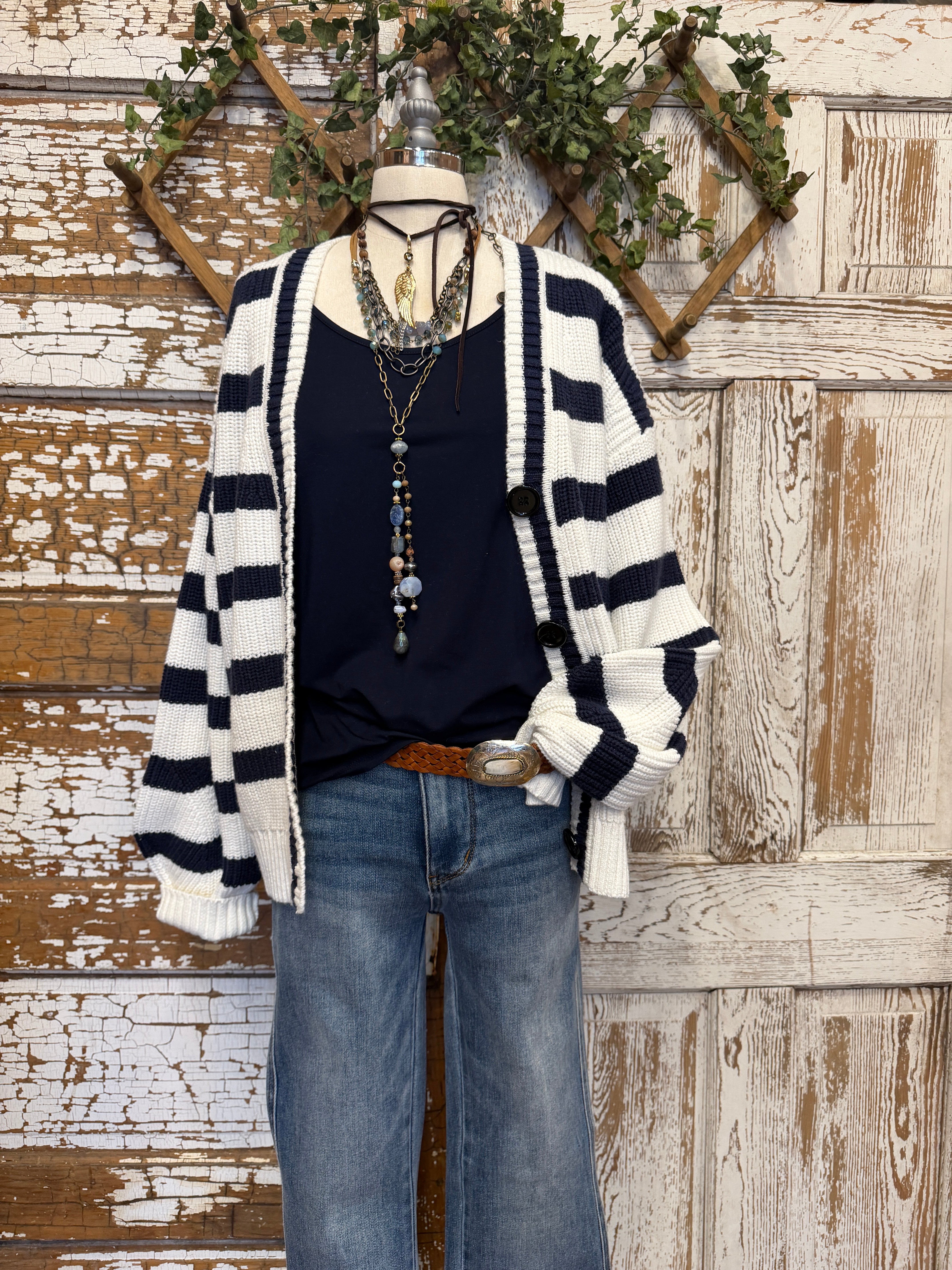 A classic stripe cardigan with a relaxed fit that layers beautifully for effortless everyday style.
