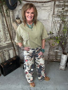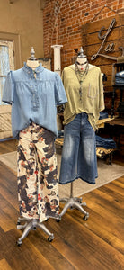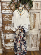 These are the pants that do all the talking. Bold, artistic, and effortlessly flattering...a true boutique stand out in Lu's Cow & floral print wide leg pant with a raw hemline.