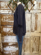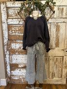 The Dark Ink Crochet Insert Sweatshirt blends cozy with chic featuring soft washed fabric and delicate crochet accents at the shoulders and sleeves. This boutique favorite gives a feminine twist to casual comfort, perfect for pairing with handmade artisan jewelry.