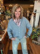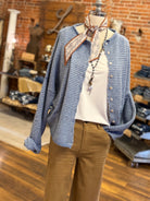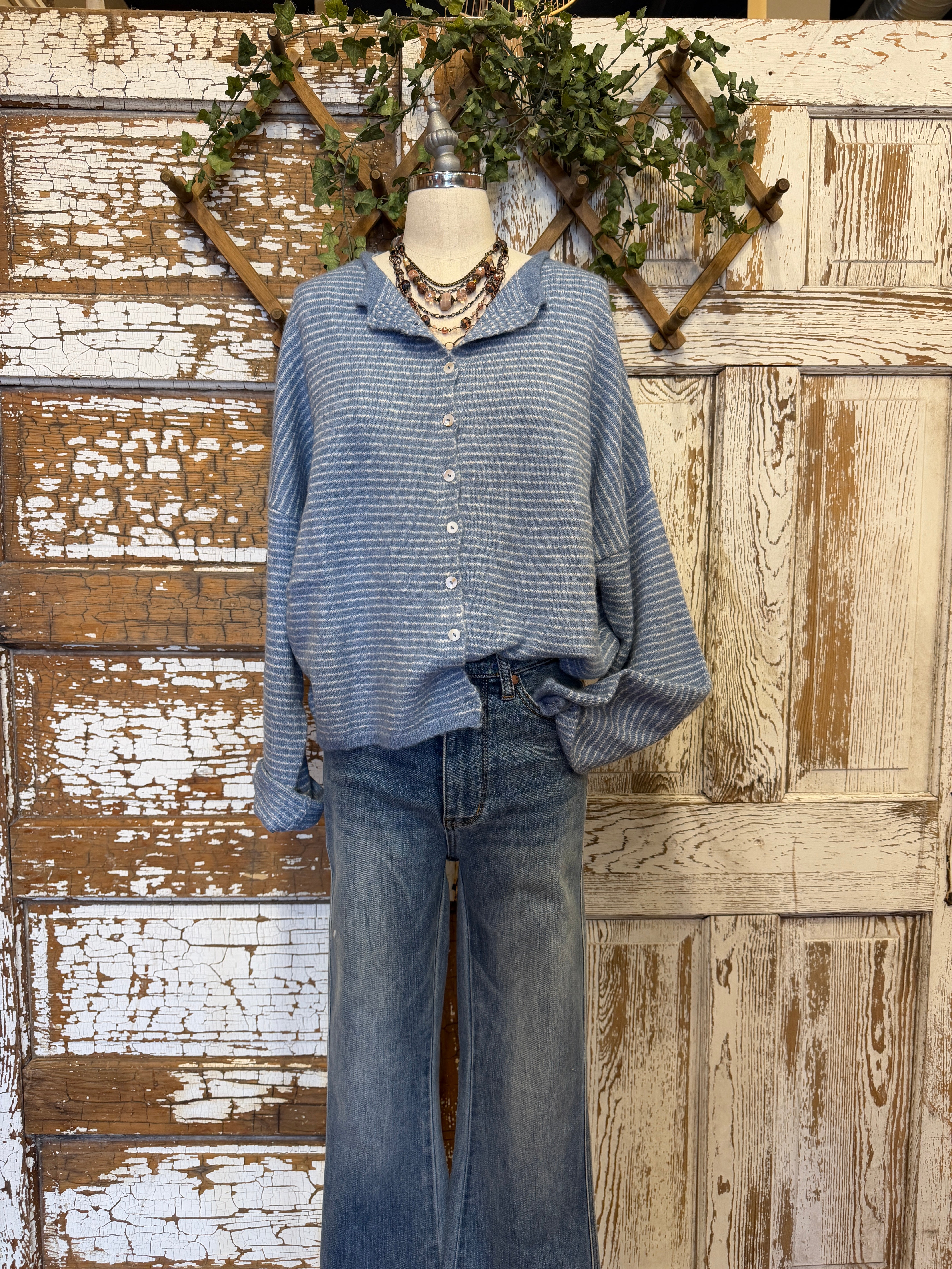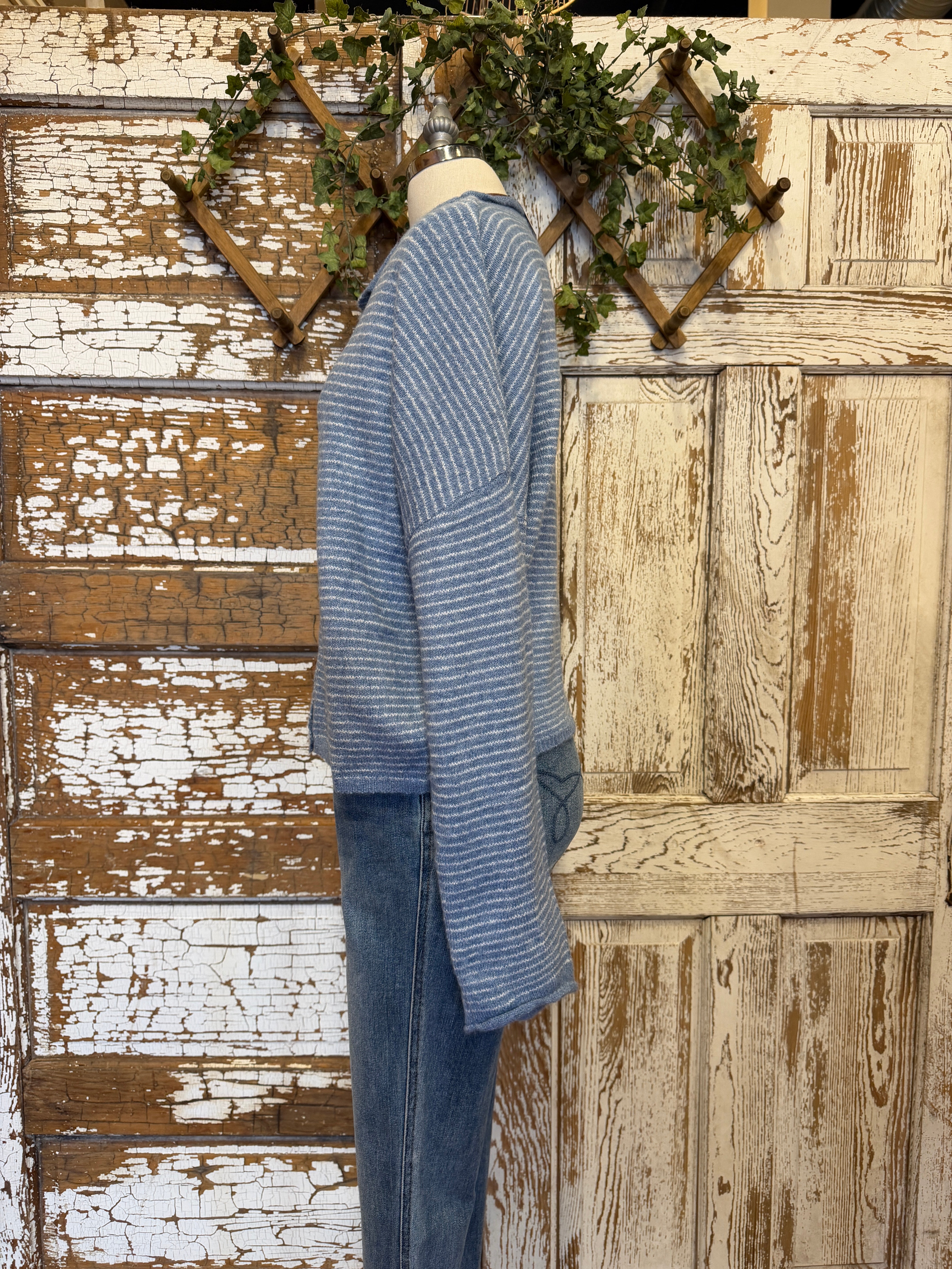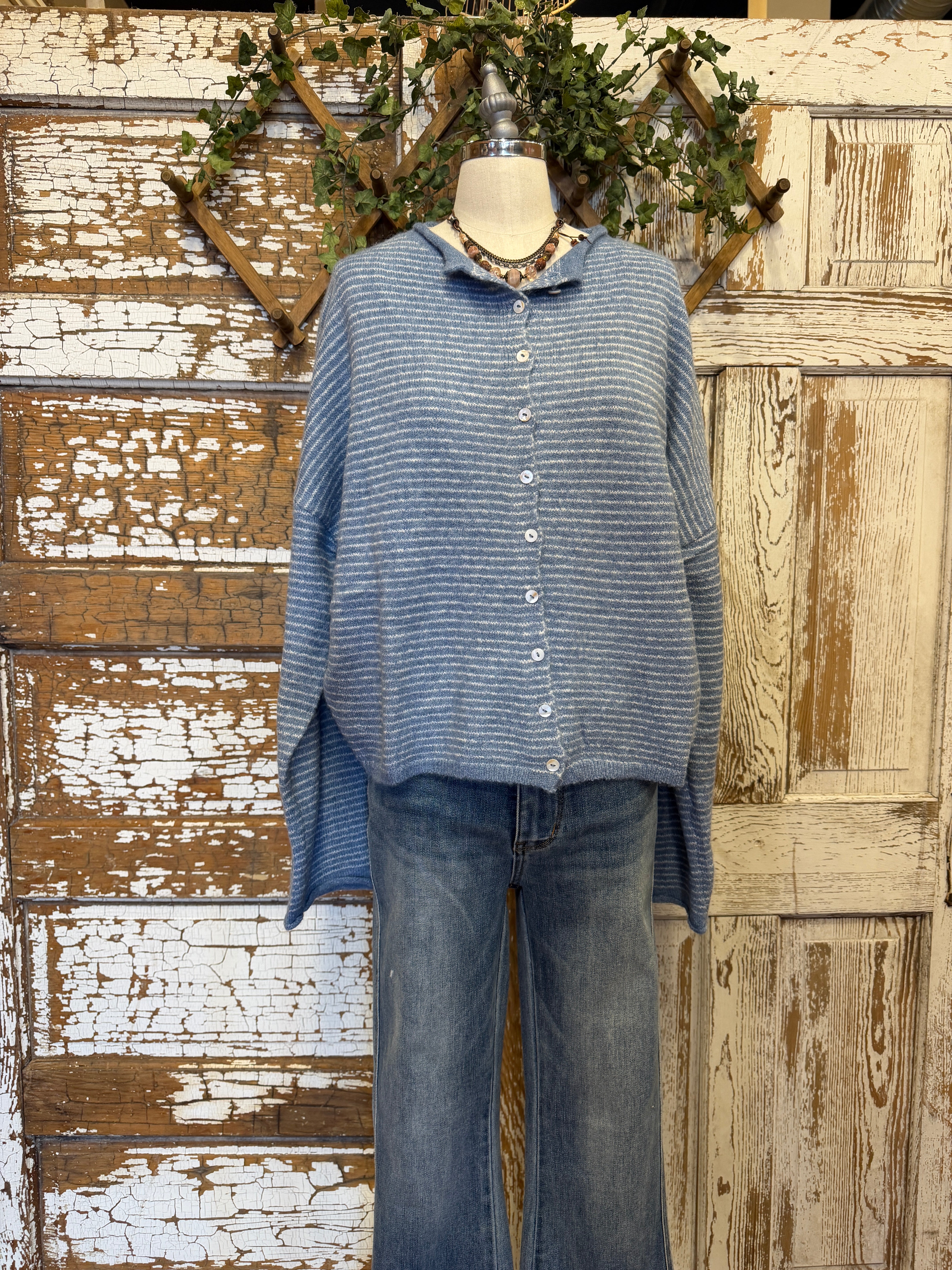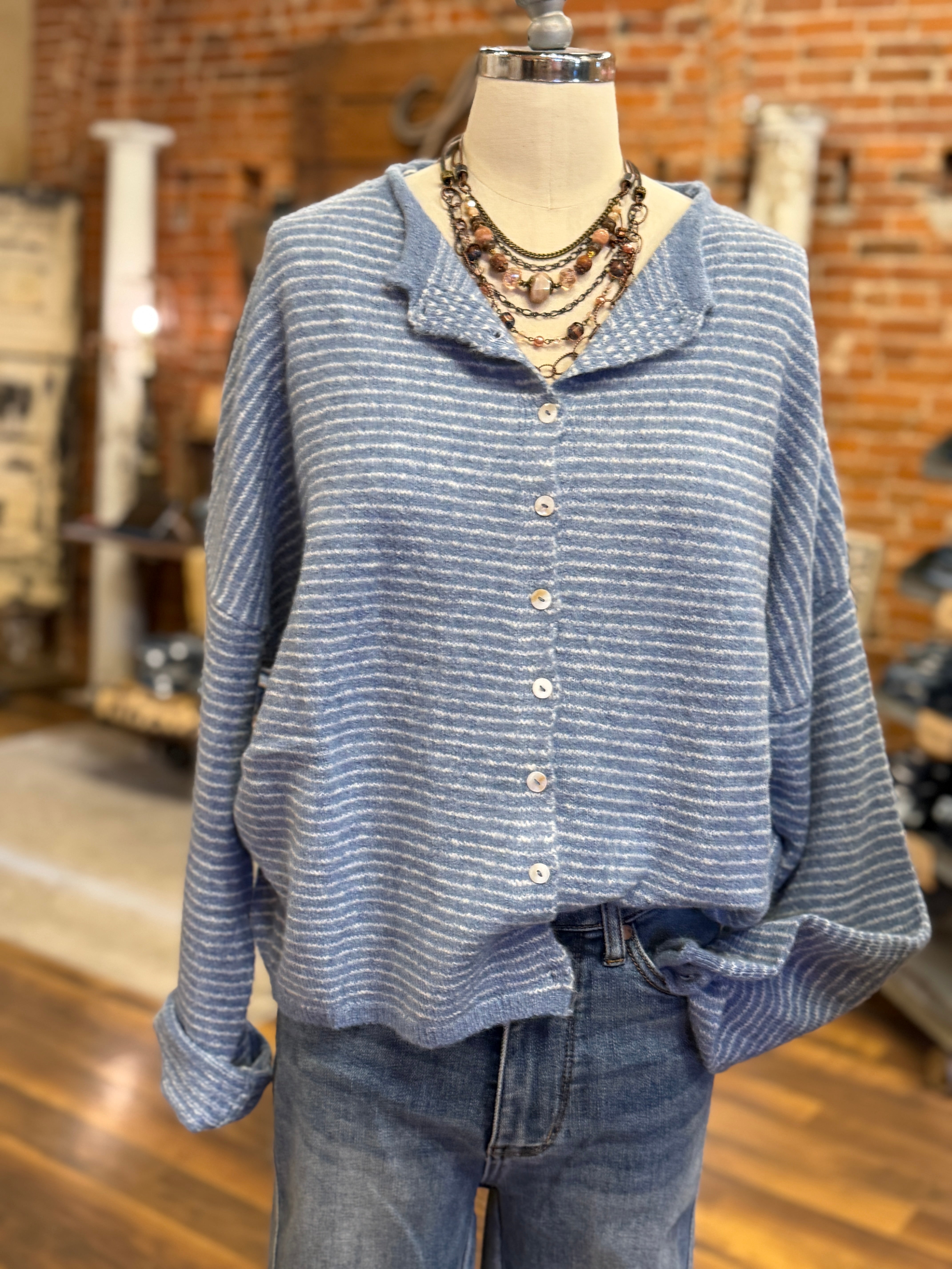Cozy meets cool. The soft blue stripe and slightly oversized drape give this cardigan a relaxed feel without bulk.