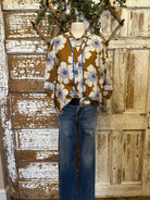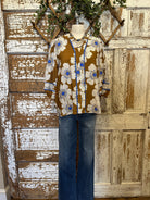 Make a bold statement in this artistic floral top featuring oversized blooms in mustard, ivory, and blue. Lightweight and playful, it’s the perfect mix of vintage-inspired and modern boutique.