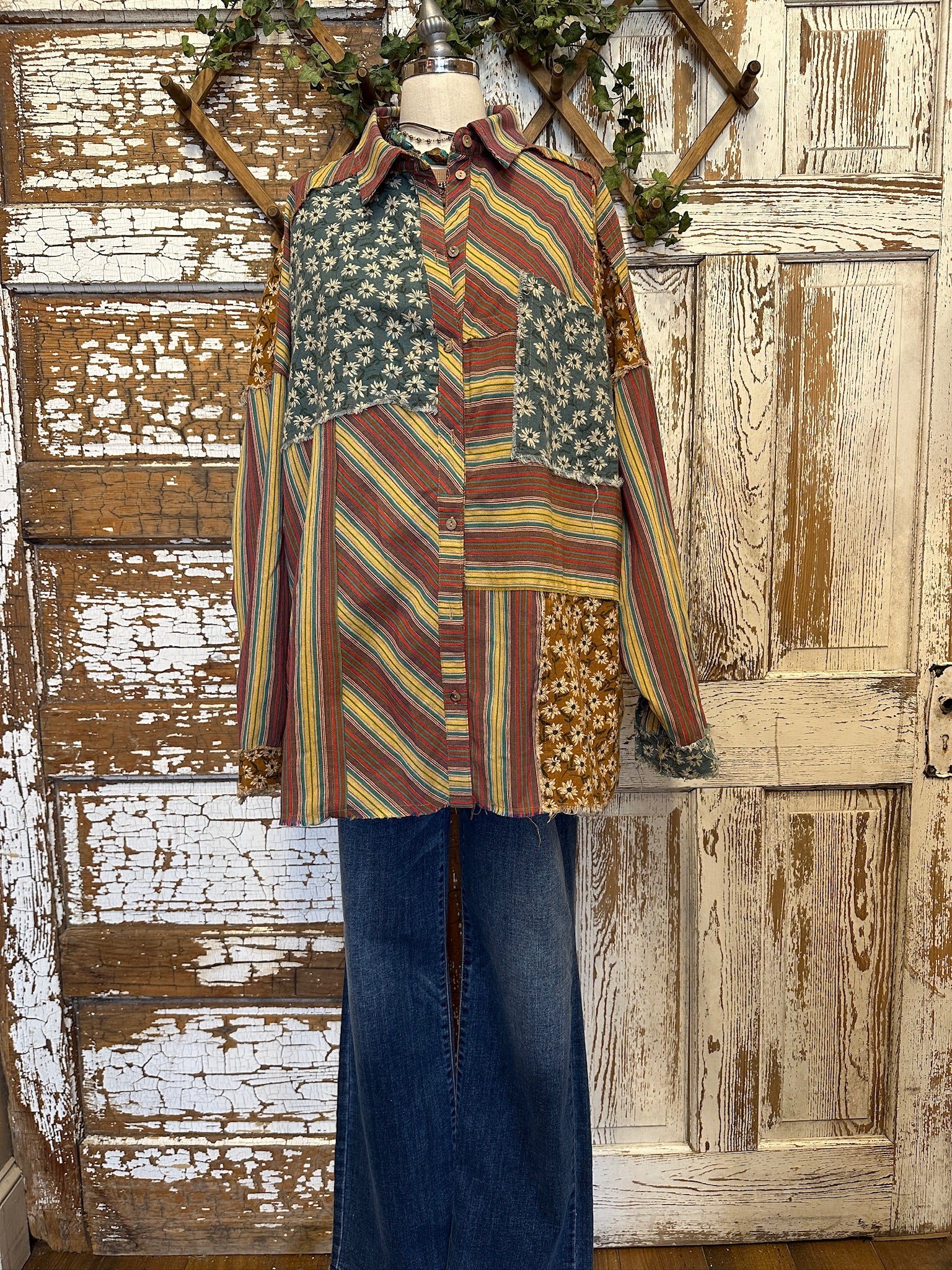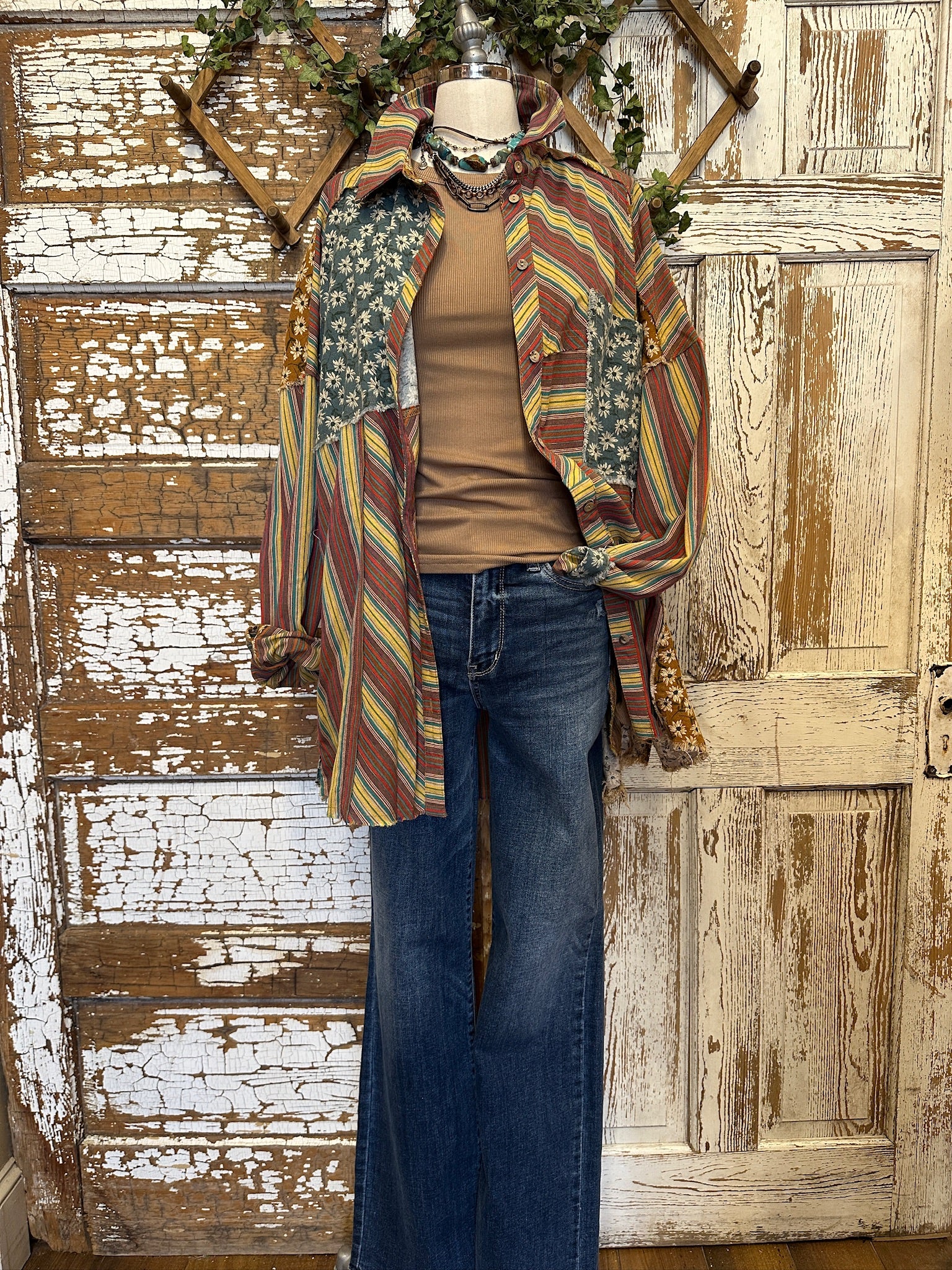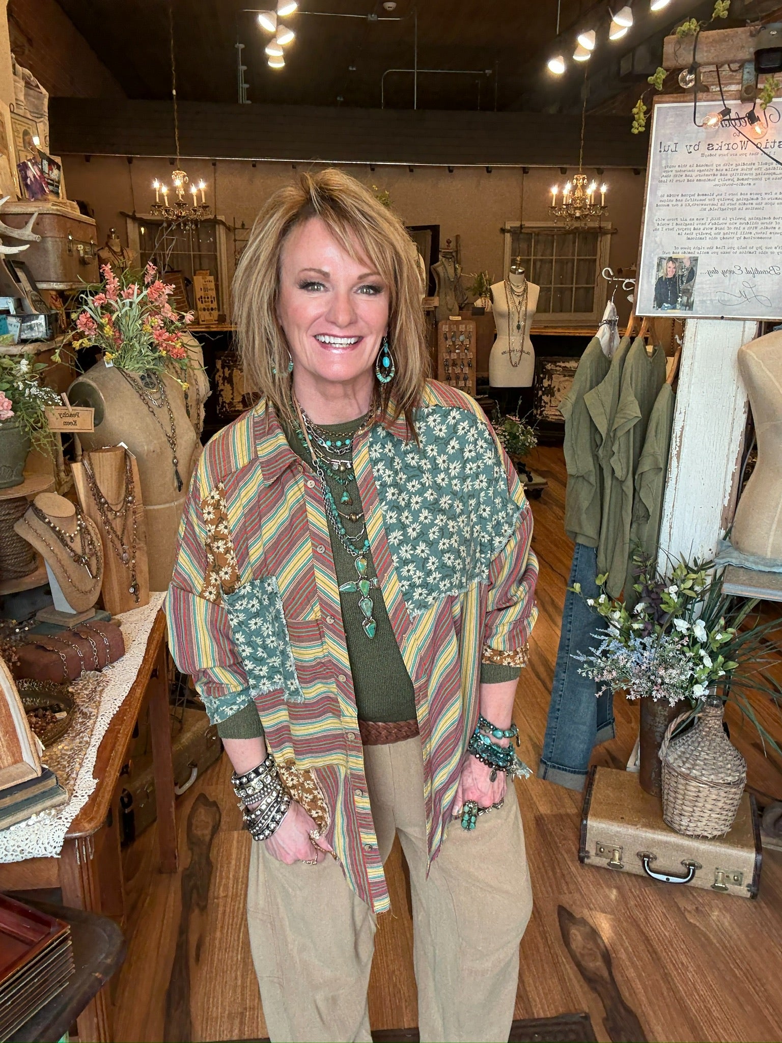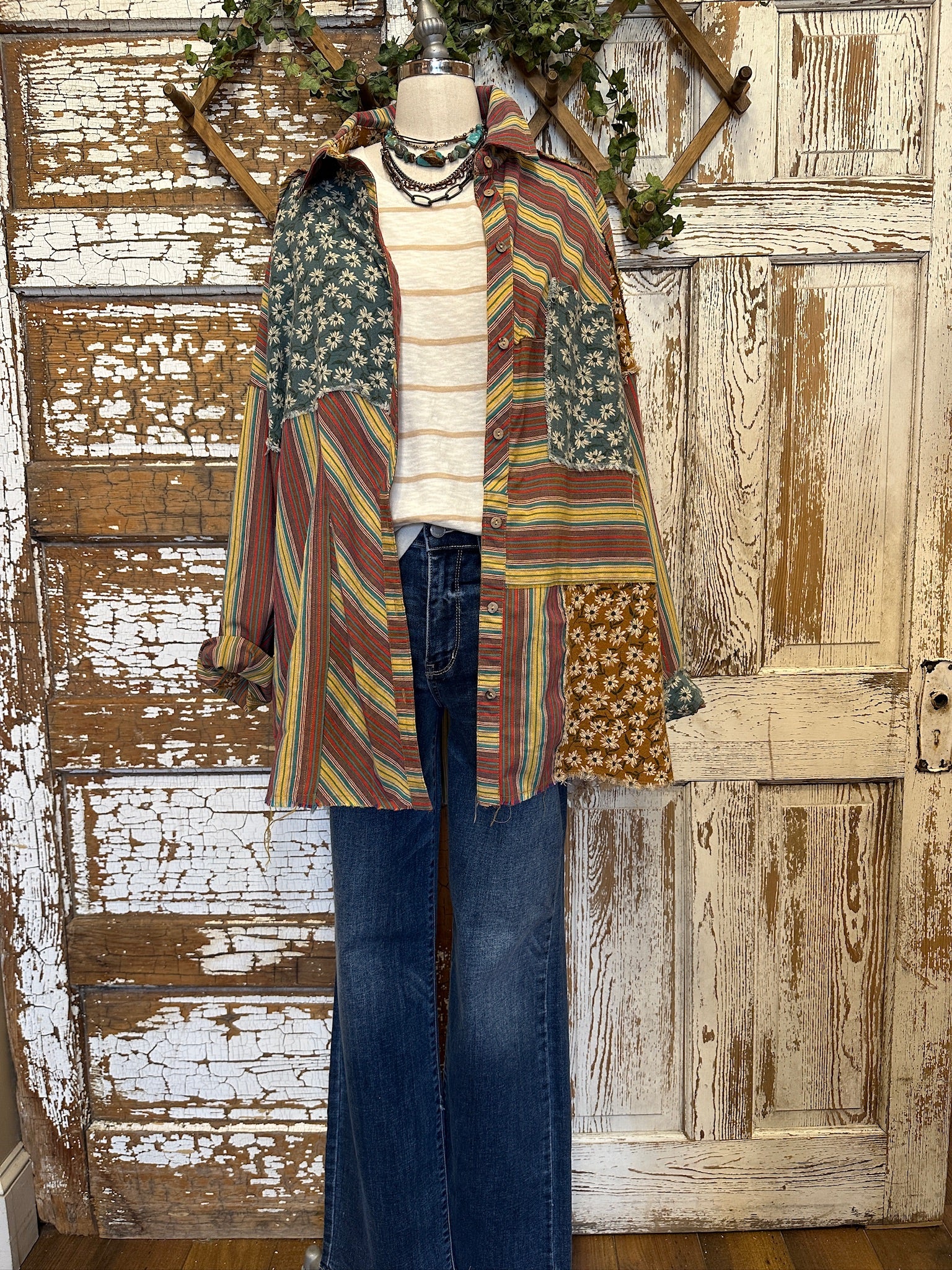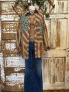 The Field & Stripe Shacket is where laid-back boho meets everyday ease. Designed with raw seams and patchwork detail, this oversized button-front layer brings a perfectly lived-in vibe. A mix of floral and stripe prints gives it that eclectic charm, while side pockets keep it functional and cozy. Throw it on over denim or Lu Leisure—this shacket is made for effortless layering all season long.