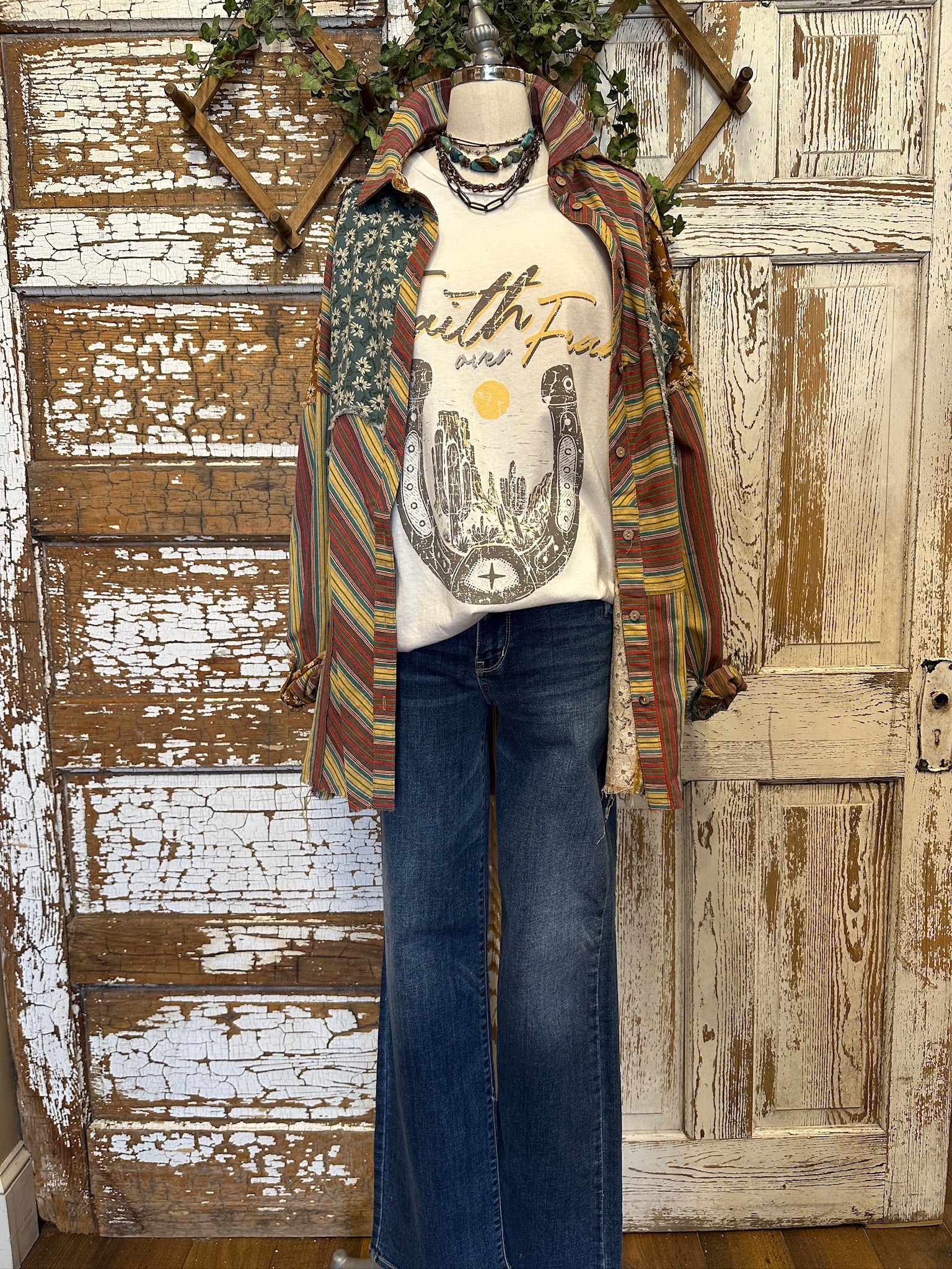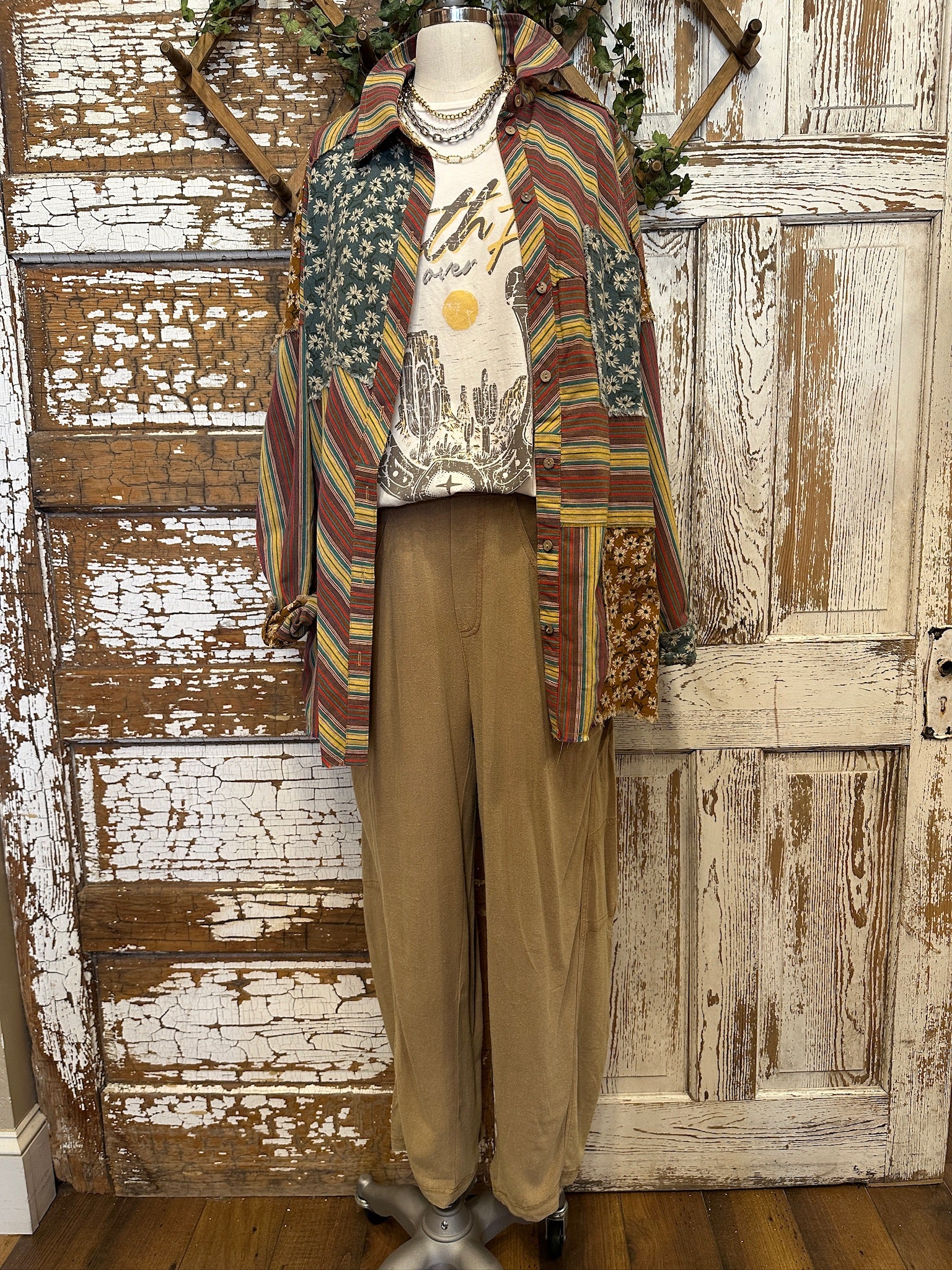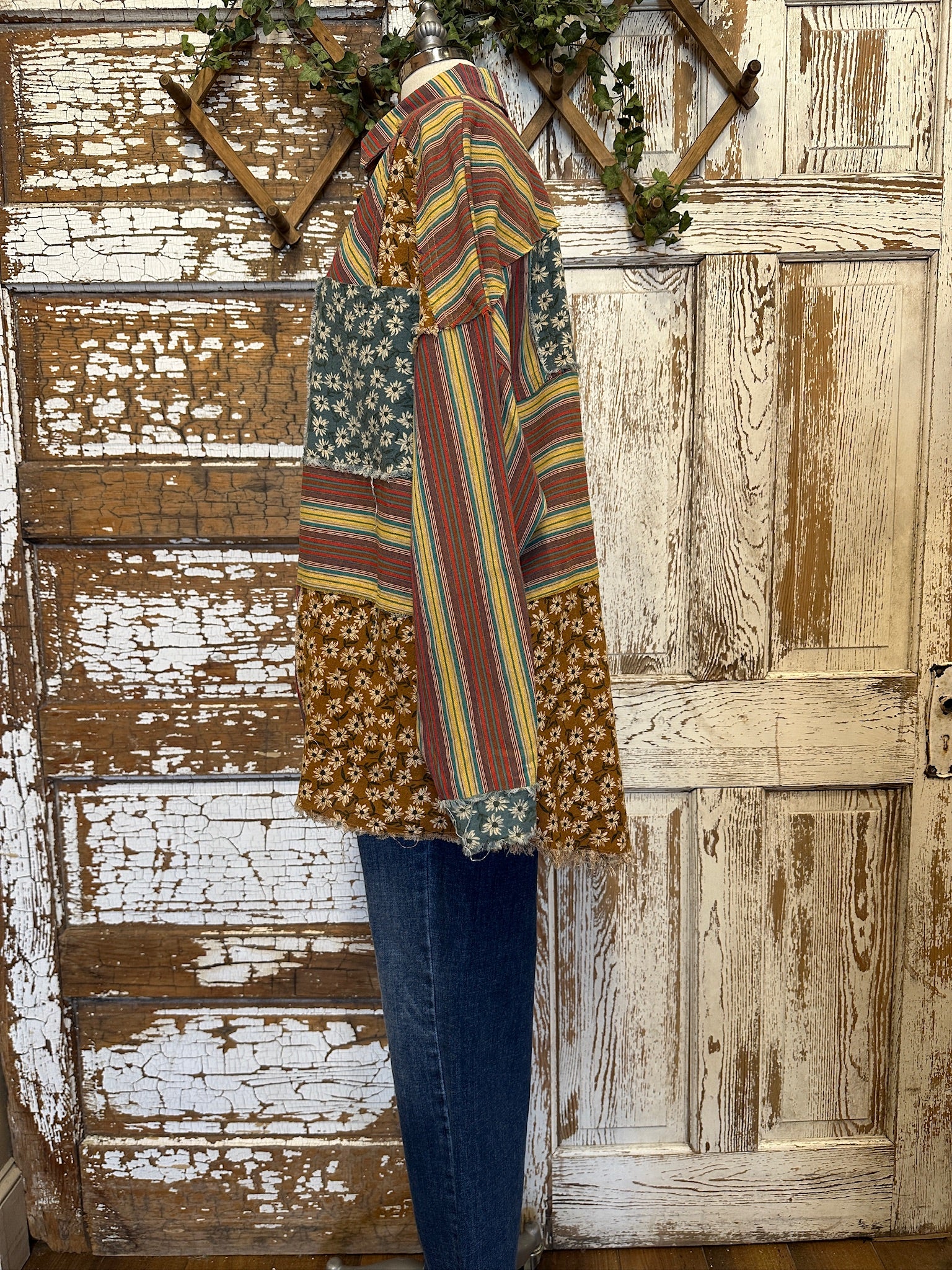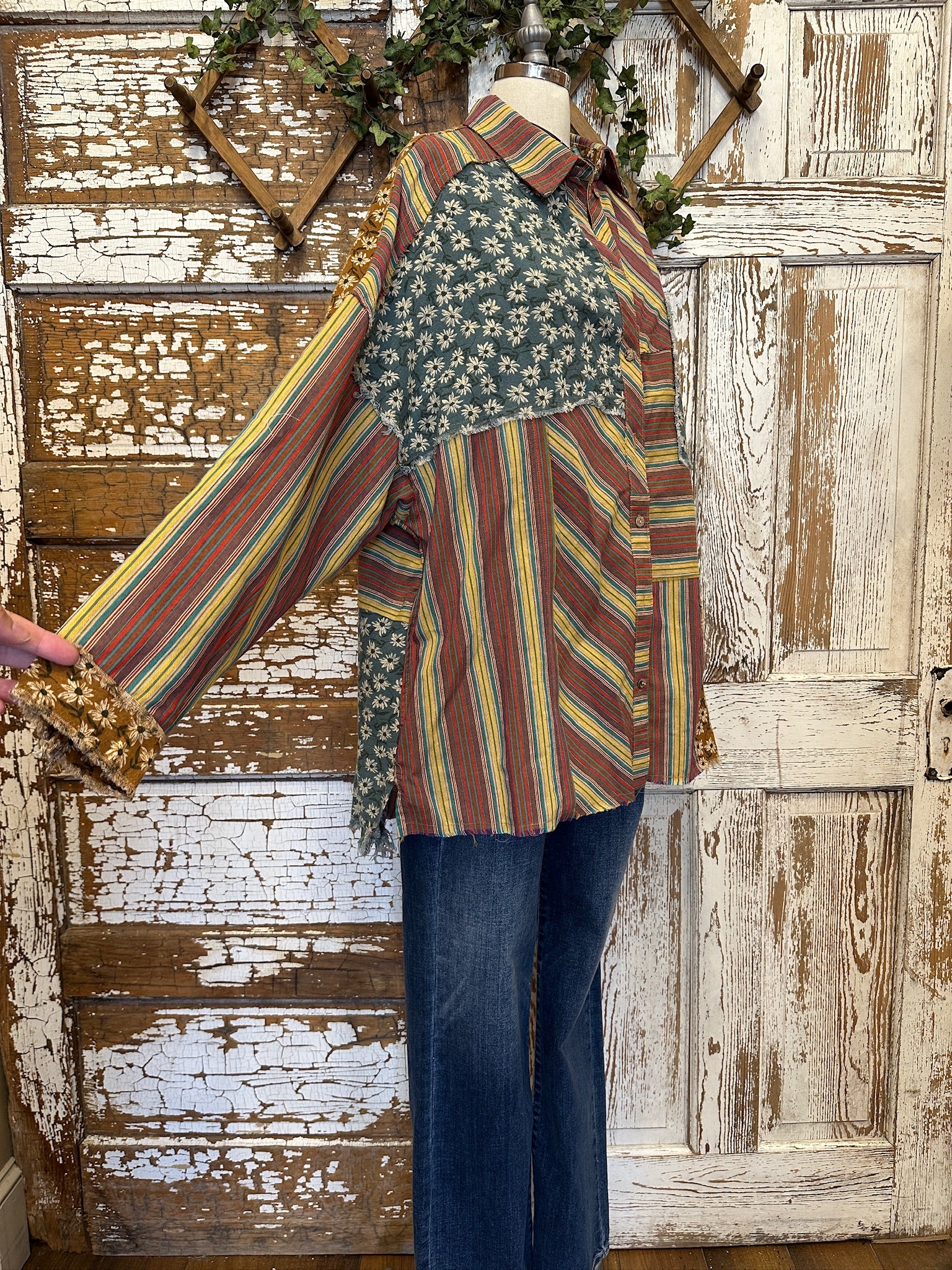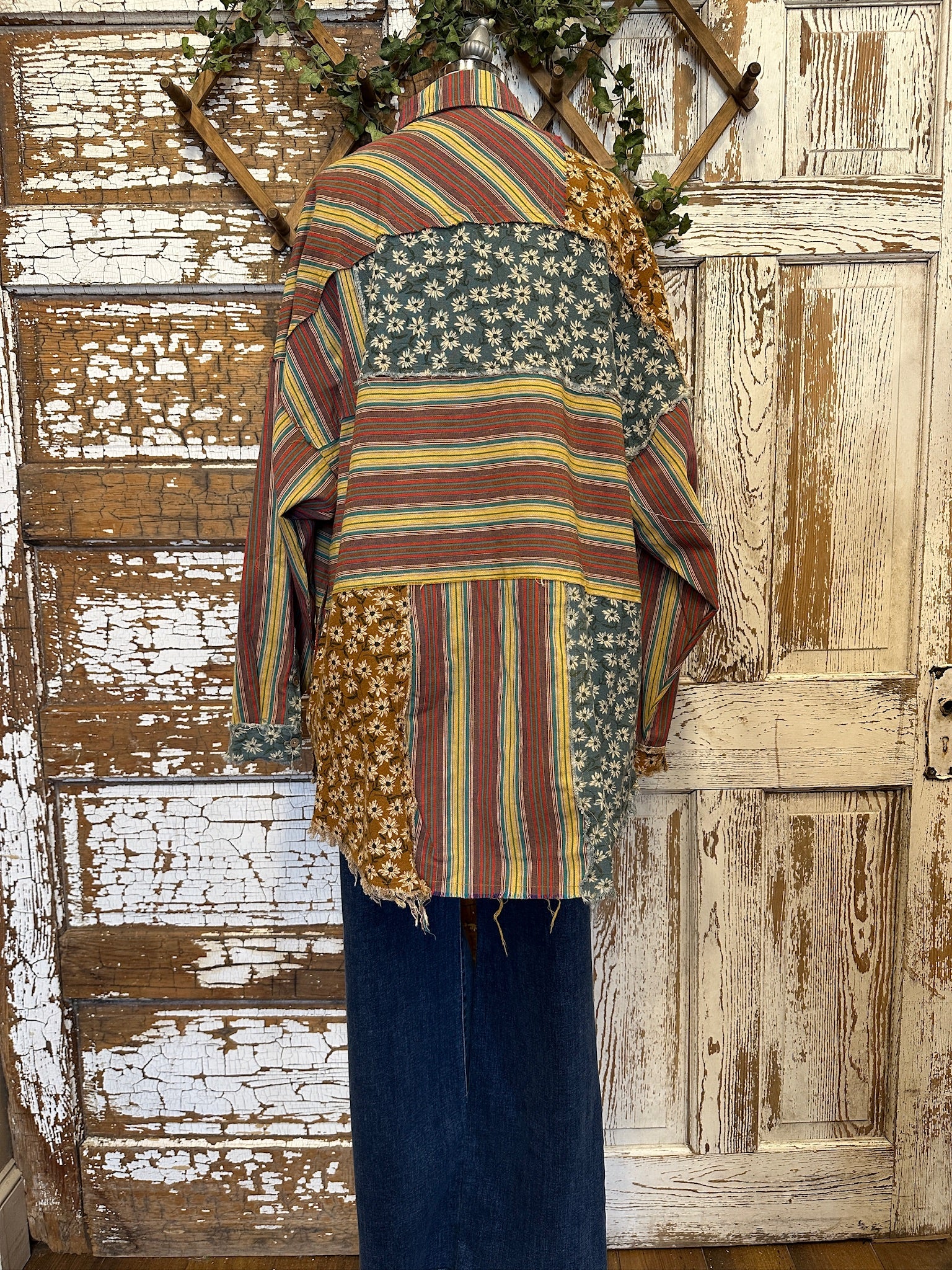The Field & Stripe Shacket is where laid-back boho meets everyday ease. Designed with raw seams and patchwork detail, this oversized button-front layer brings a perfectly lived-in vibe. A mix of floral and stripe prints gives it that eclectic charm, while side pockets keep it functional and cozy. Throw it on over denim or Lu Leisure—this shacket is made for effortless layering all season long.
