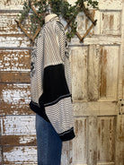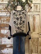 Embrace effortless style with our captivating Bohemian Floral & Stripe Mixed Print Tunic Top. This unique piece artfully blends classic elegance with a free-spirited vibe, featuring a prominent black and white rose floral print on the front panel complemented by chic black and white striped sleeves and back. Designed for the fashion-forward individual, its relaxed fit ensures ultimate comfort without compromising on flair.