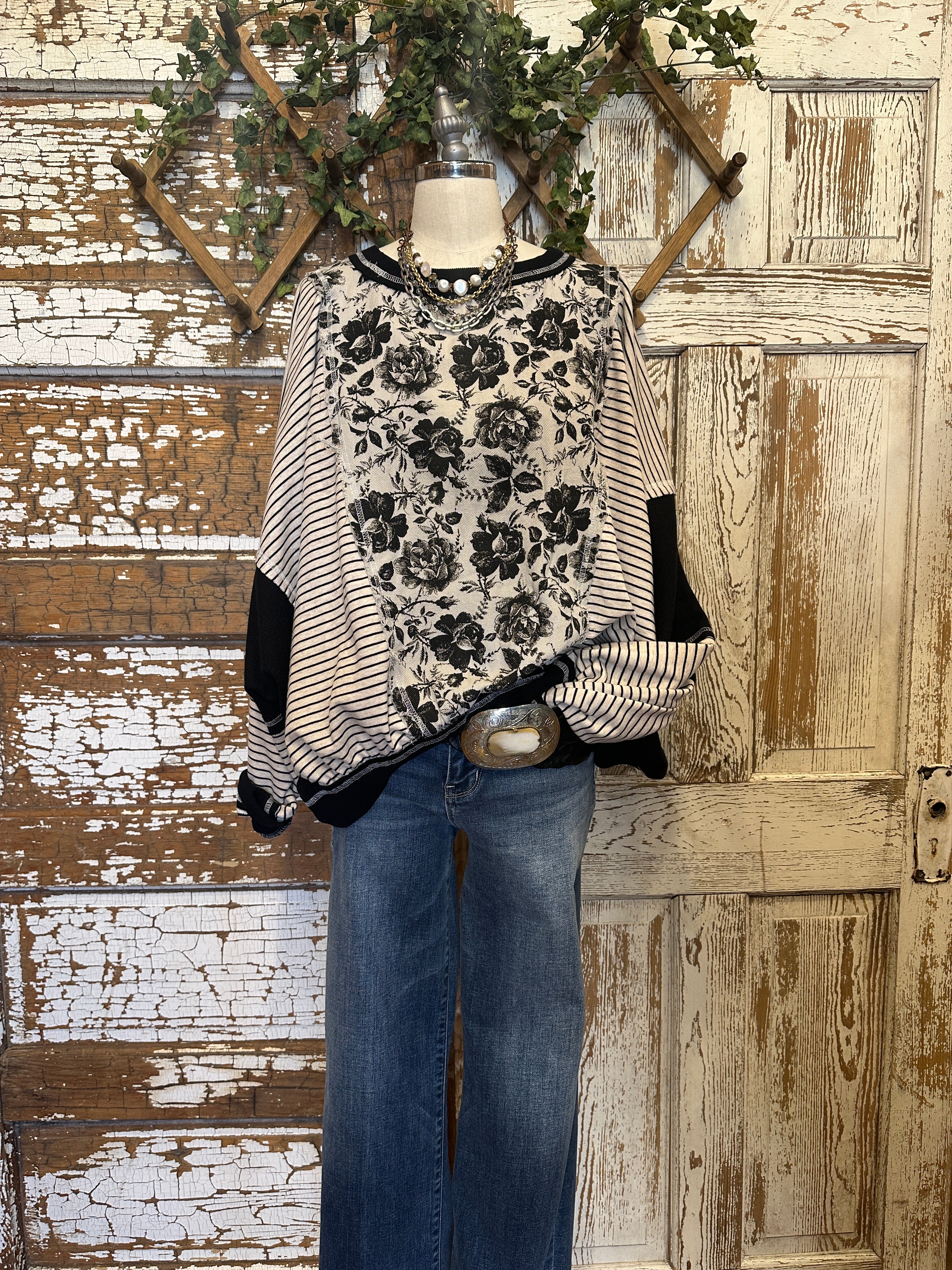 - Unique mixed media design featuring a prominent black and white floral front with striped sleeves and back.