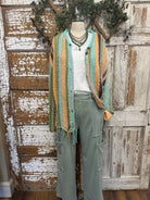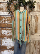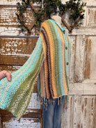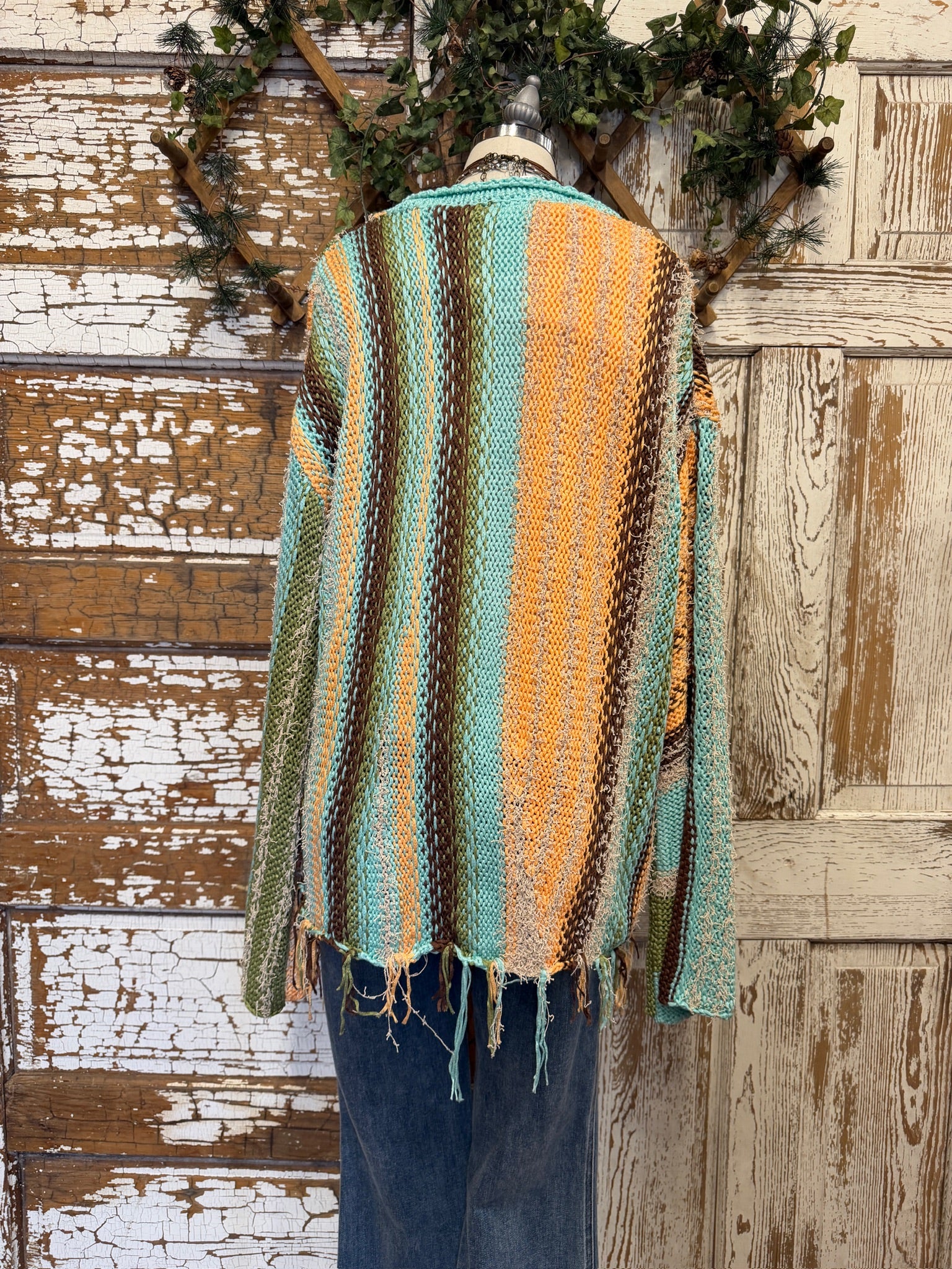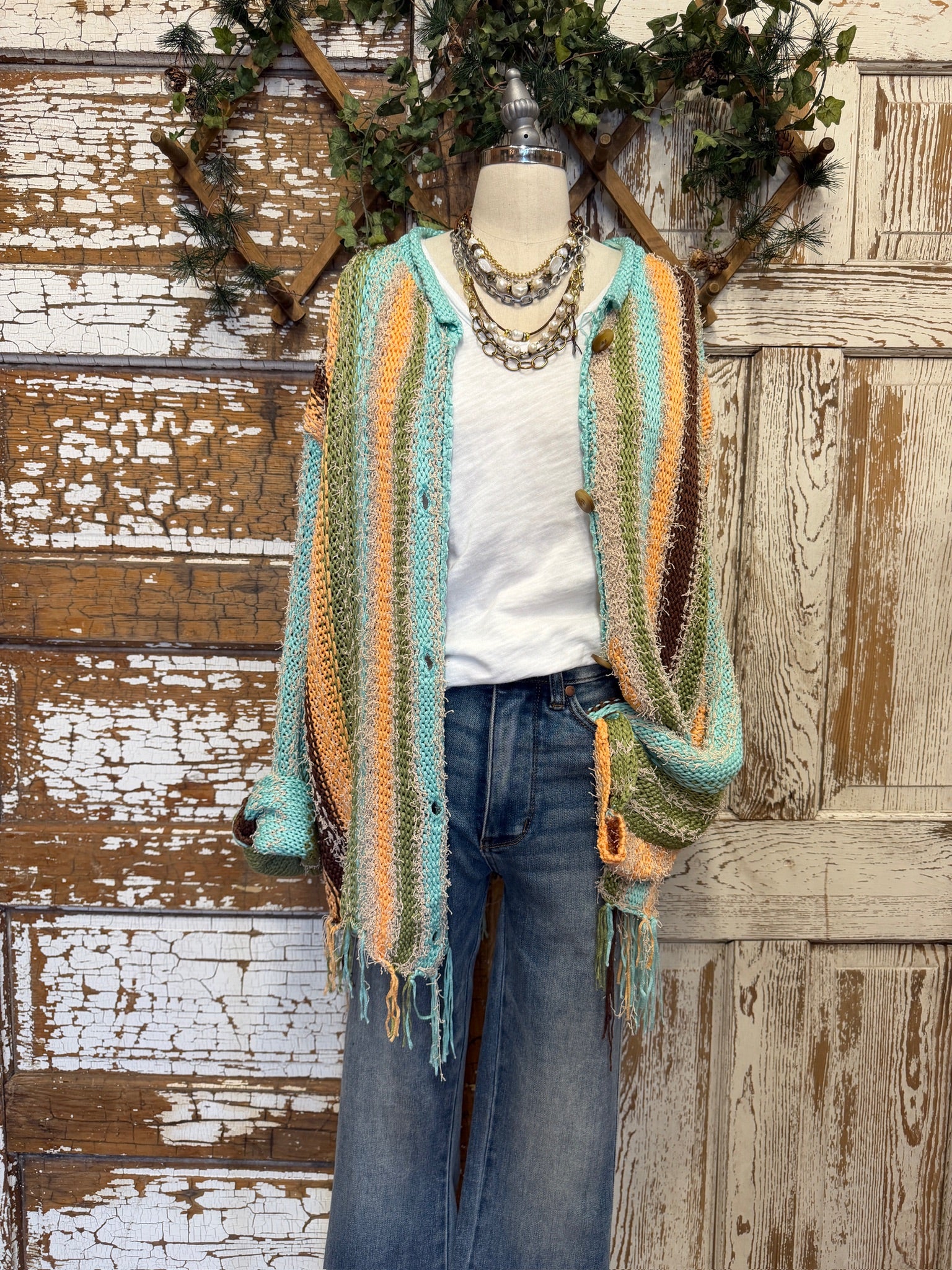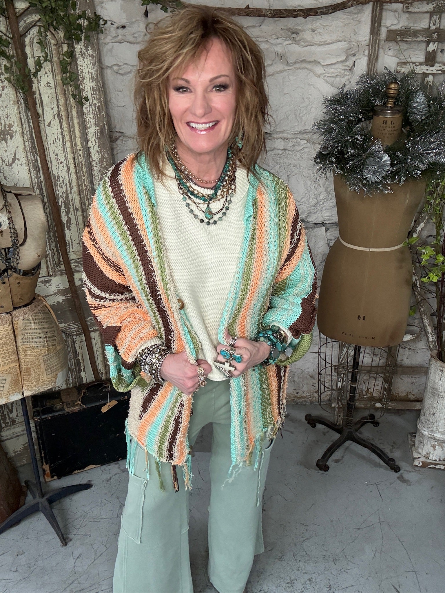 Bring a splash of color and artistry to your wardrobe with our Frosted Fringe Knit Cardigan. This handcrafted-inspired piece features beautifully blended stripes in turquoise, clay, sand, and earthy greens—giving it that sun-washed, free-spirited charm Lu ladies adore. The textured knit, oversized wooden buttons, and playful fringe hem make this cardigan effortlessly unique and full of personality.