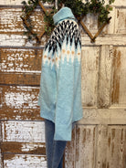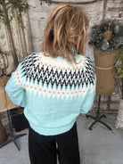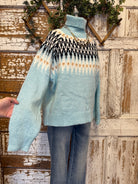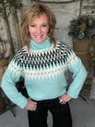 Cozy up in this mint Fair Isle turtleneck sweater featuring soft knit texture, winter-inspired patterning, and a relaxed fit. Easy to style with denim or wide-leg pants for a warm, chic look