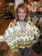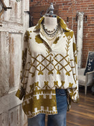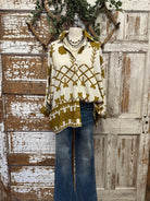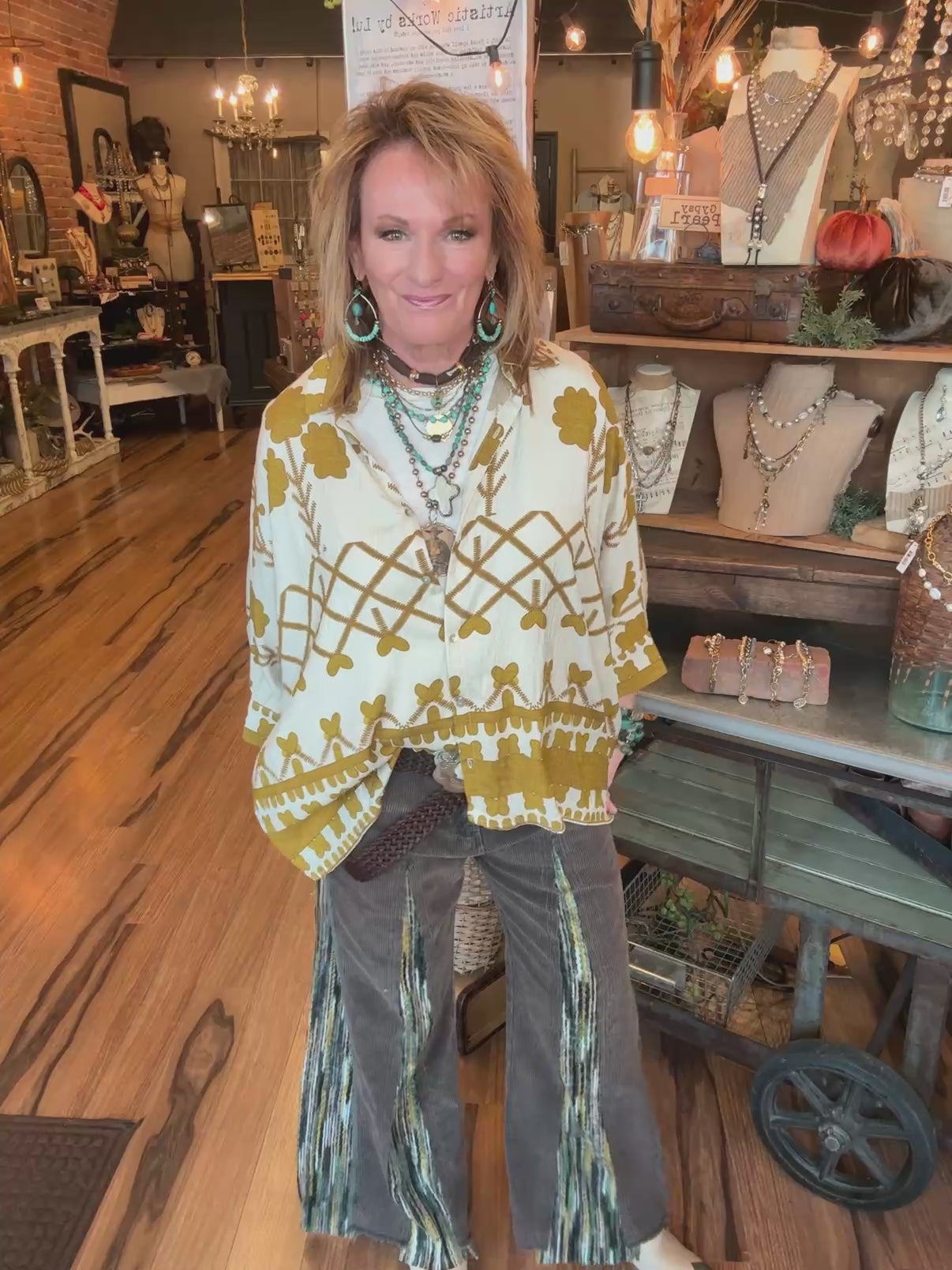 Step into effortless style with our Golden Meadow Blouse — a statement piece that blends comfort, artistry, and boutique charm. This cream-colored blouse features a striking mustard-gold embroidered print inspired by nature and hand-drawn geometry. Its relaxed silhouette drapes beautifully with jeans or dress pants, while the button front and collared neckline add a polished touch. Whether you’re dressing for brunch, work, or a casual day out, this top brings an artistic edge to your boutique wardrobe.