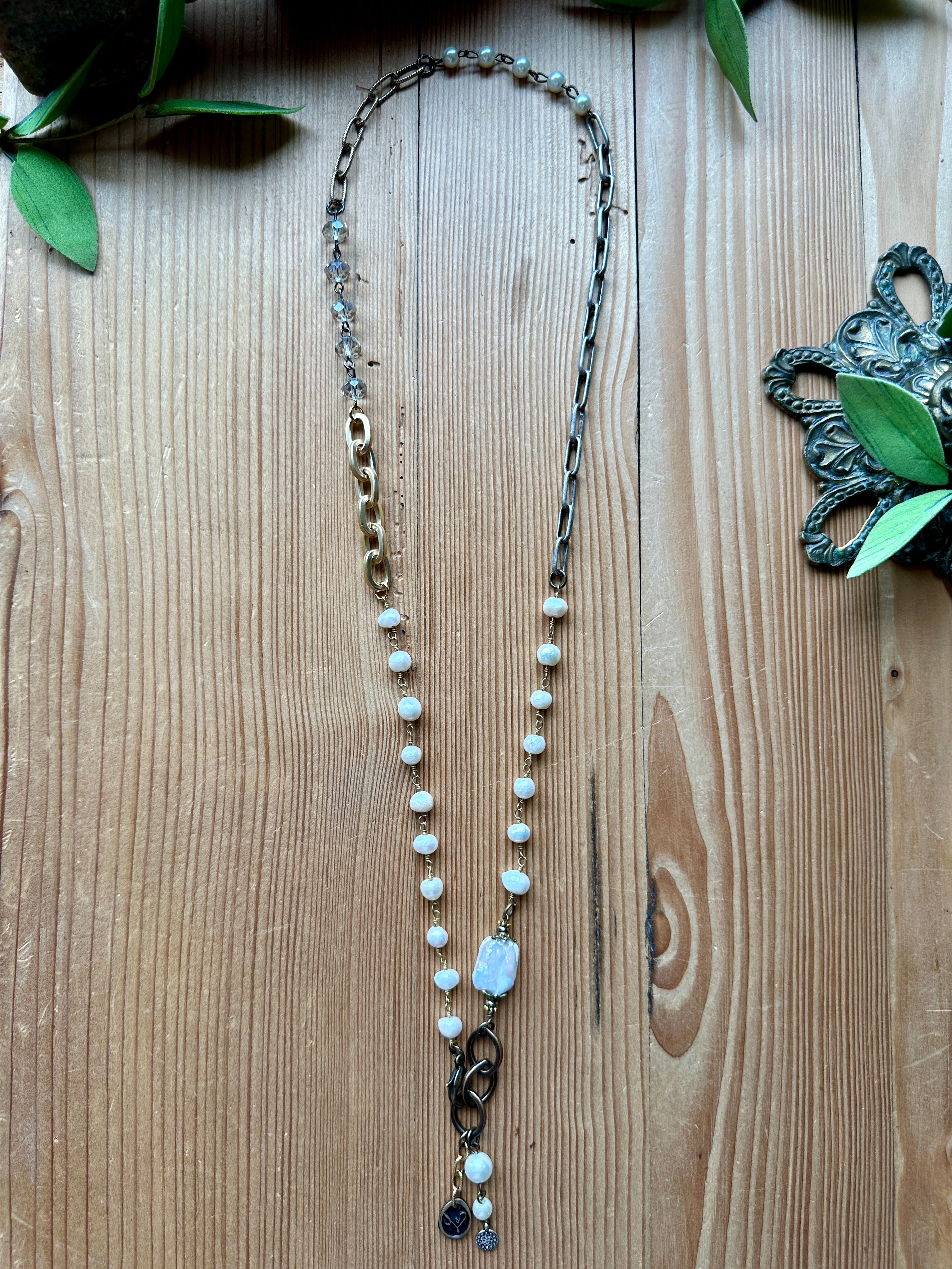 Elegant with a free-spirited twist, this interchangeable necklace from Lu’s Gypsy Pearl Collection blends classic freshwater pearls with edgy mixed metal chain for a look that’s both timeless and modern. Accented with clear faceted crystal beads for a subtle sparkle, this handcrafted design layers beautifully and pairs effortlessly with your favorite Lu pendants.