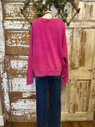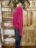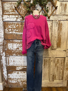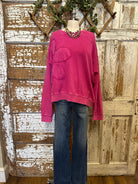 Make a statement with the Harvest Fuchsia Flower Appliqué Sweatshirt — bold, vibrant, and effortlessly chic. The bright pink washed fabric is soft and eye-catching, while the oversized appliqué flower adds unique artistic flair. A boutique favorite that turns casual into standout style.