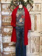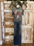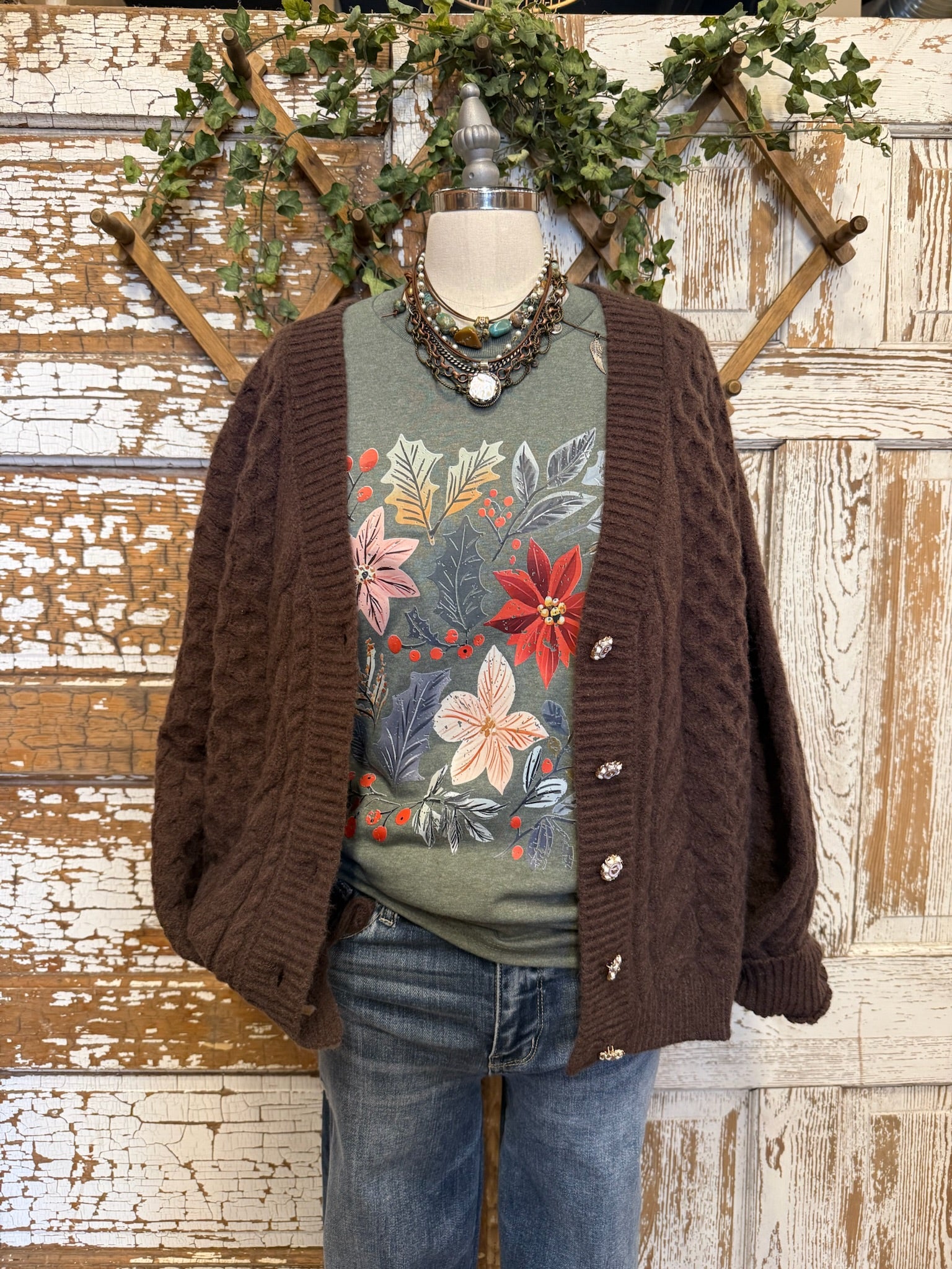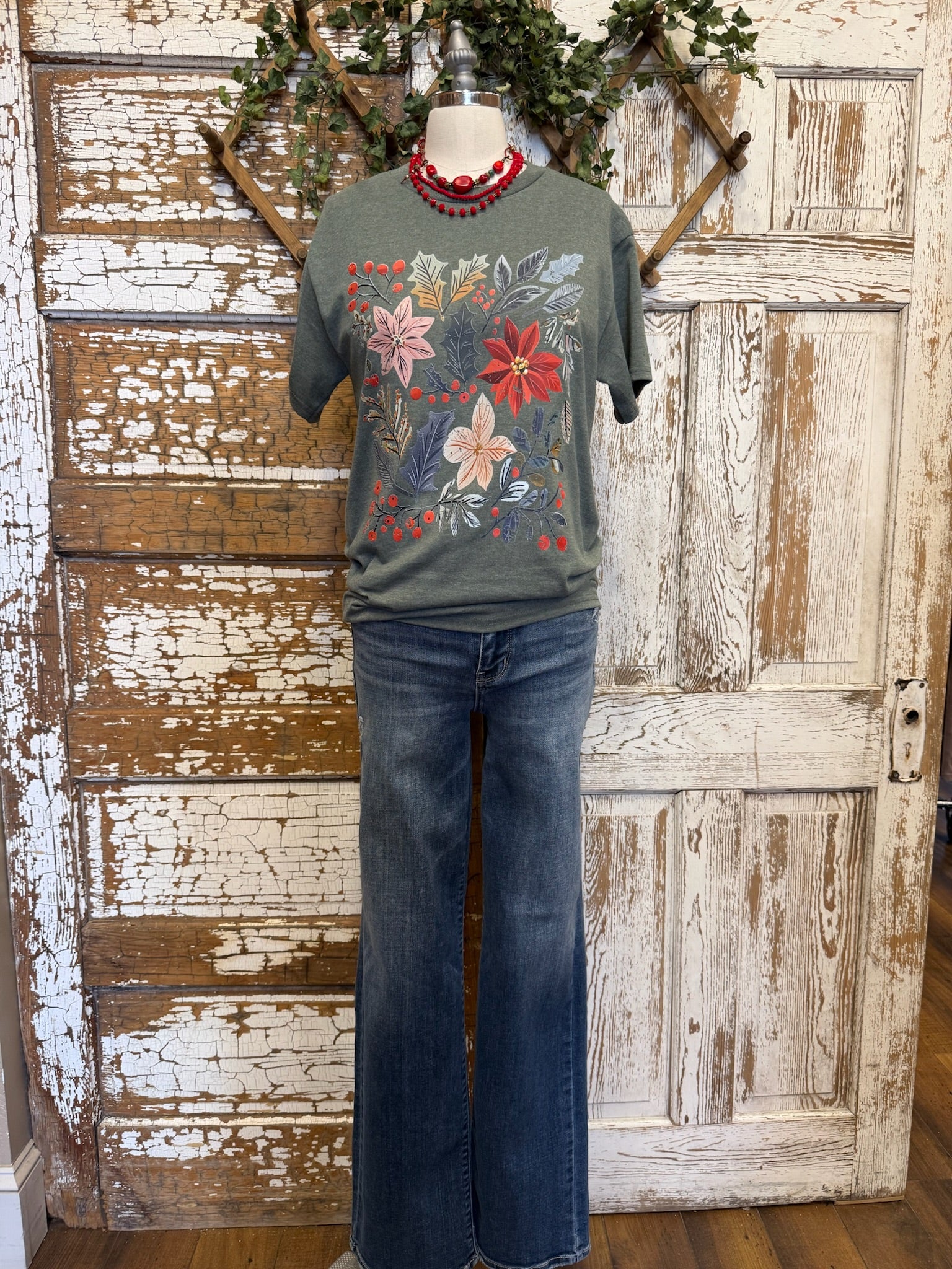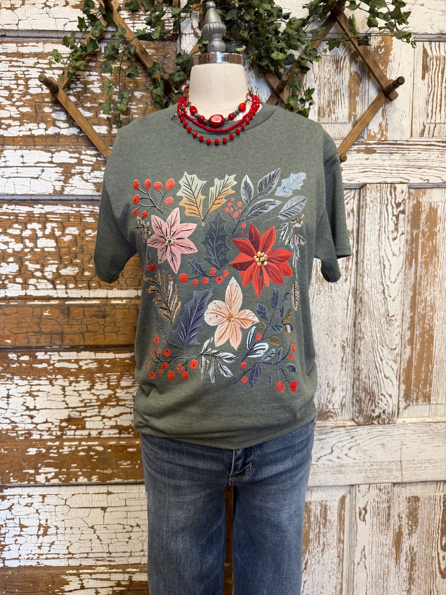 This soft forest-green graphic tee brings a garden of winter florals to your wardrobe. Poinsettias, berries, and leaves bloom across the front for a festive yet feminine holiday look.