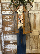 - Trendy leopard print body with contrasting tan corduroy accents for a unique mixed-material look.