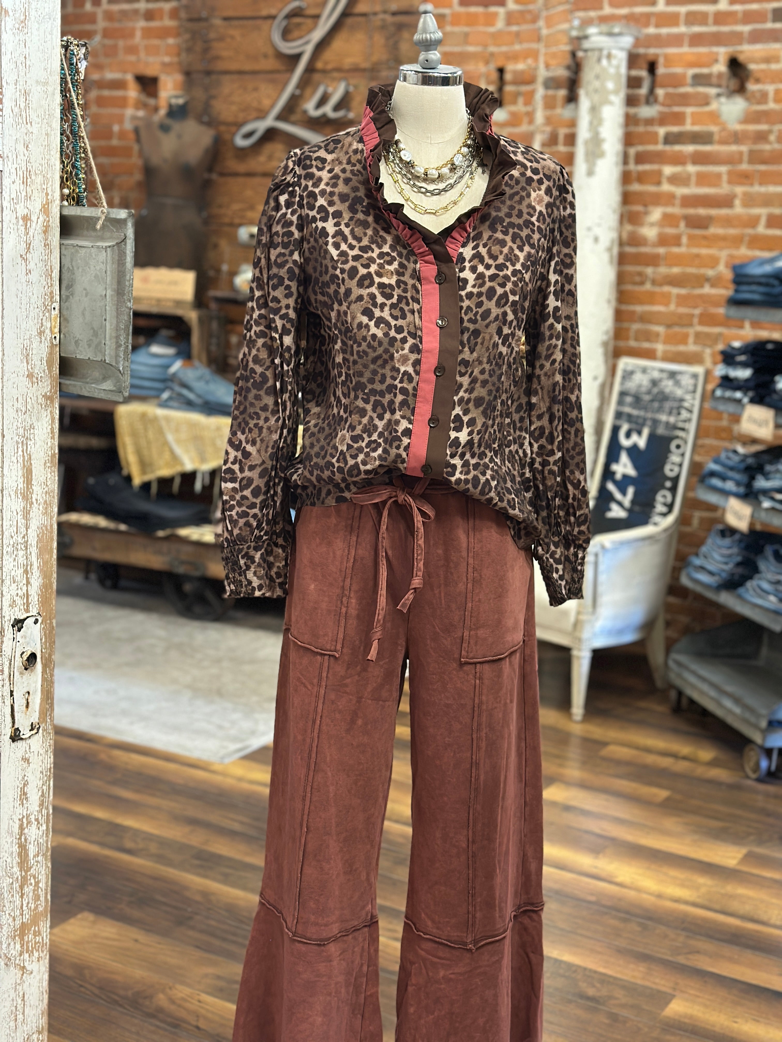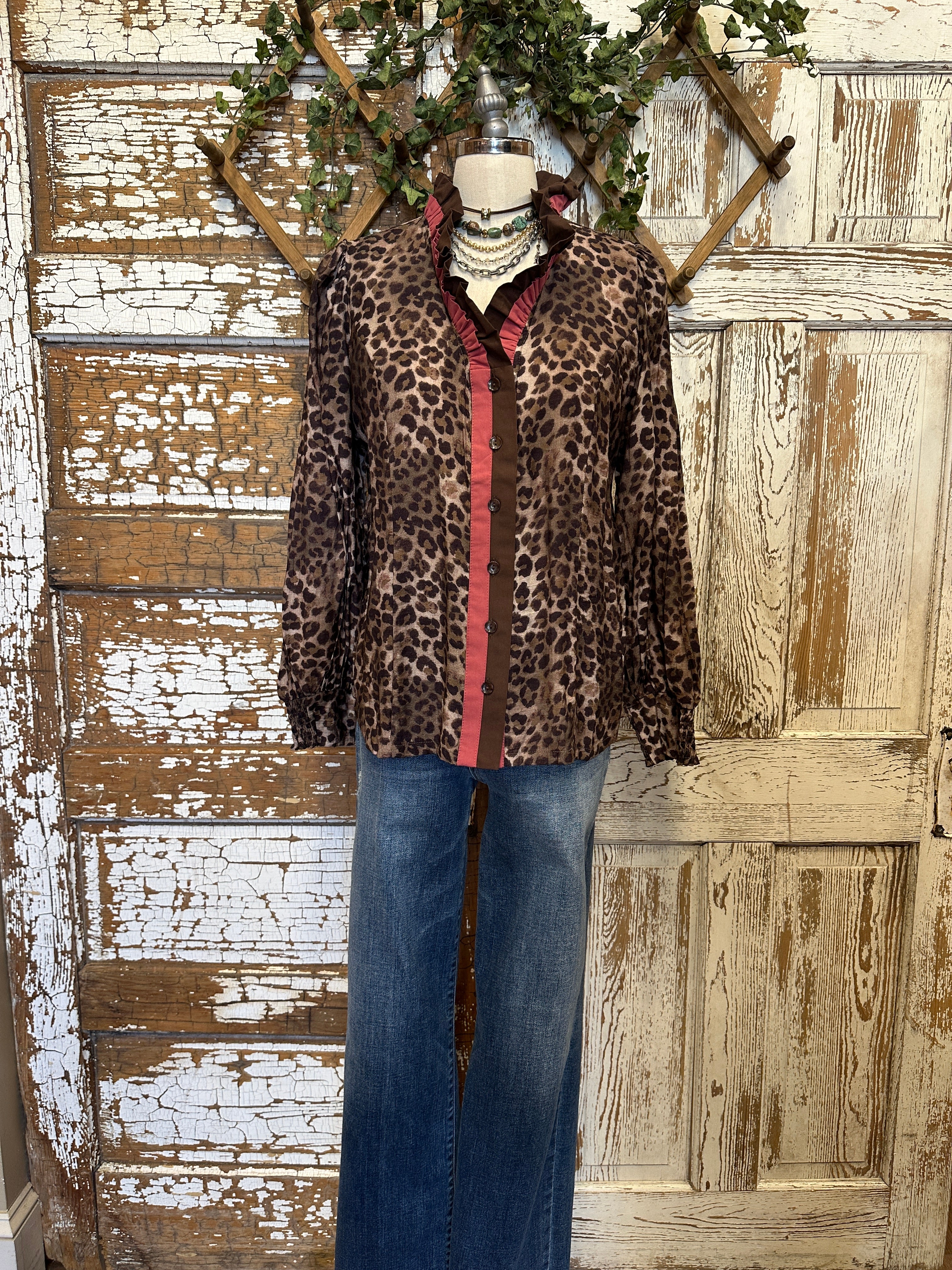 Chic Leopard Print Ruffle Blouse - Long Sleeve Button-Down Top for Women