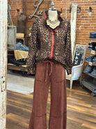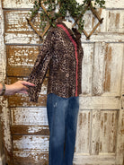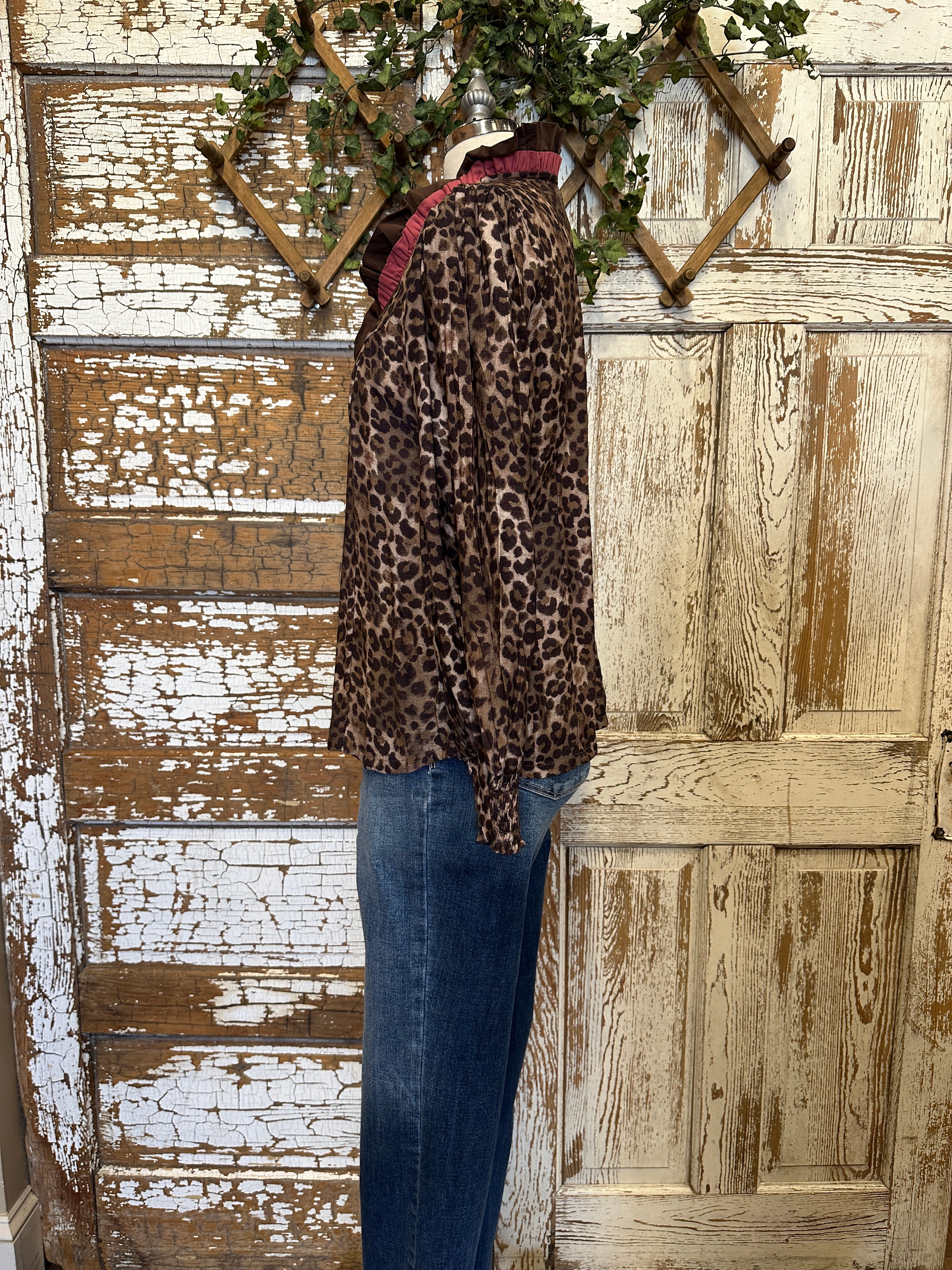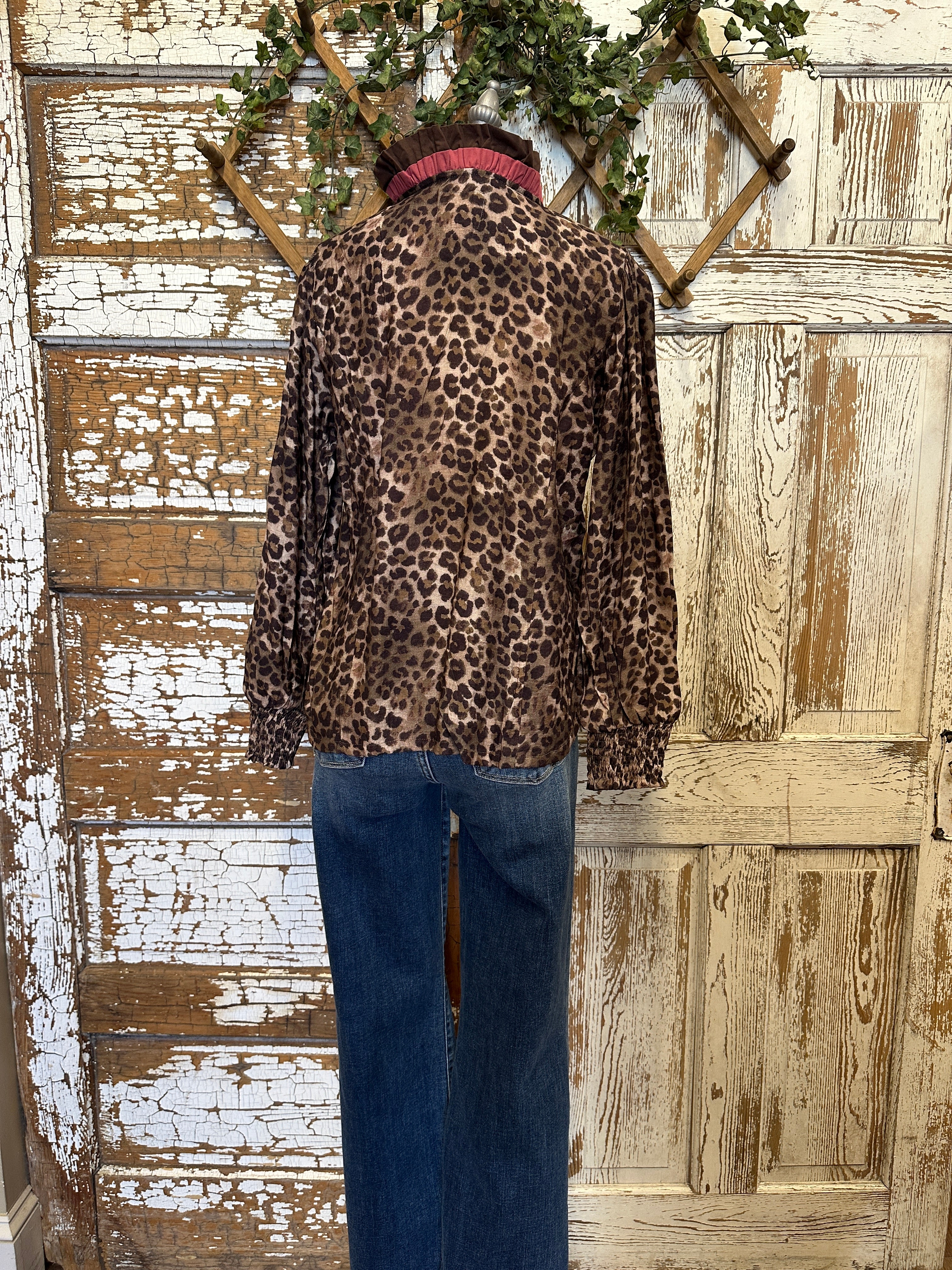 Embrace your wild side with this exquisitely designed leopard print blouse. Featuring a captivating animal print, this long-sleeve top effortlessly combines classic elegance with a touch of modern flair, making it a standout addition to any wardrobe.