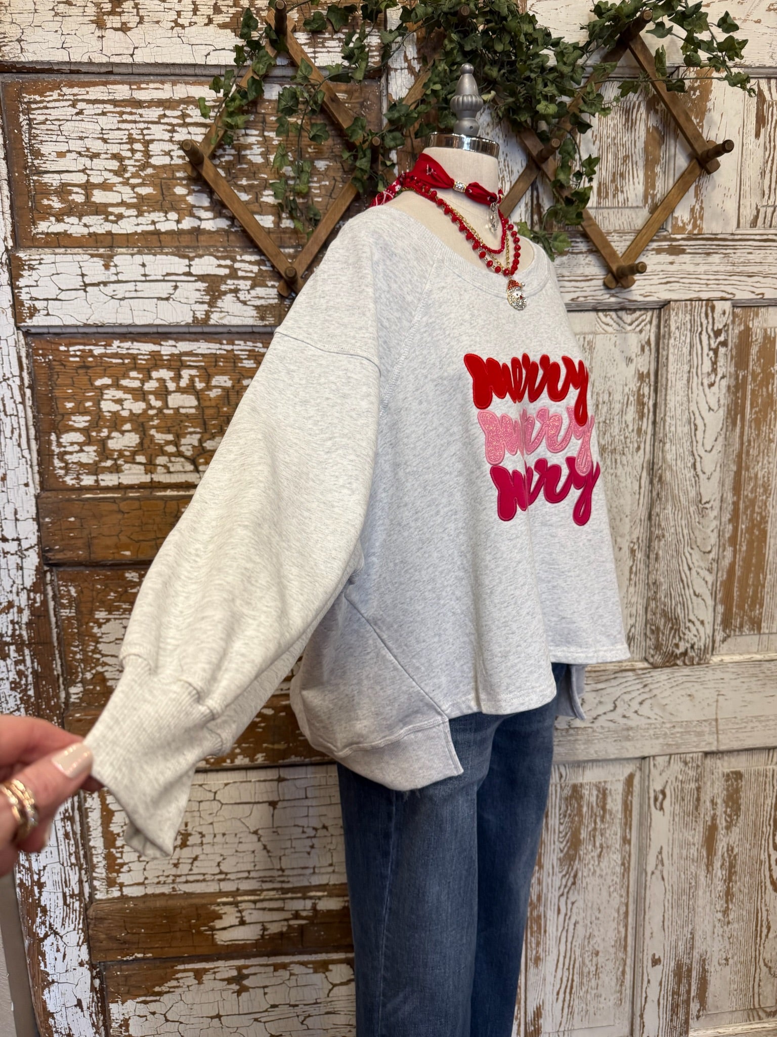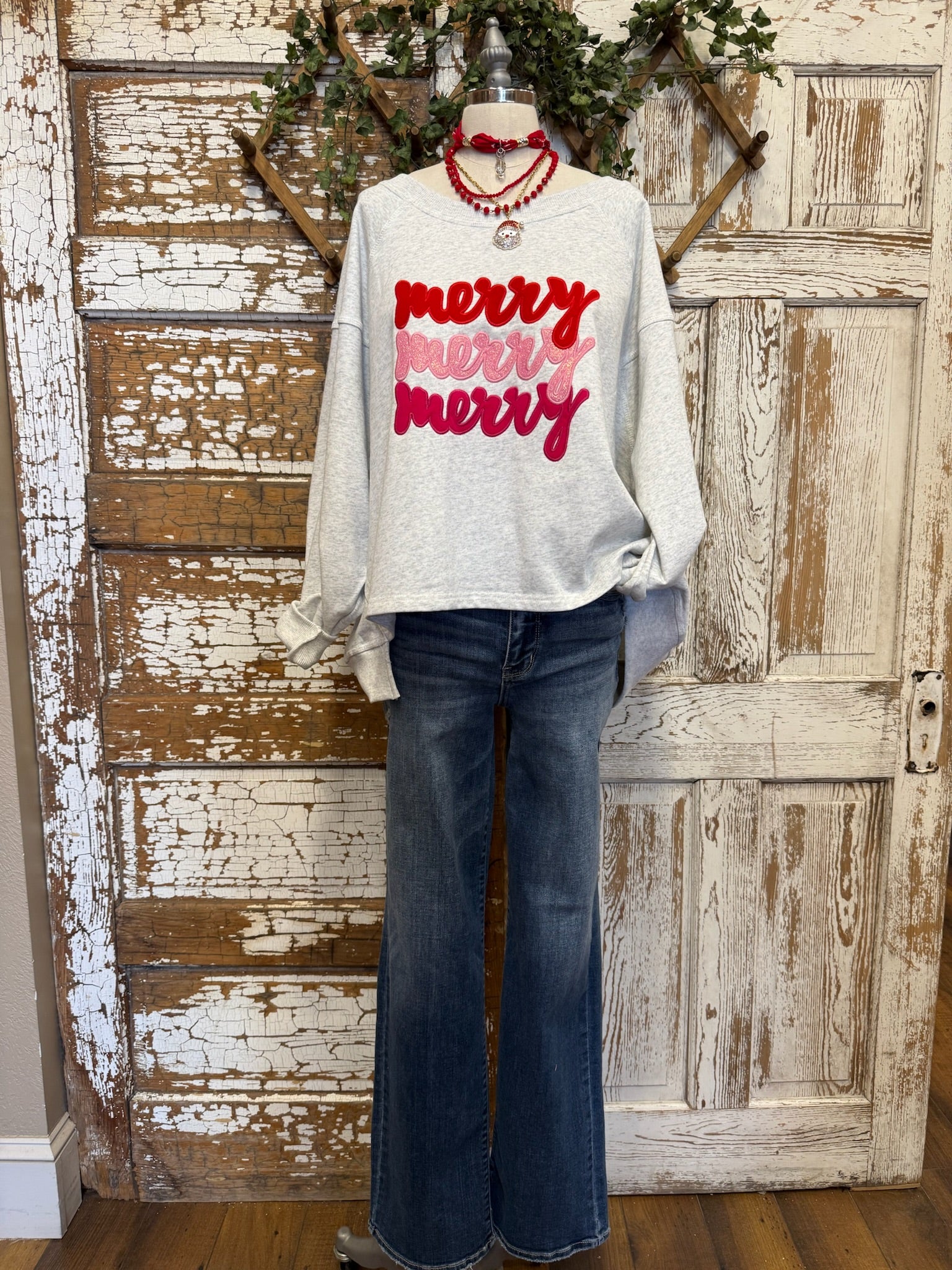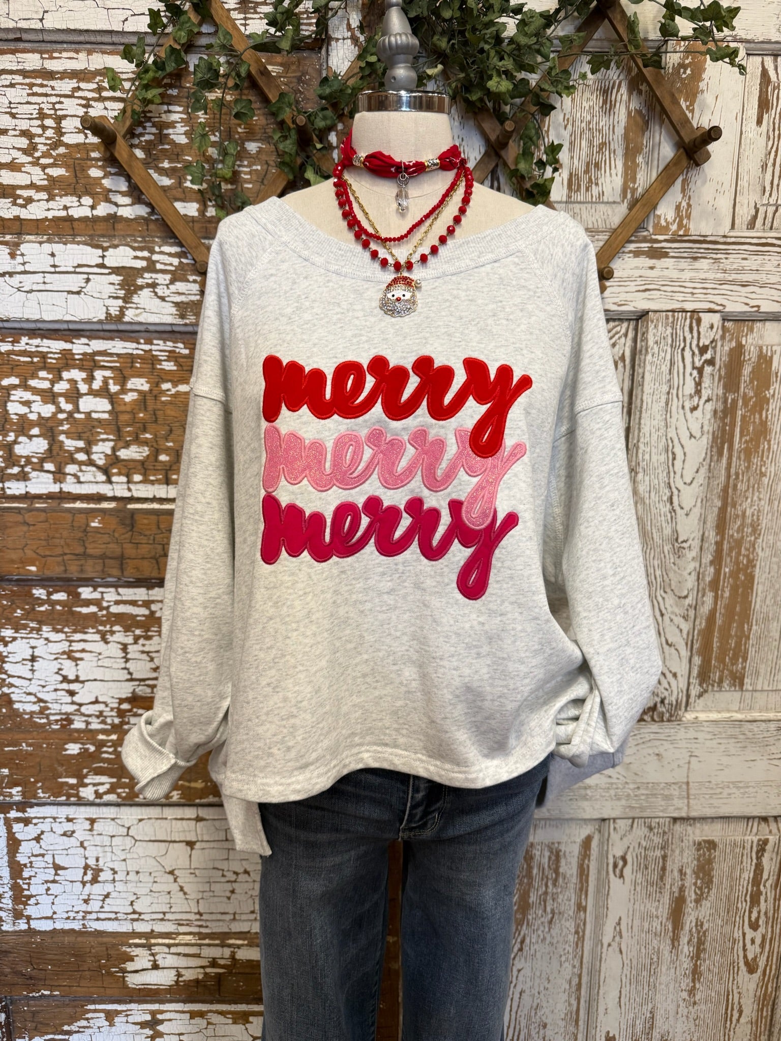 Stay cozy and cute in this “merry merry merry” sweatshirt. Plush appliqué letters in shades of red and pink pop against soft heather grey for a fun, cheerful holiday look.