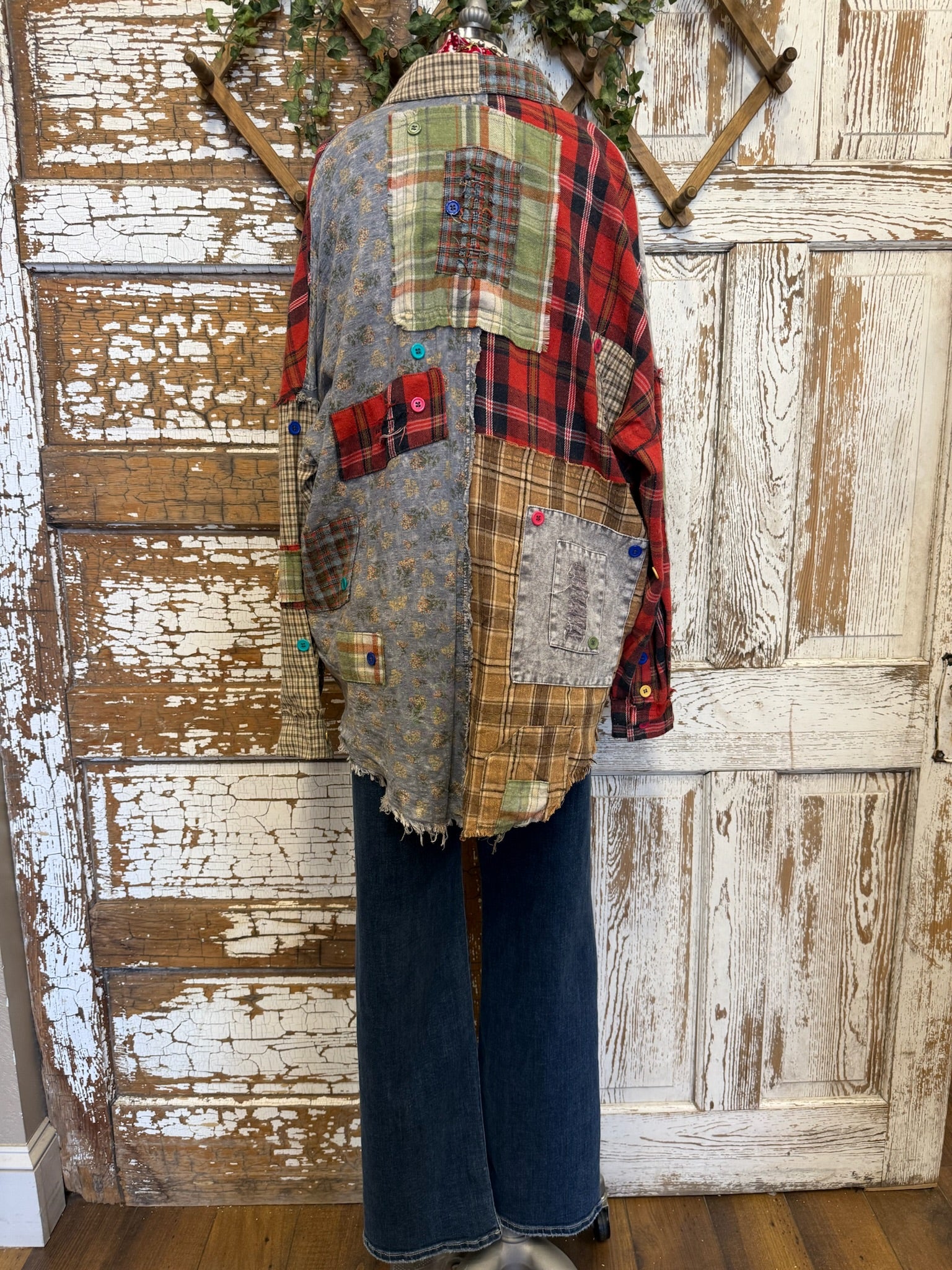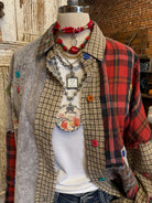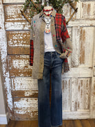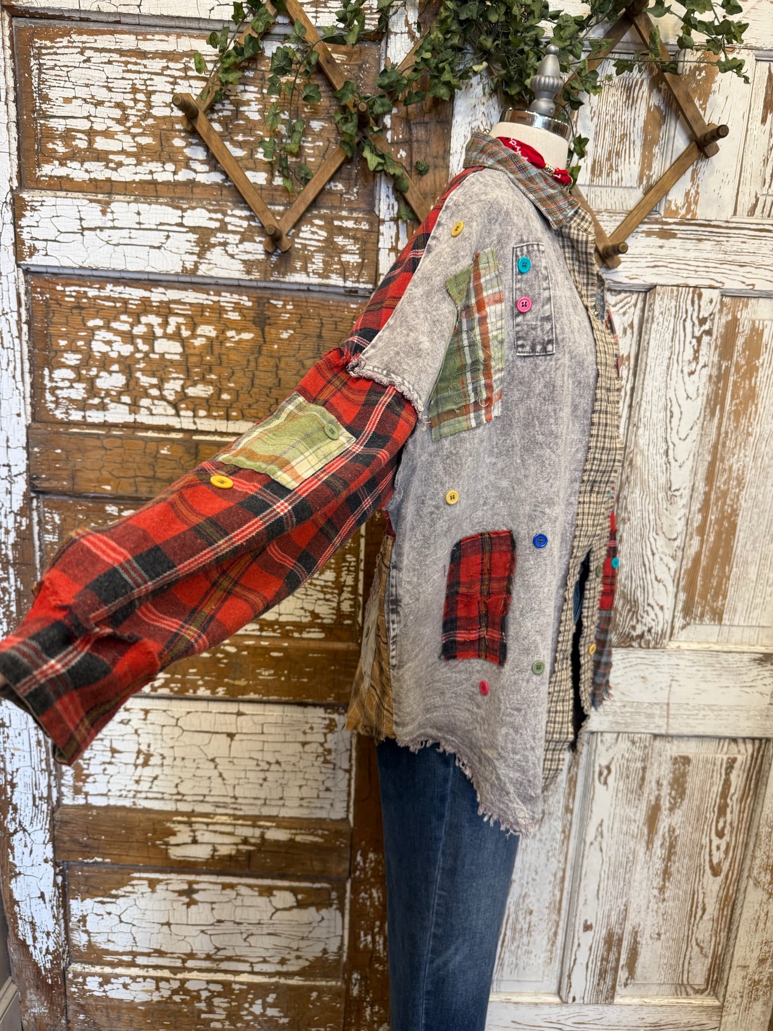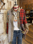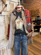 This patchwork shacket brings all the cozy Christmas cabin vibes. With mixed plaids, checks, and colorful buttons, it’s a statement layer that instantly makes your basics feel special.
