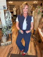 Add a playful twist to your outfit with the Navy Pinstripe Vest, featuring a classic button front. Pair it with Lu's Navy Pinstripe pants for a coordinated look that’s both sharp and fun.