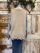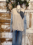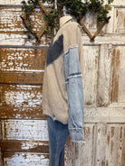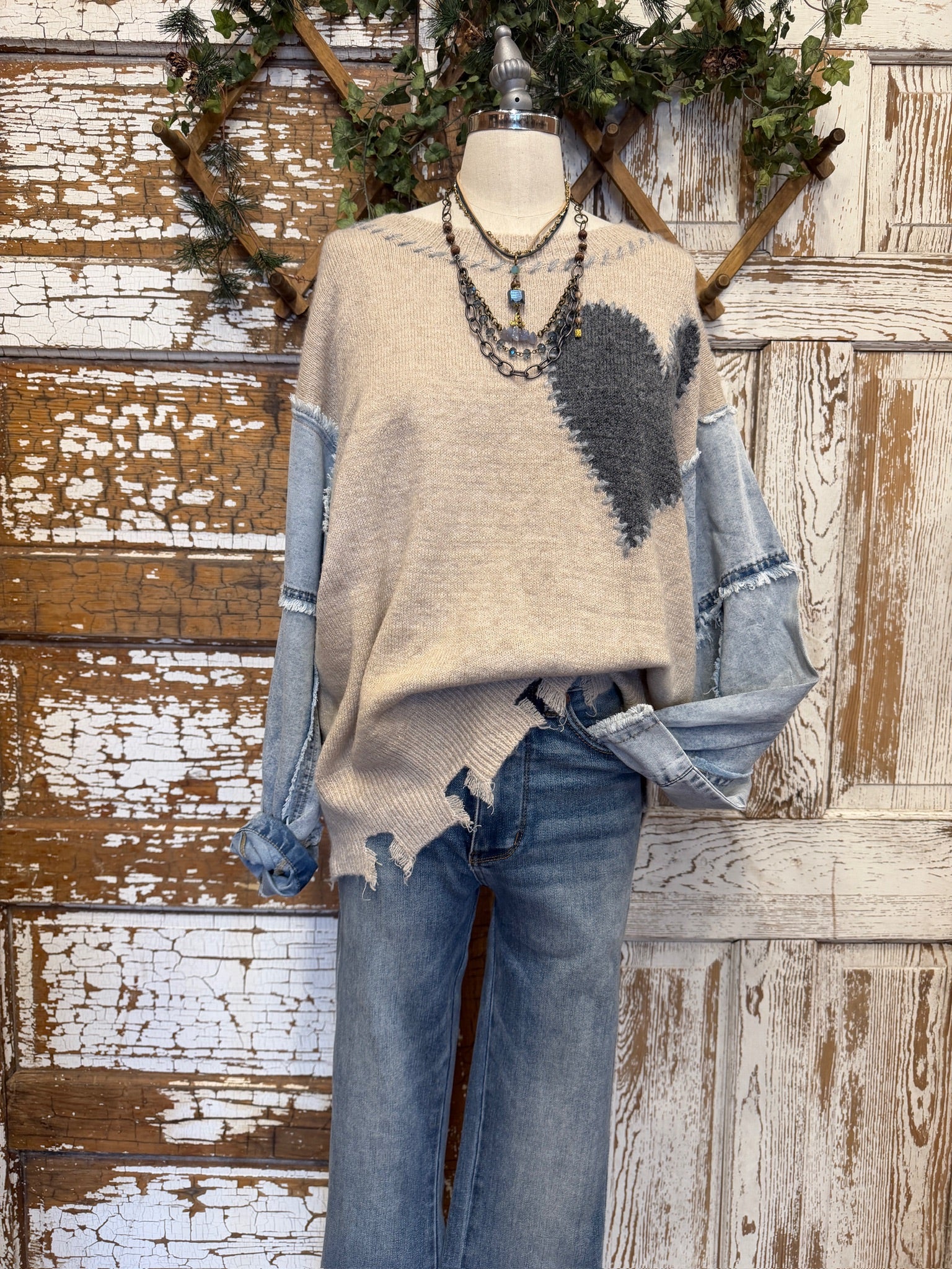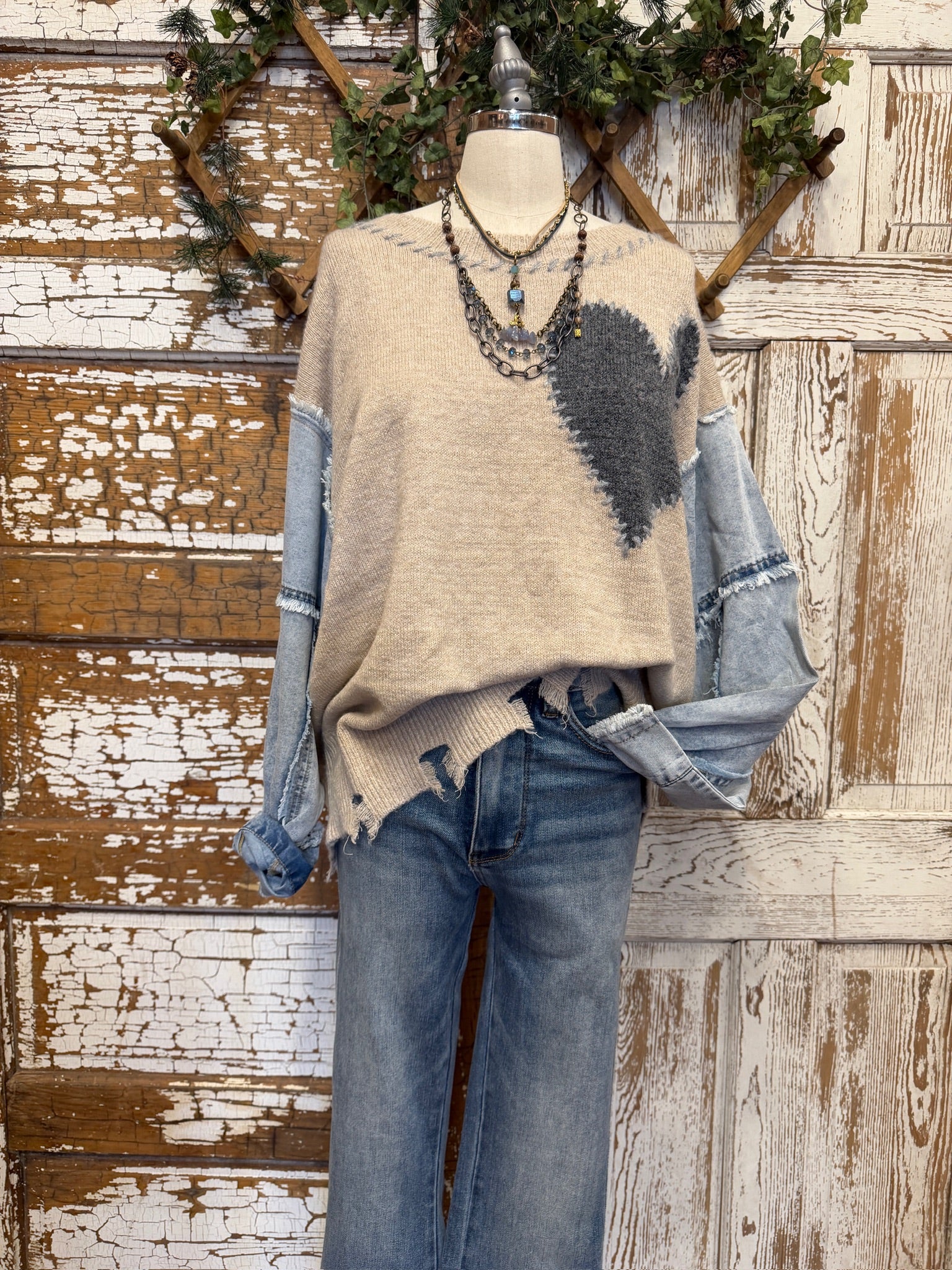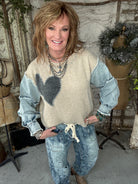 Show off your playful side with this patchwork heart sweatshirt featuring denim sleeve accents and frayed detailing. A comfy, artsy piece that pairs perfectly with joggers or denim.