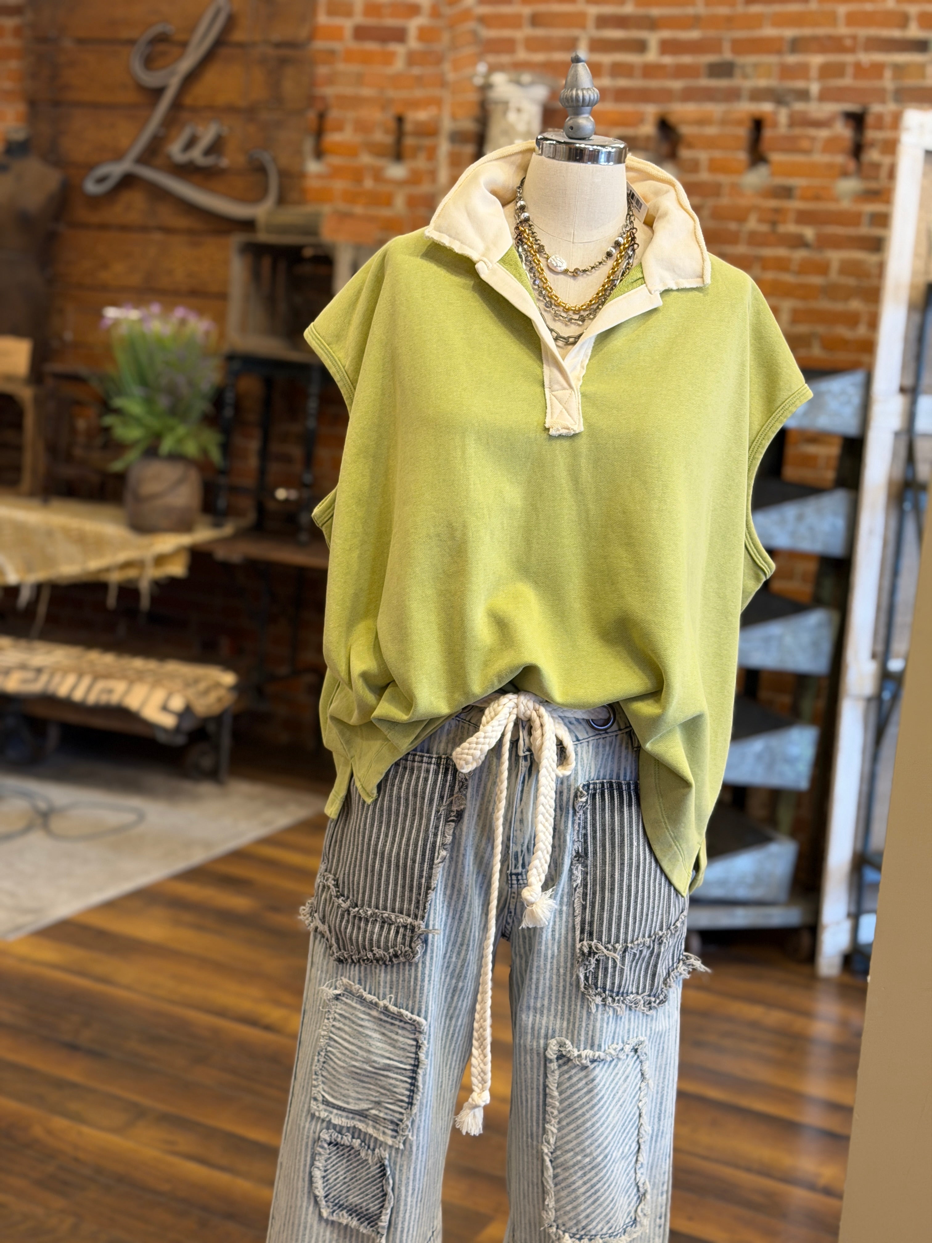 A fresh twist on a classic—this pistachio popover polo knit top features a bold contrast collar that gives it that effortless “styled without trying” feel.