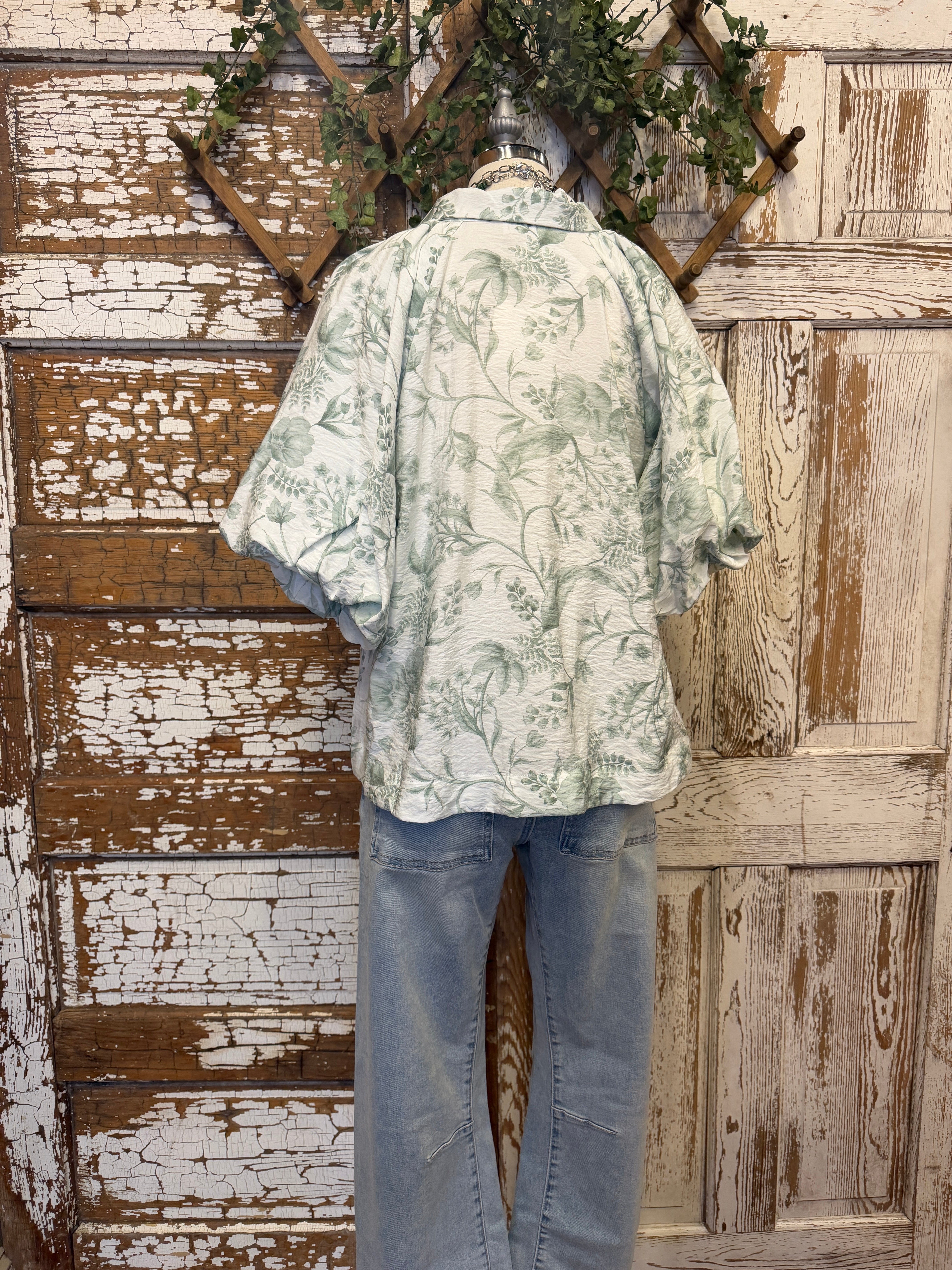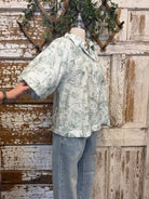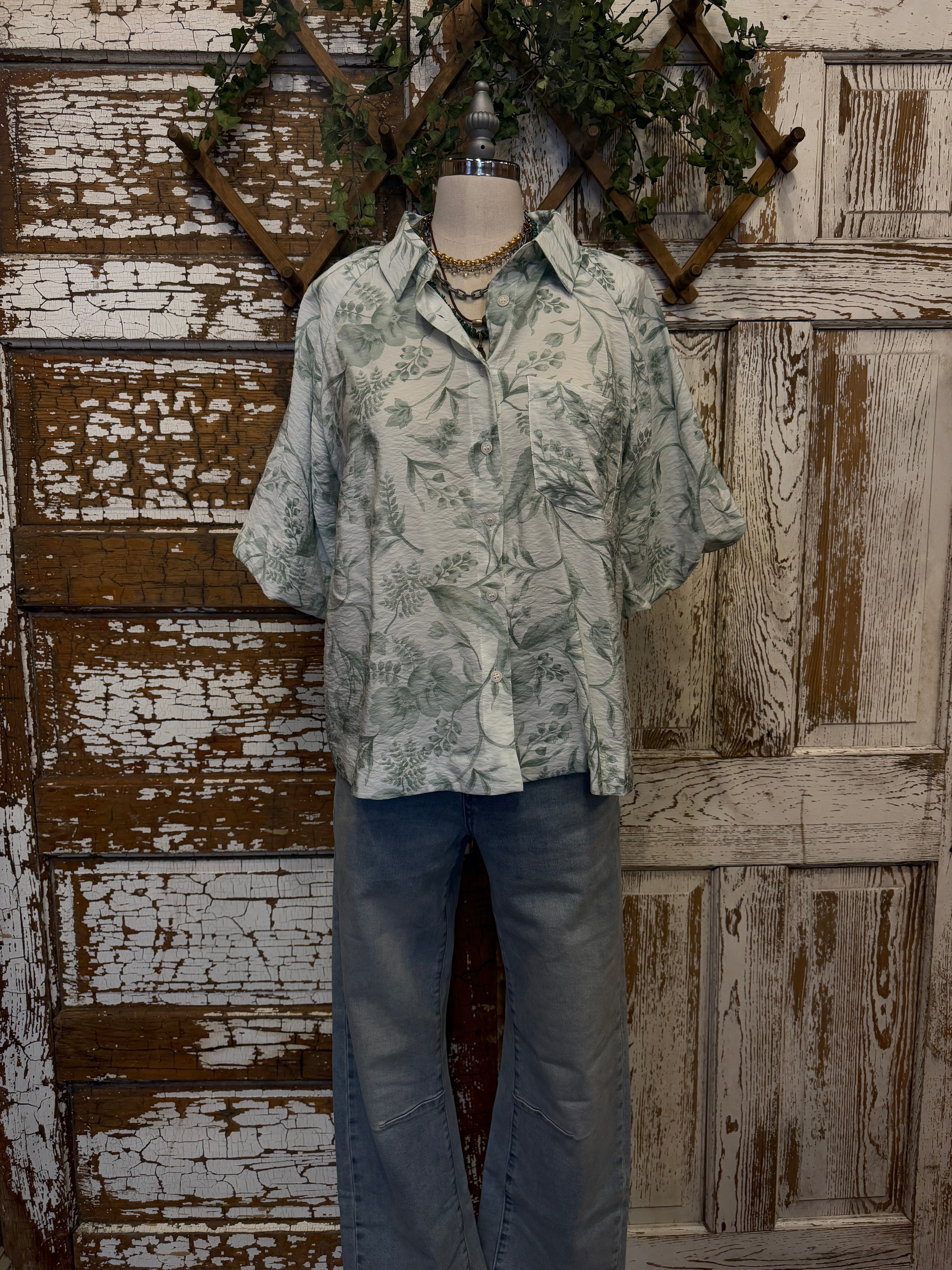 Embrace effortless cottagecore charm with this lightweight sage green floral blouse, featuring trendy puff sleeves and a classic button-down front. This breezy, botanical-inspired top offers a relaxed silhouette that pairs perfectly with your favorite denim for a fresh, feminine look. Elevate your everyday style with this versatile, high-impact summer essential.
