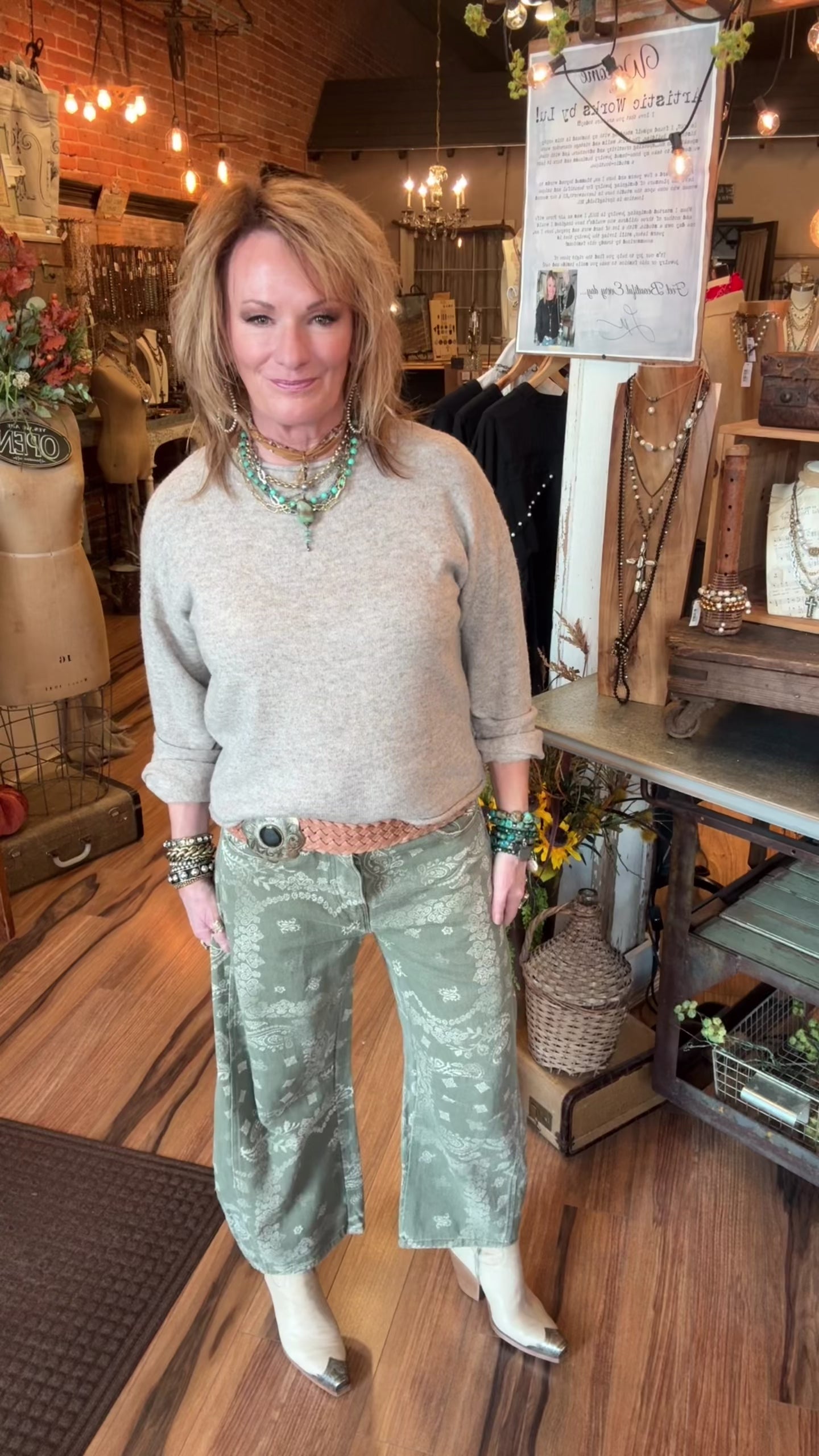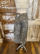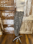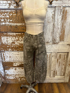A fresh twist on classic denim, these paisley wide leg pants combine vintage-inspired style with everyday comfort. Designed for the woman who loves pieces that tell a story, this pair features a soft neutral wash and subtle paisley print that feels both timeless and artistic. The relaxed wide leg silhouette and mid-rise fit make these pants perfect for effortless, all-day wear.