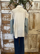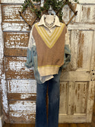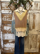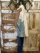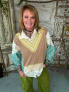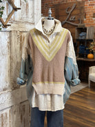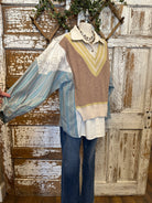 The Sagewood Sweater Blouse is a boutique favorite that makes fall layering effortless. Designed as an all-in-one top, it combines the look of a cozy knit vest, a collared shirt, and patterned sleeves — no extra layers required. With earthy taupe, soft sage accents, and chambray-inspired sleeves, this unique blouse brings both comfort and style to your wardrobe. Perfect for pairing with wide-leg pants, denim, or skirts, it’s the ultimate statement piece for boutique clothing lovers this season.