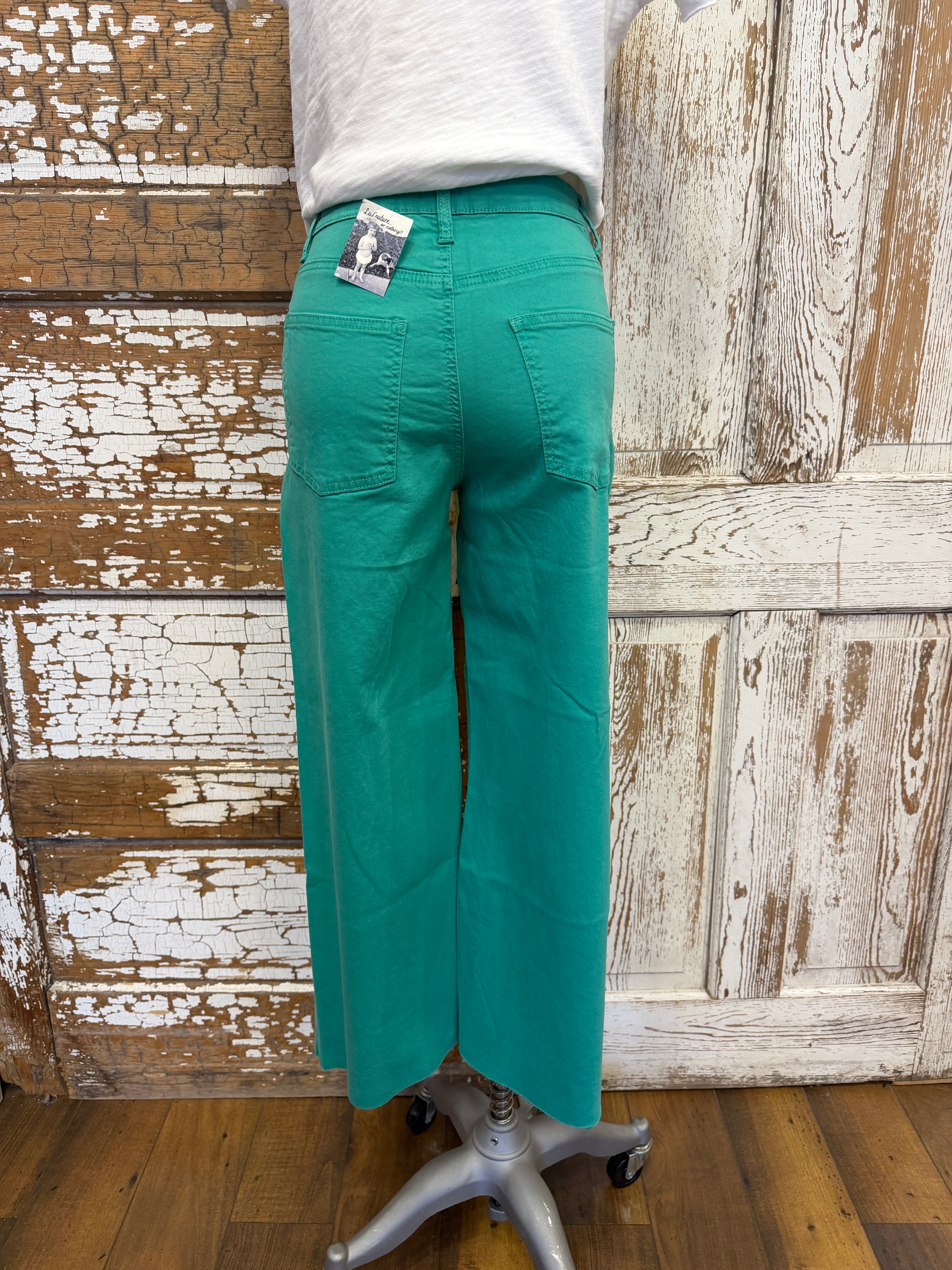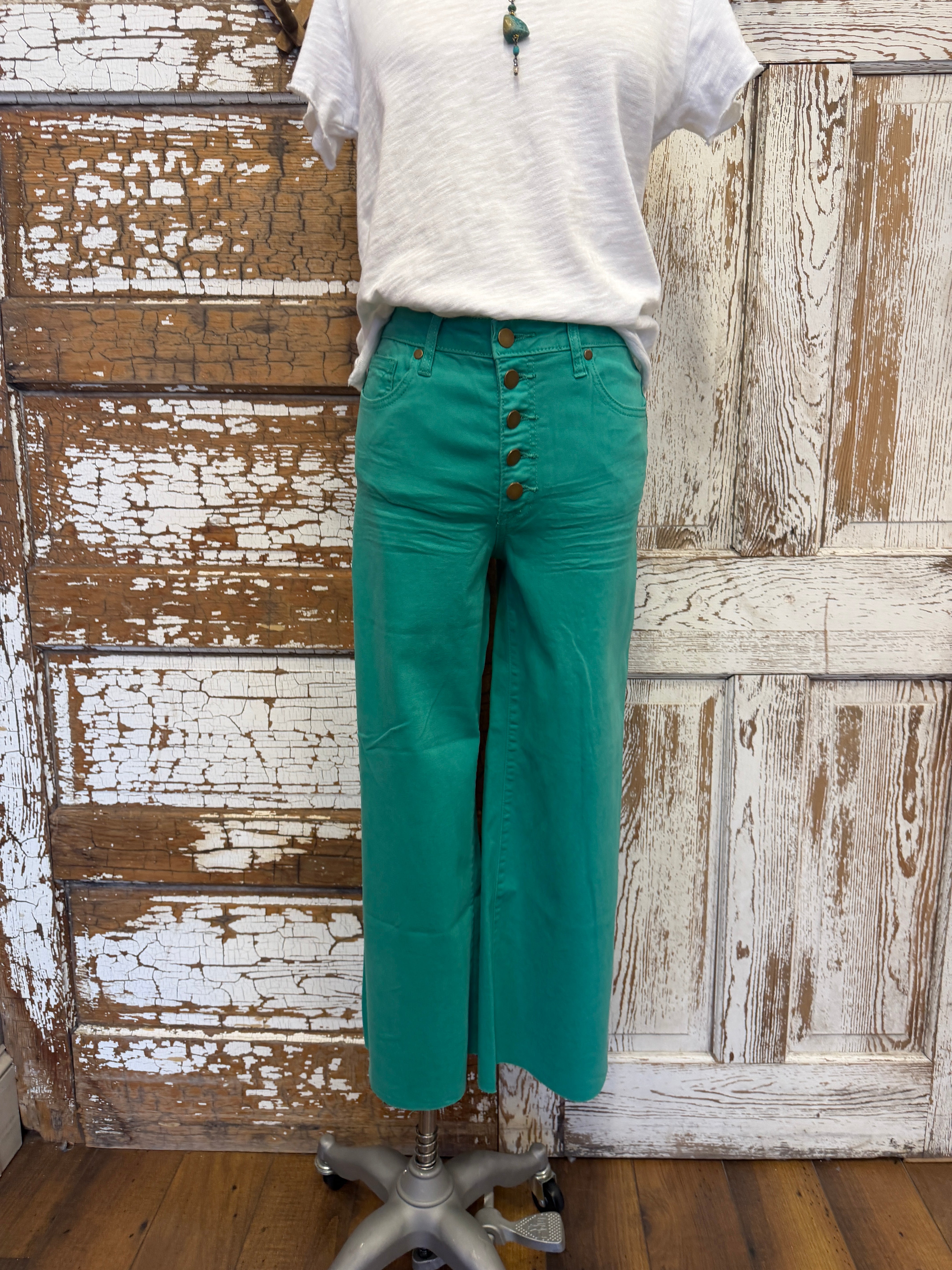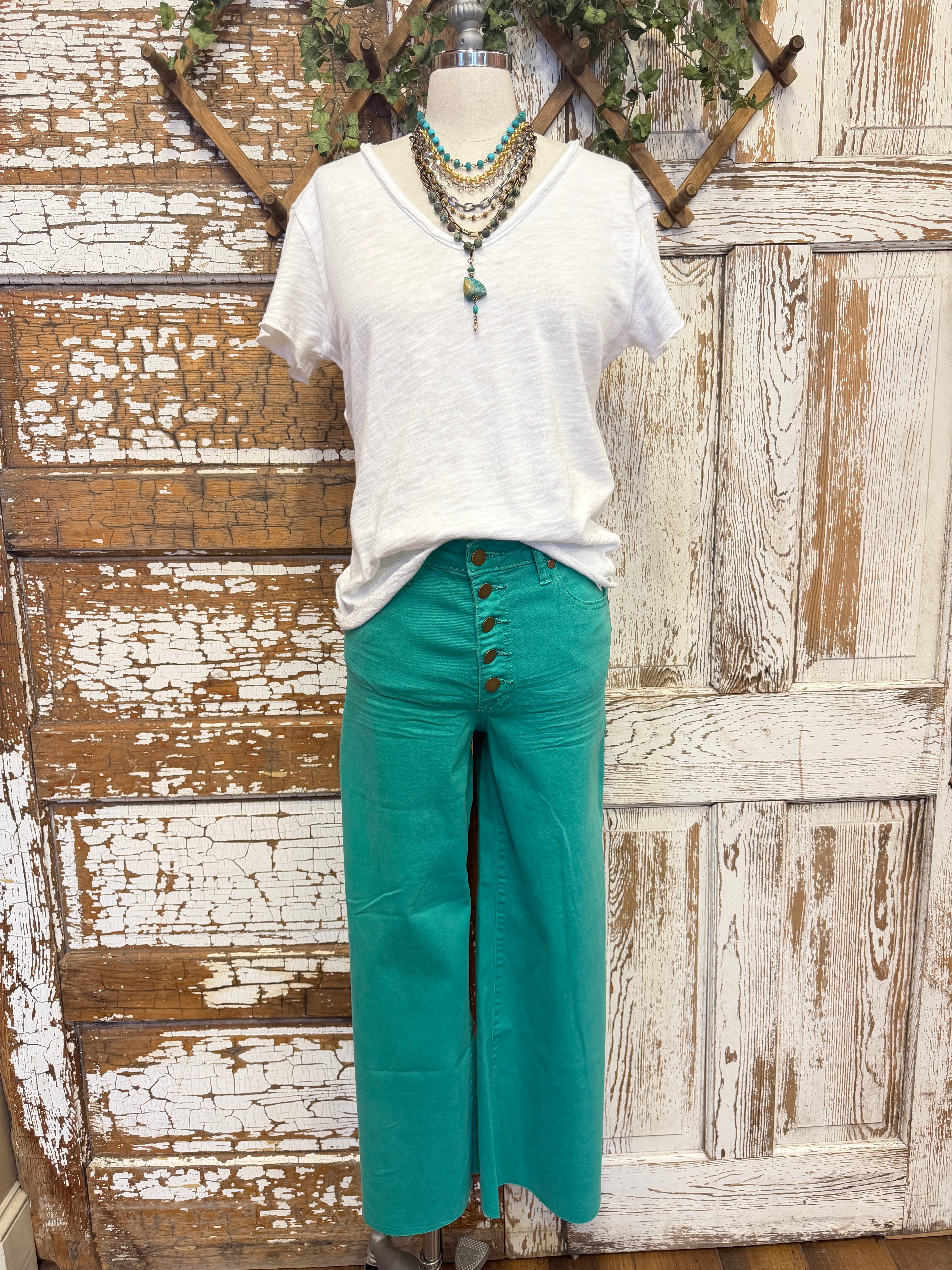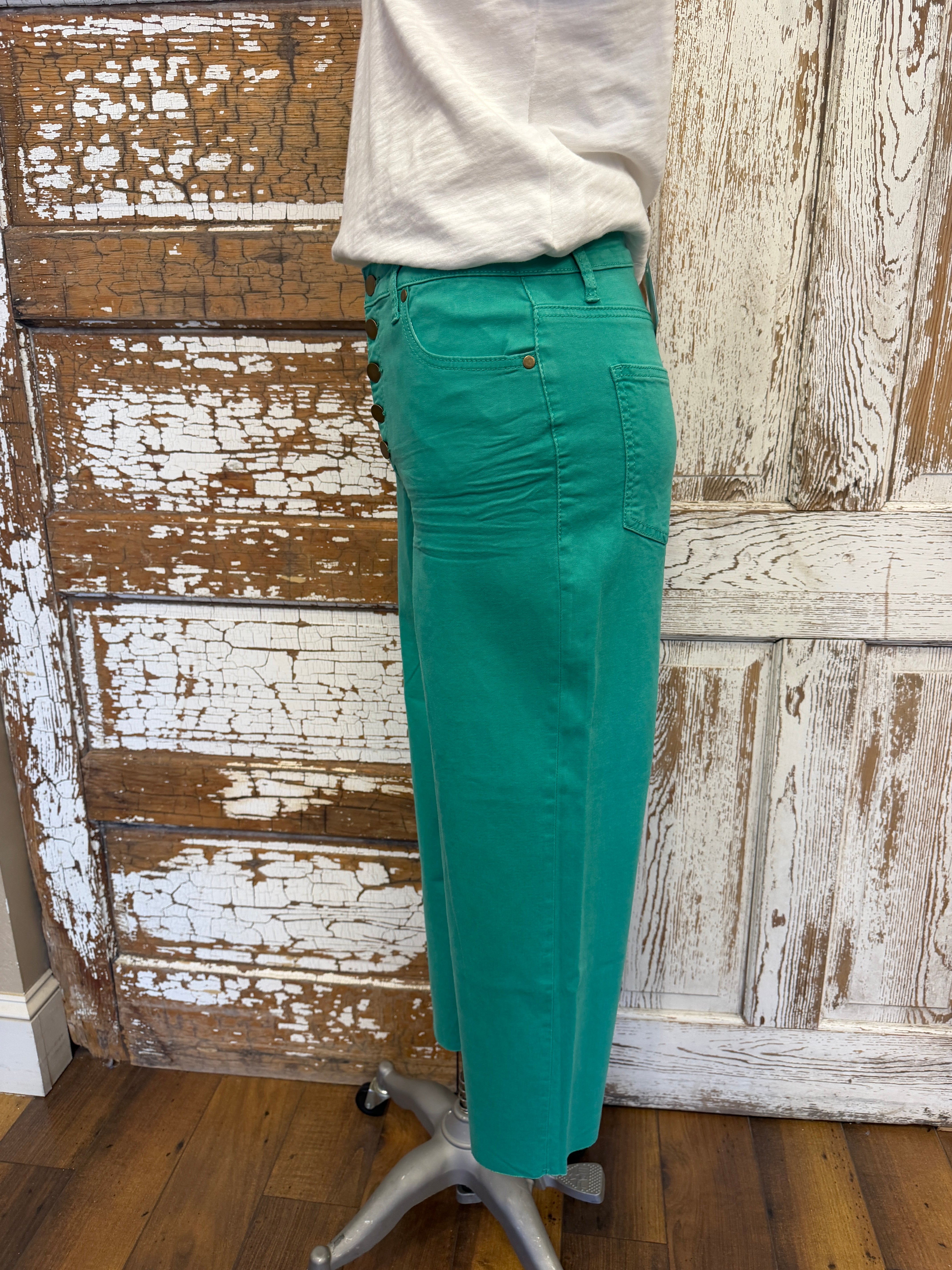 Transform your everyday style with these vibrant teal wide-leg pants featuring a sophisticated multi-button front. The edgy raw hemline meets a classic straight-leg cut for an effortlessly chic, bohemian silhouette. Perfect for making a bold statement while staying completely comfortable.