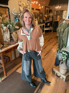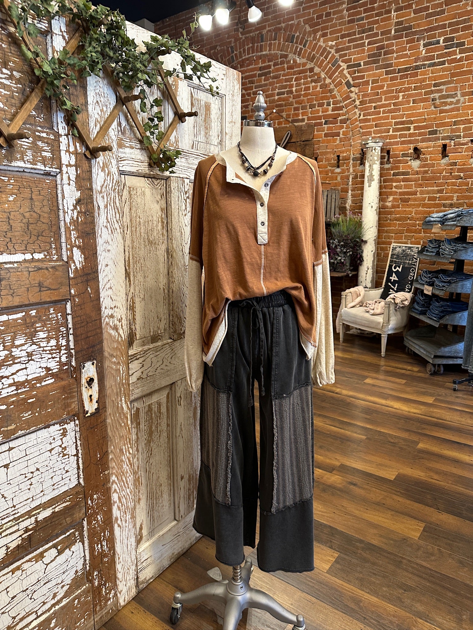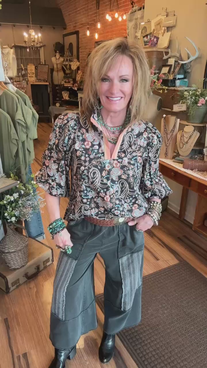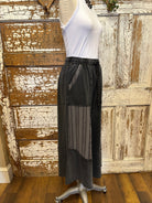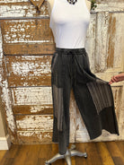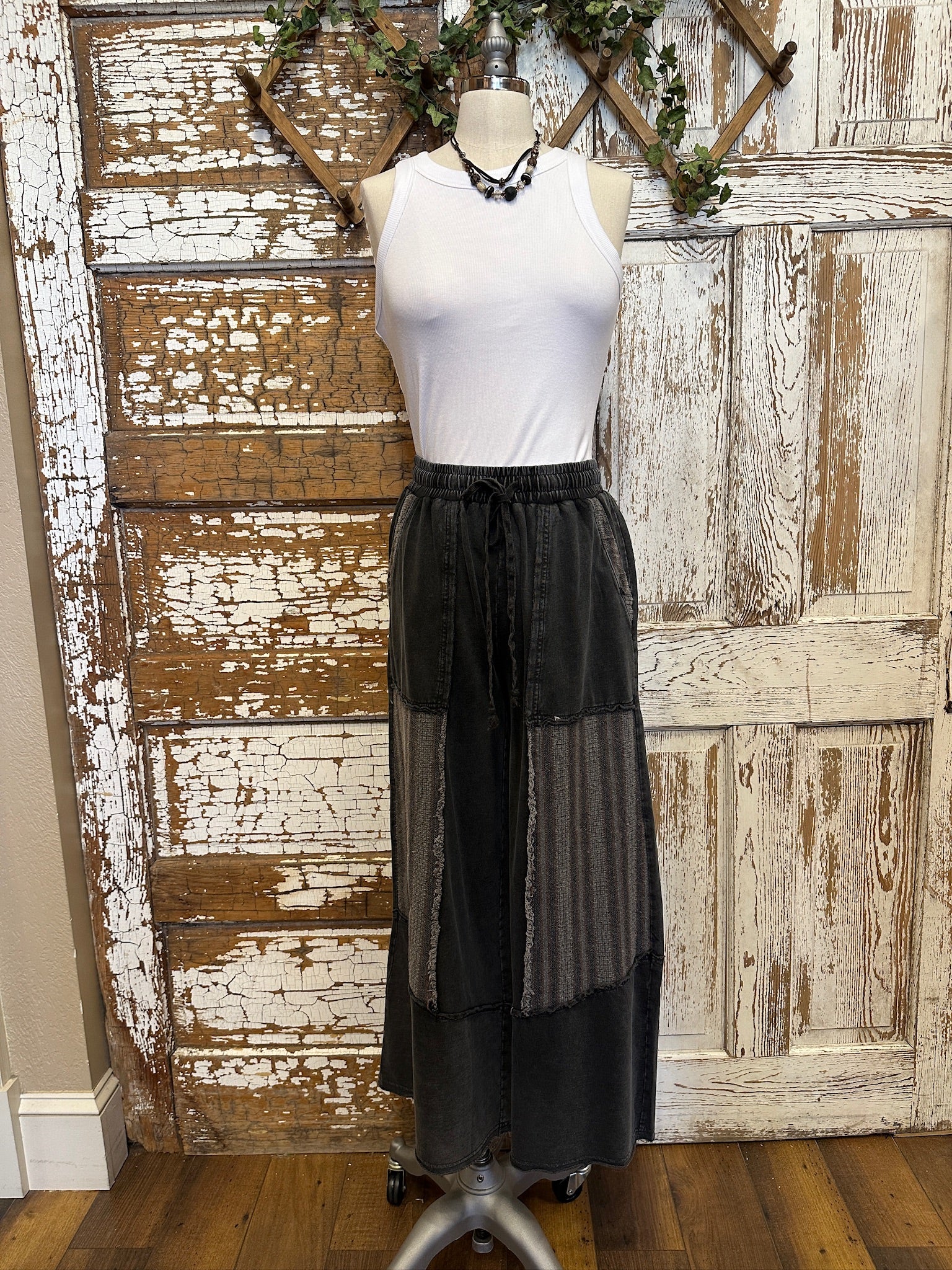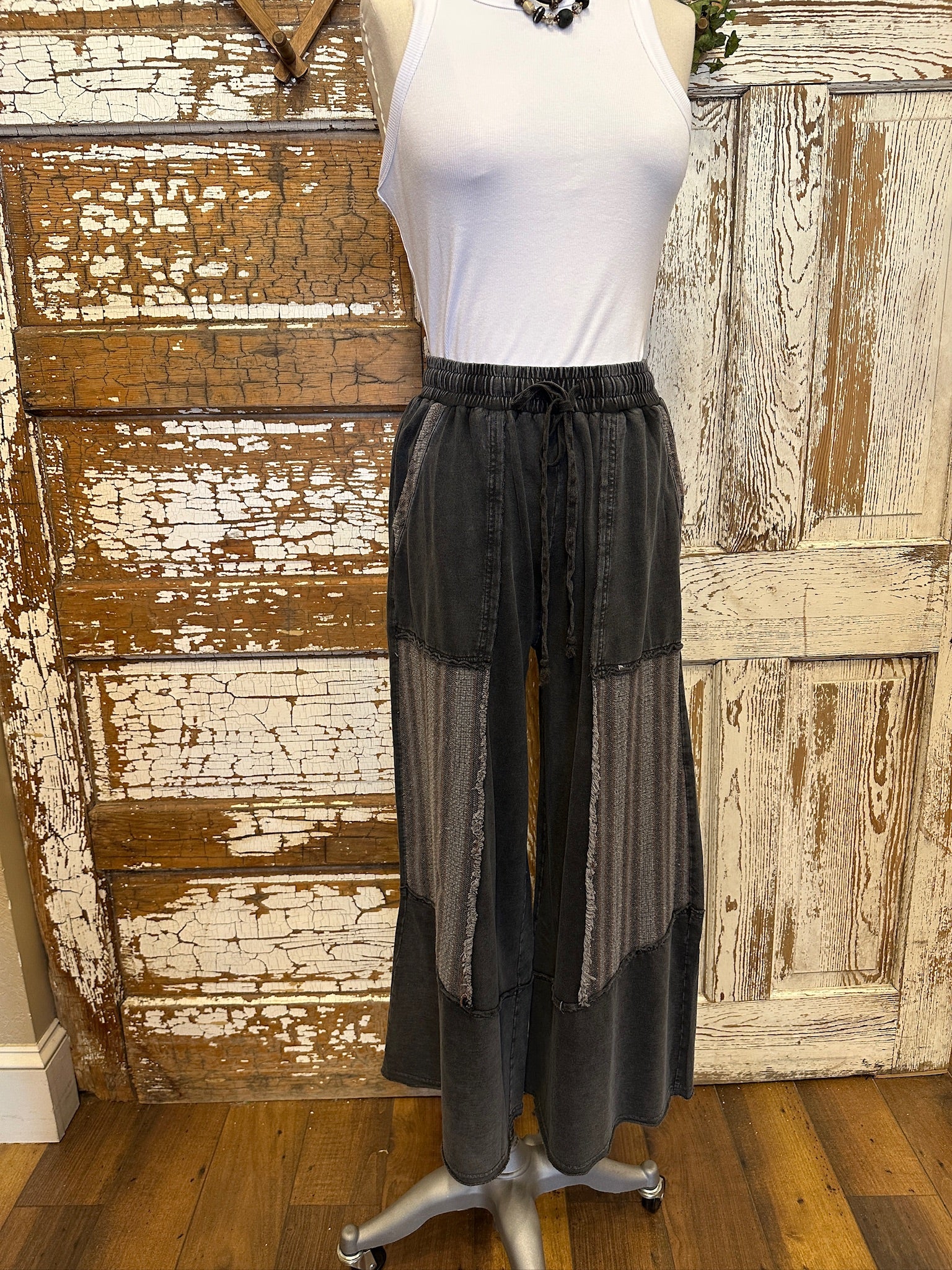 Edgy with a boho twist, the Shadow Patch Pants are all about laid-back comfort with standout style. Designed with an easy pull-on elastic waist and drawstring tie, these wide-leg pants feature unique contrast patch panels with raw seam details for a perfectly lived-in, artsy vibe. The washed black cotton blend gives them a soft, relaxed feel you’ll want to wear every day. A great new Lu Leisure style!