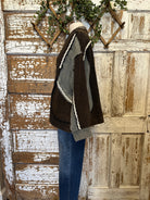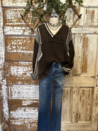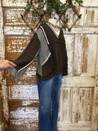 Embrace a unique blend of comfort and style with our Boho Chic Distressed Patchwork V-Neck Knit Top. This one-of-a-kind piece features an effortlessly relaxed fit, perfect for those who love to express their individual style through their wardrobe. It's an ideal choice for creating cozy, layered looks or as a stand-alone statement top for any casual outing. The rich brown waffle knit, combined with intriguing grey panels and delicate distressed white trim, offers a textured appeal that sets it apart.