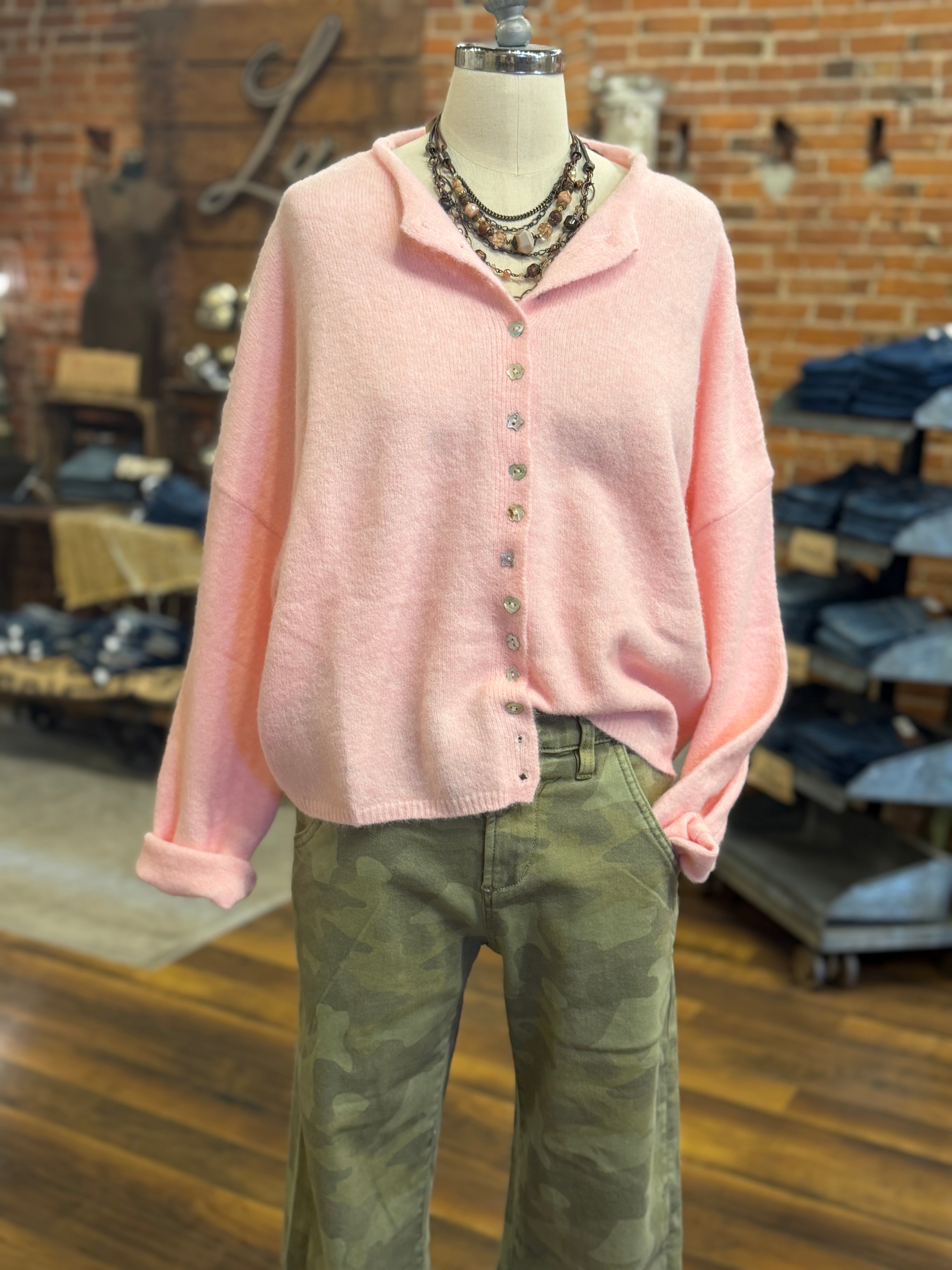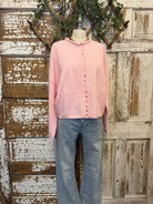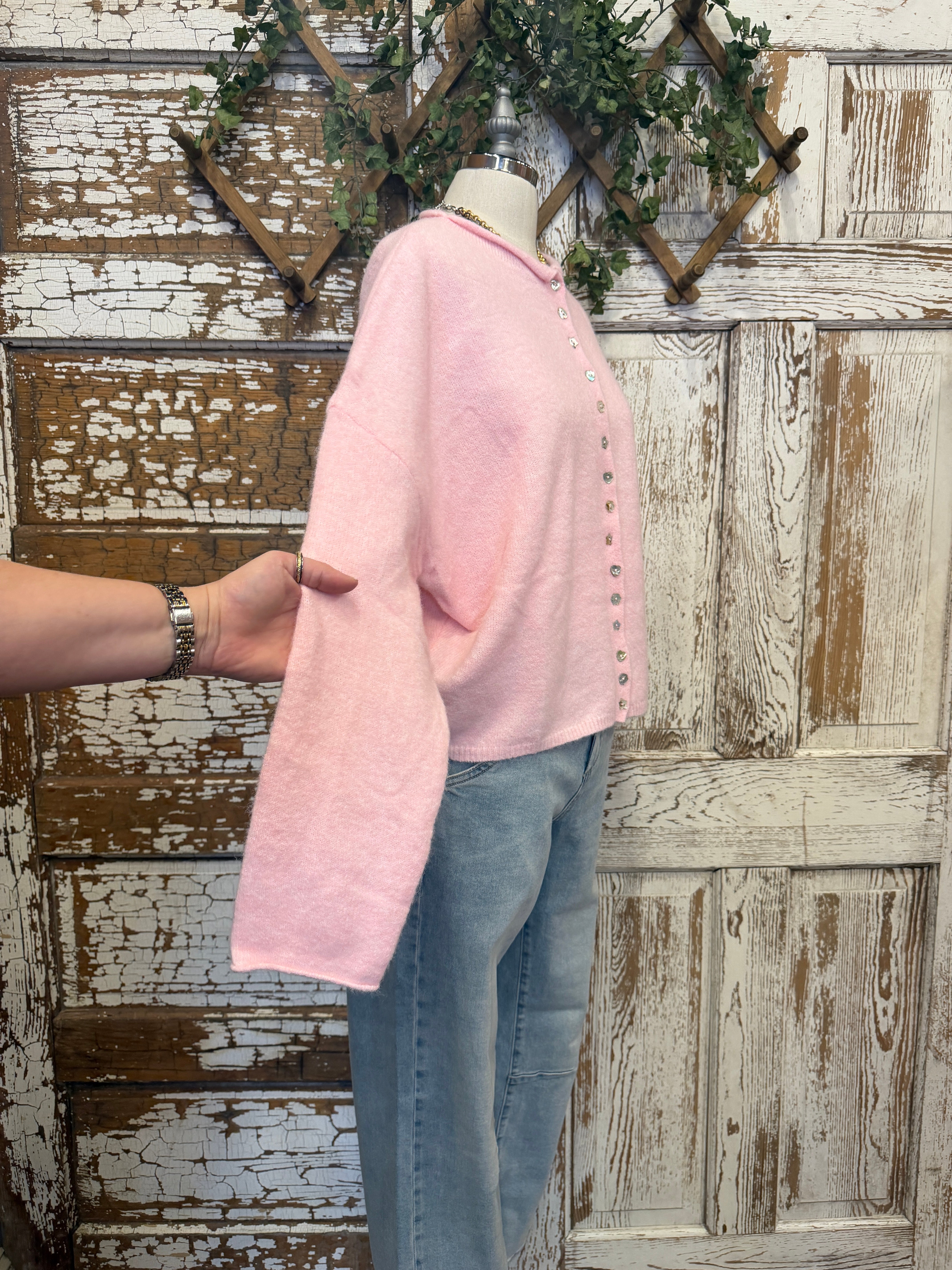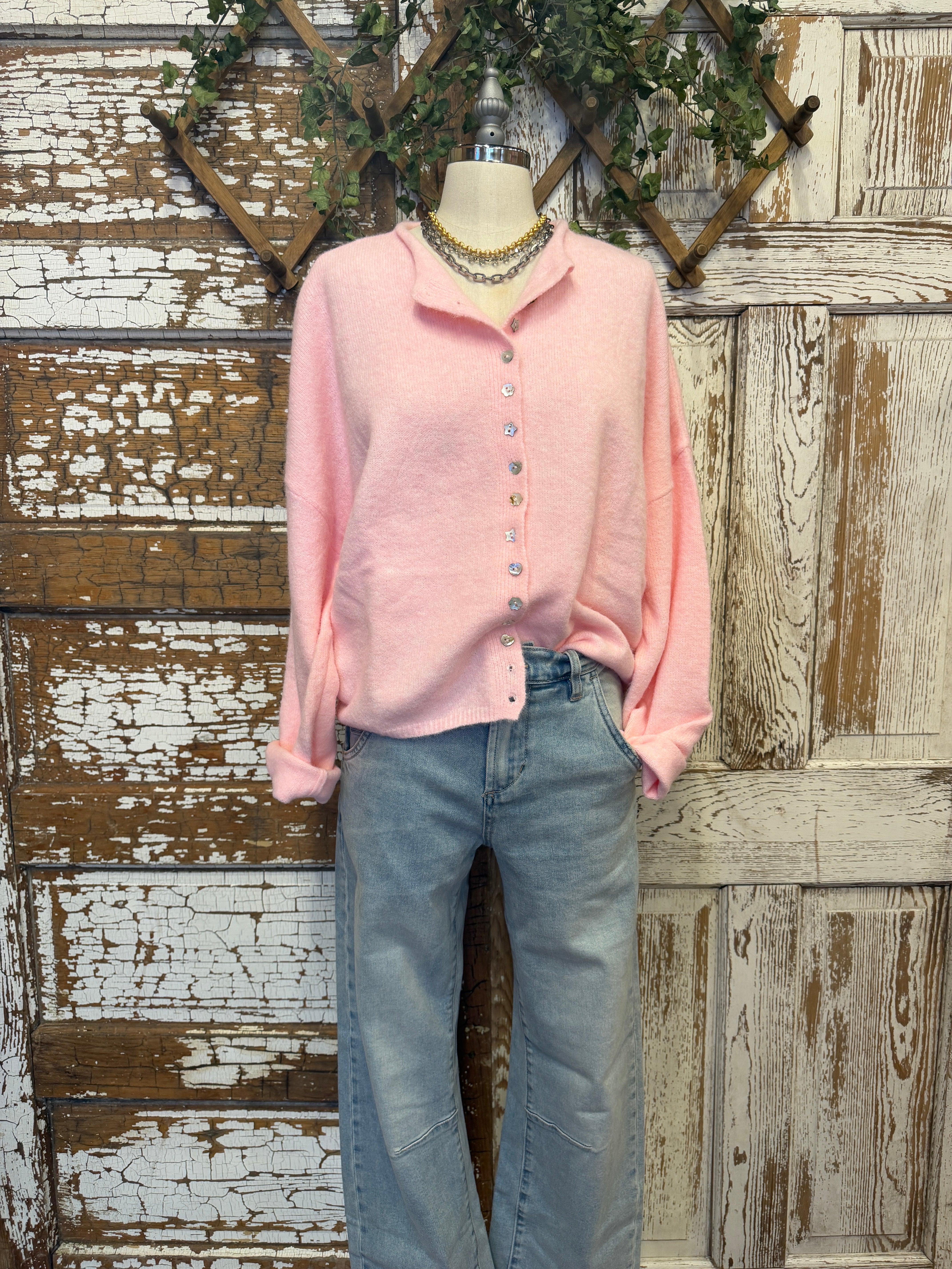 Wrap yourself in the buttery softness of this pale pink cardigan, featuring a playful gallery of unique, mixed-shape iridescent buttons. This high-impact statement piece blends vintage charm with a modern, relaxed silhouette for effortless daily elegance.