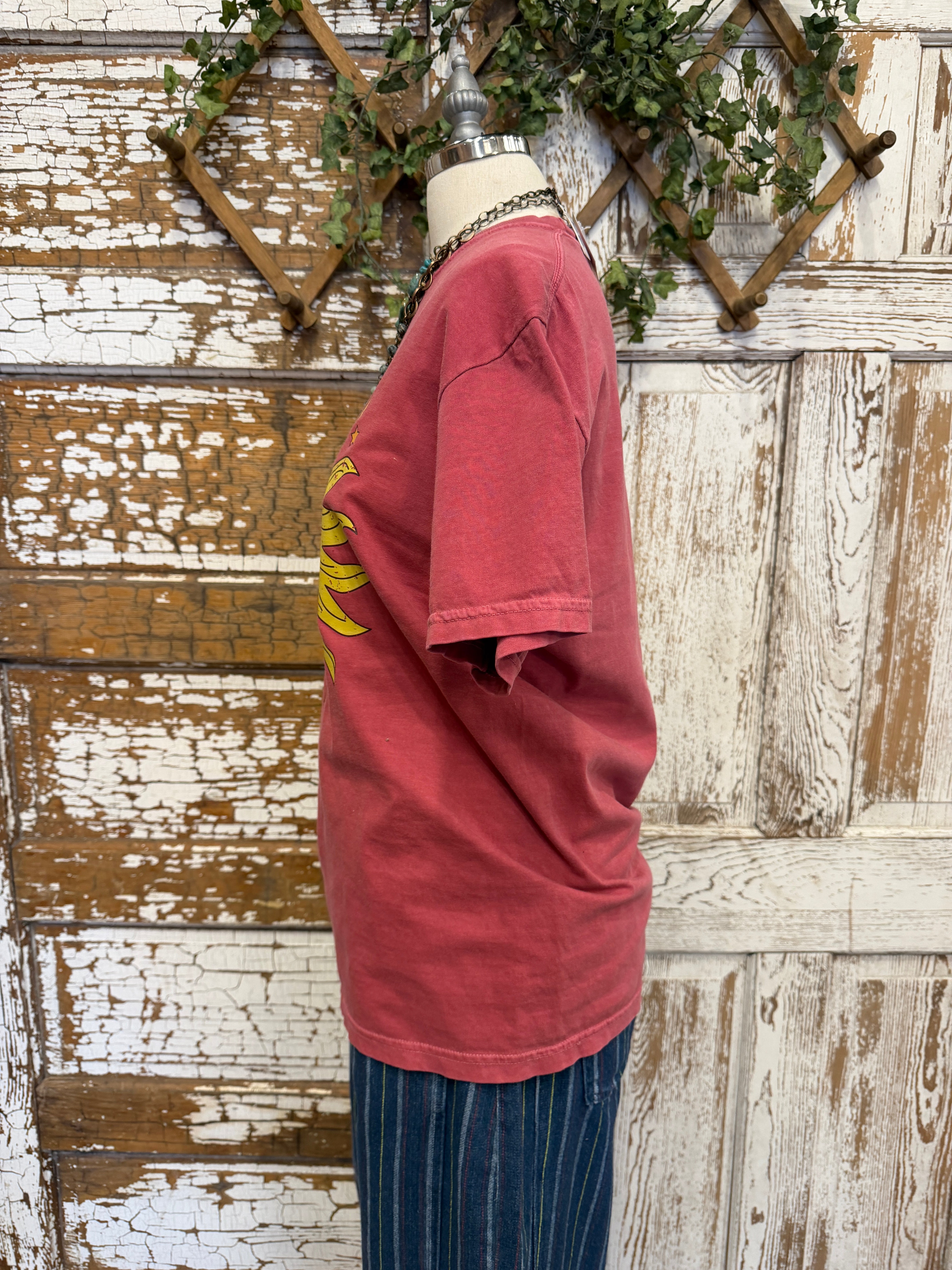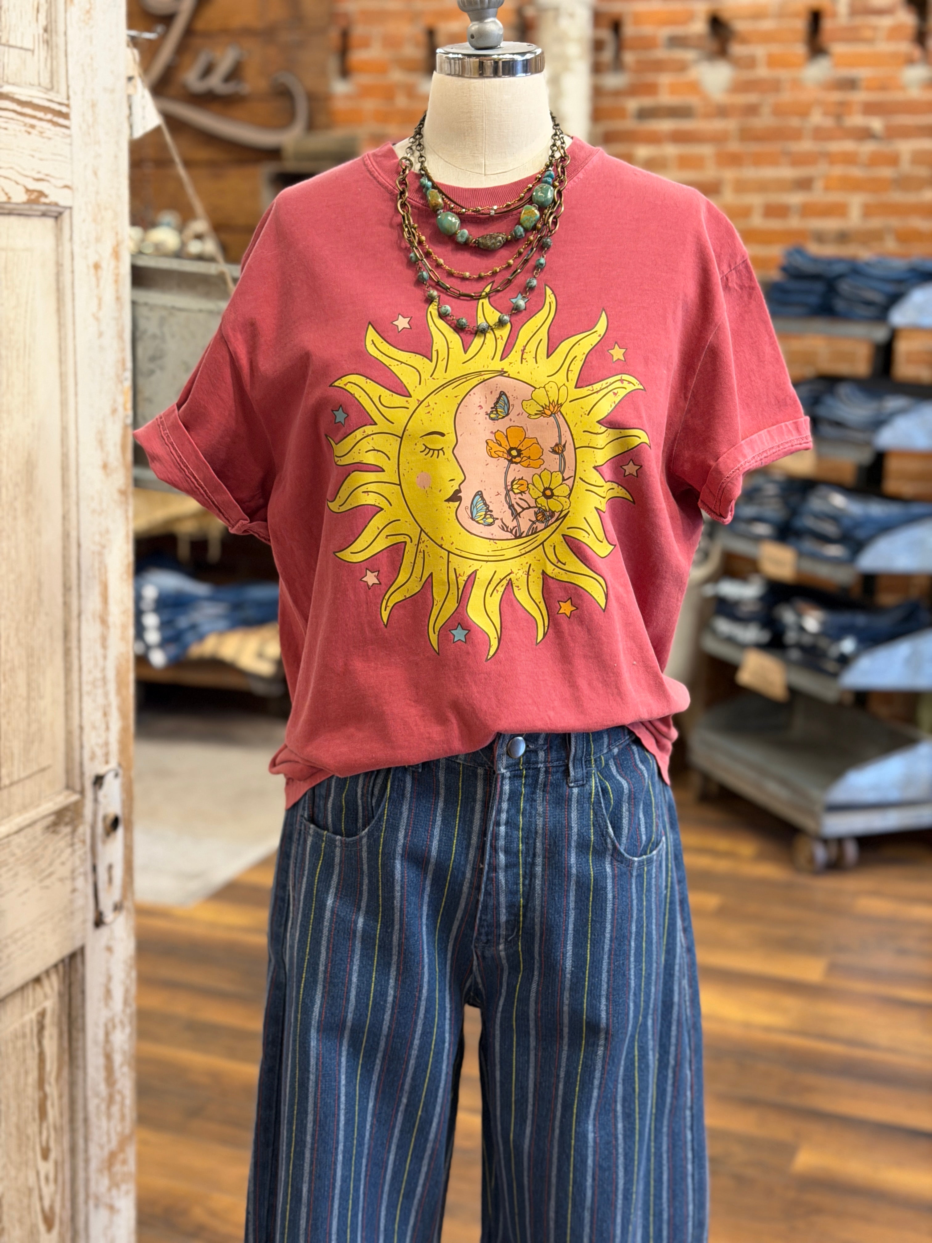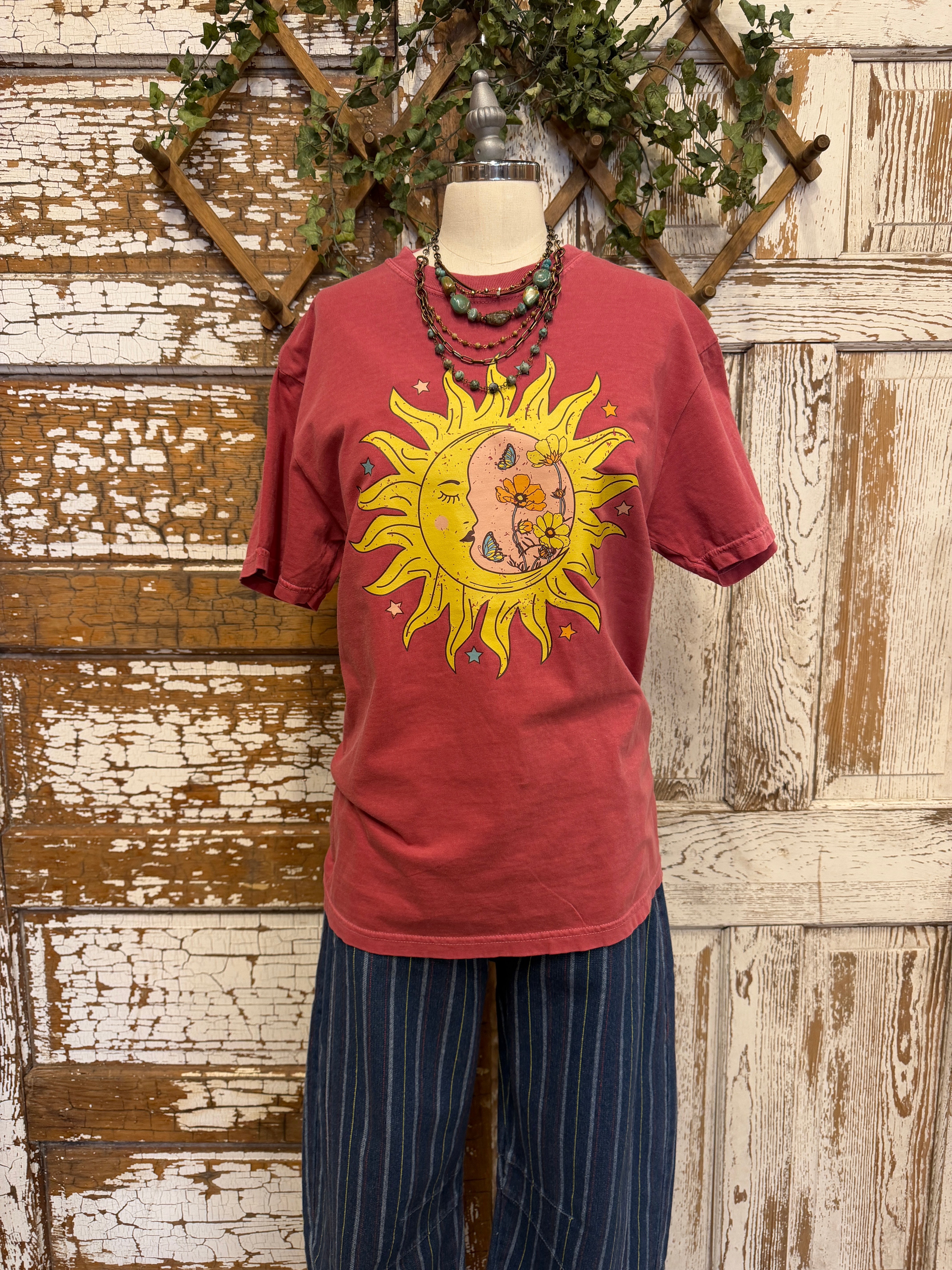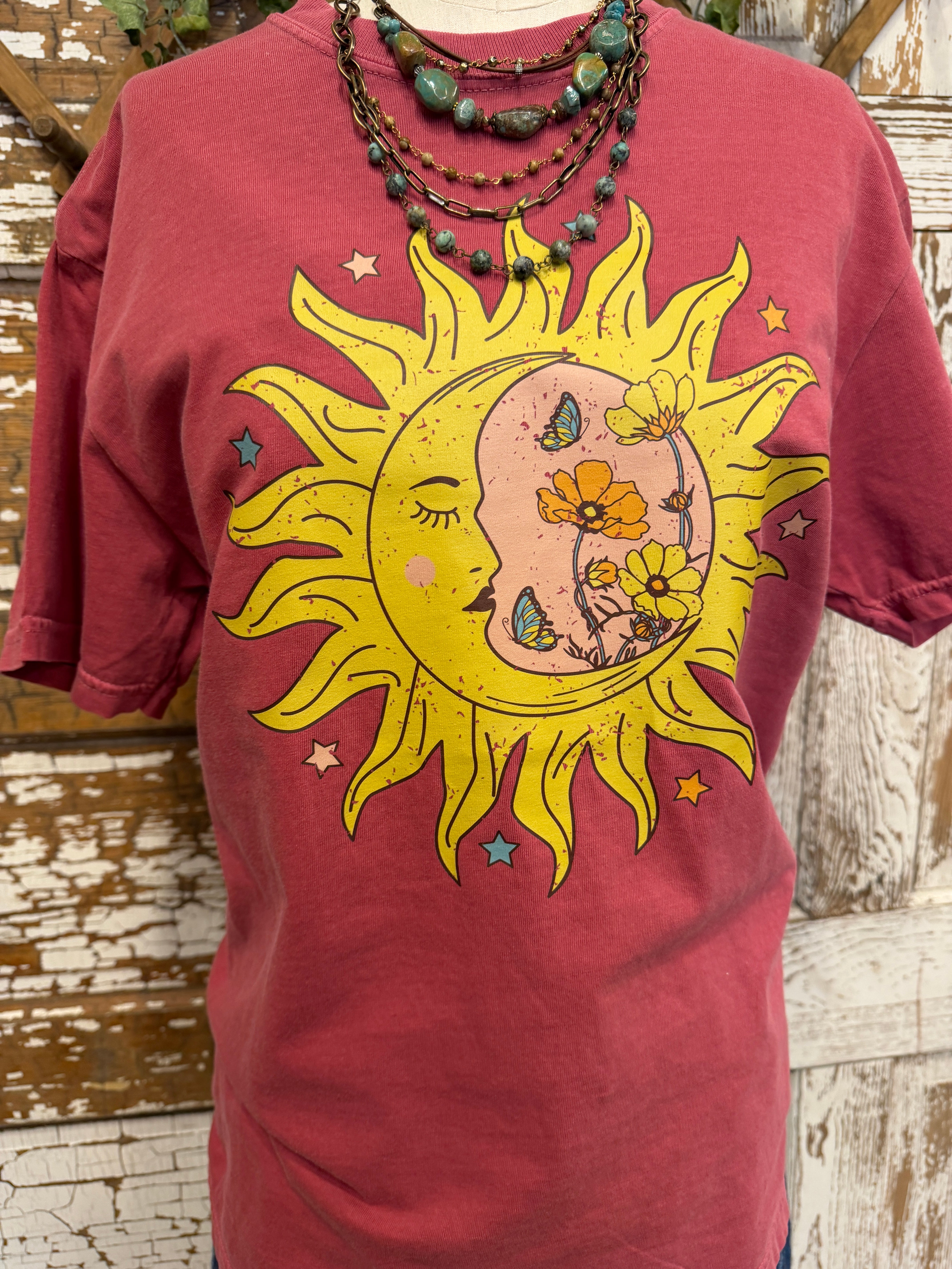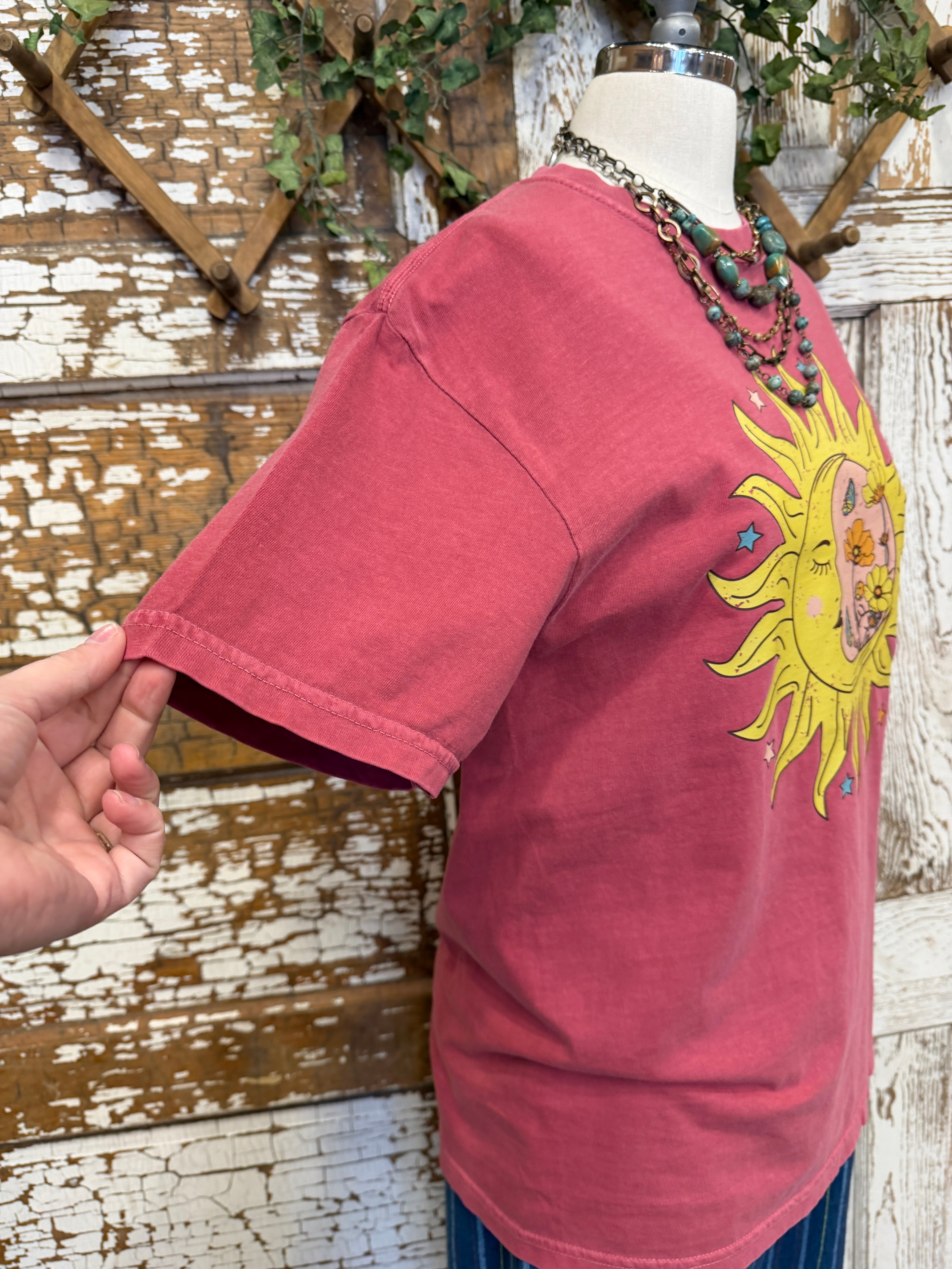 A vintage-inspired graphic tee featuring a dreamy sun and moon design with floral details for a laid-back boho vibe.